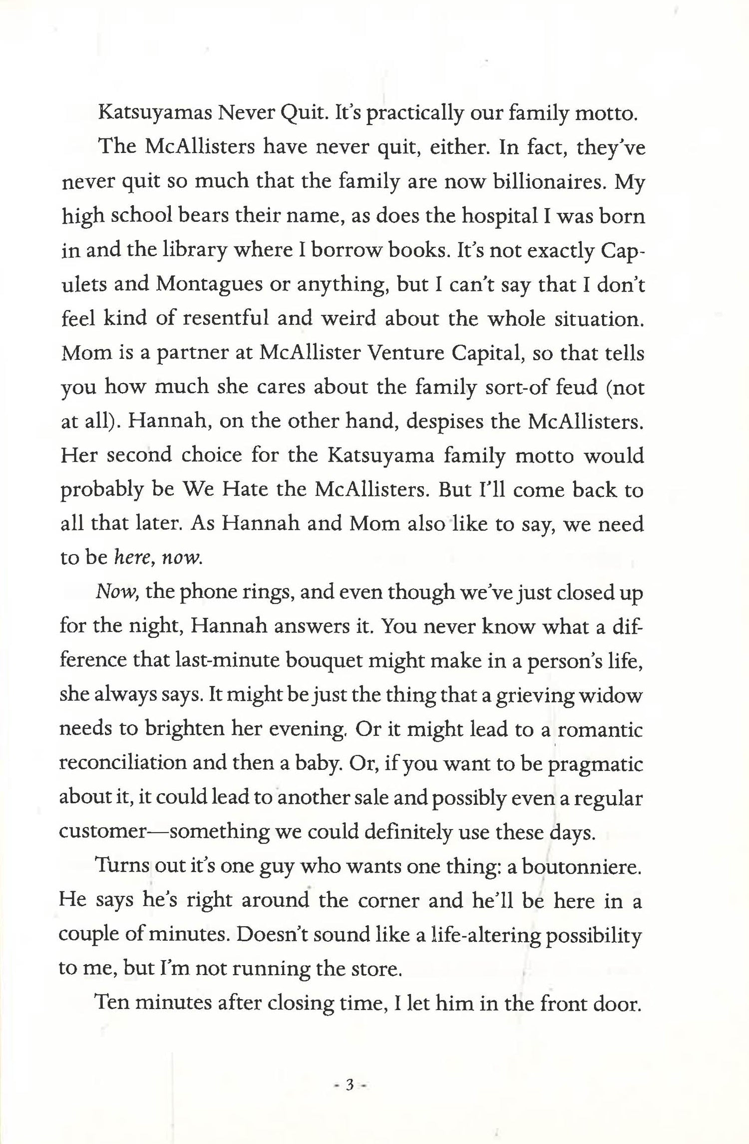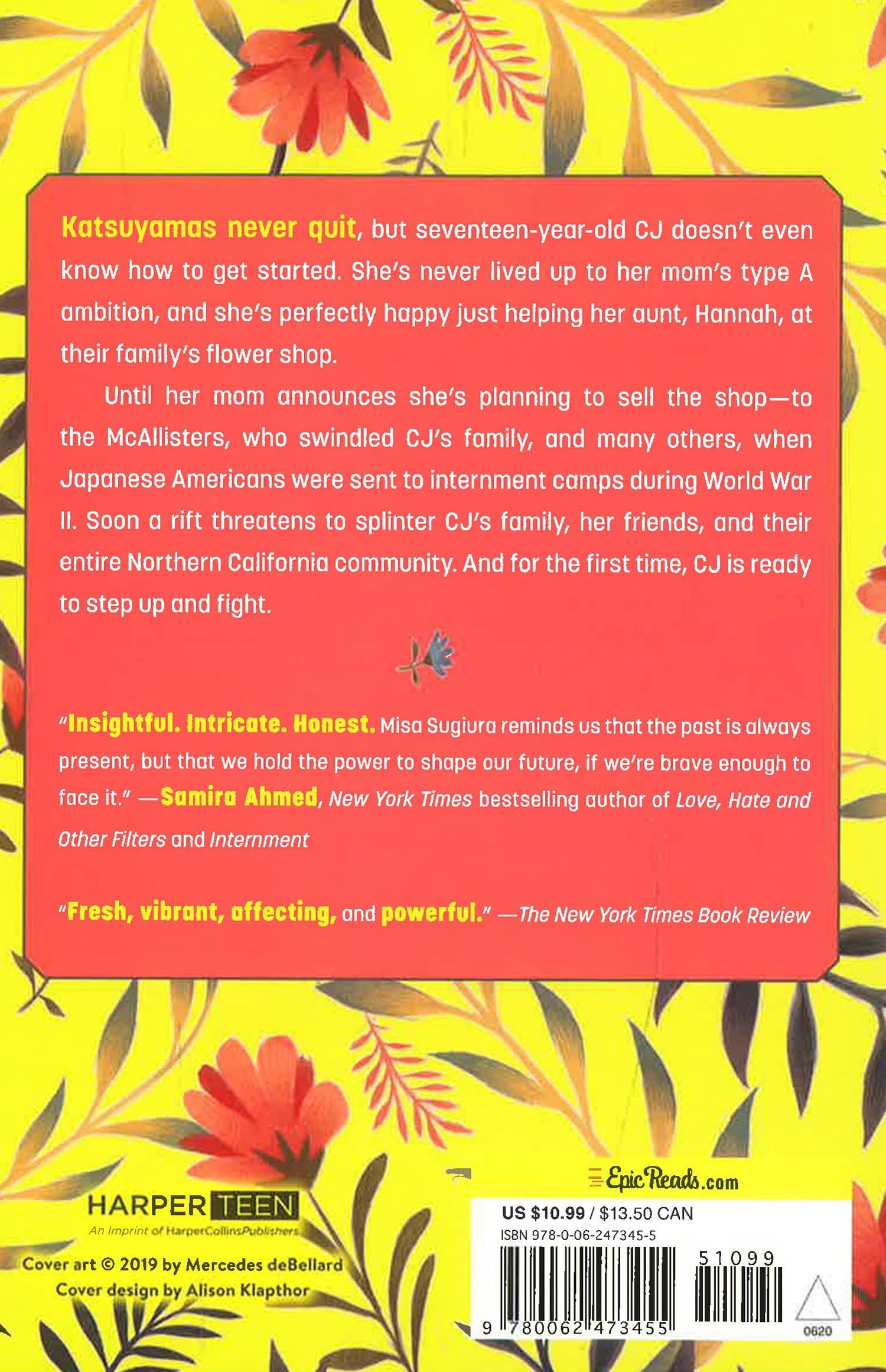 A Kirkus Reviews Best Book * A 2020 YALSA Best Fiction for Young Adults SelectionFor fans of Jenny Han, Morgan Matson, and Sandhya Menon, critically acclaimed author Misa Sugiura delivers a richly crafted contemporary YA novel about family, community, and the importance of writing your own history.The author of the Asian Pacific American Award-winning It's Not Like It's a Secret is back with another smartly drawn coming-of-age novel that weaves riveting family drama, surprising humor, and delightful romance into a story that will draw you in from the very first page.Katsuyamas never quit-but seventeen-year-old CJ doesn't even know where to start. She's never lived up to her mom's type A ambition, and she's perfectly happy just helping her aunt, Hannah, at their family's flower shop.She doesn't buy into Hannah's romantic ideas about flowers and their hidden meanings, but when it comes to arranging the perfect bouquet, CJ discovers a knack she never knew she had. A skill she might even be proud of. Then her mom decides to sell the shop-to the family who swindled CJ's grandparents when thousands of Japanese Americans were sent to internment camps during WWII. Soon a rift threatens to splinter CJ's family, friends, and their entire Northern California community; and for the first time, CJ has found something she wants to fight for.
