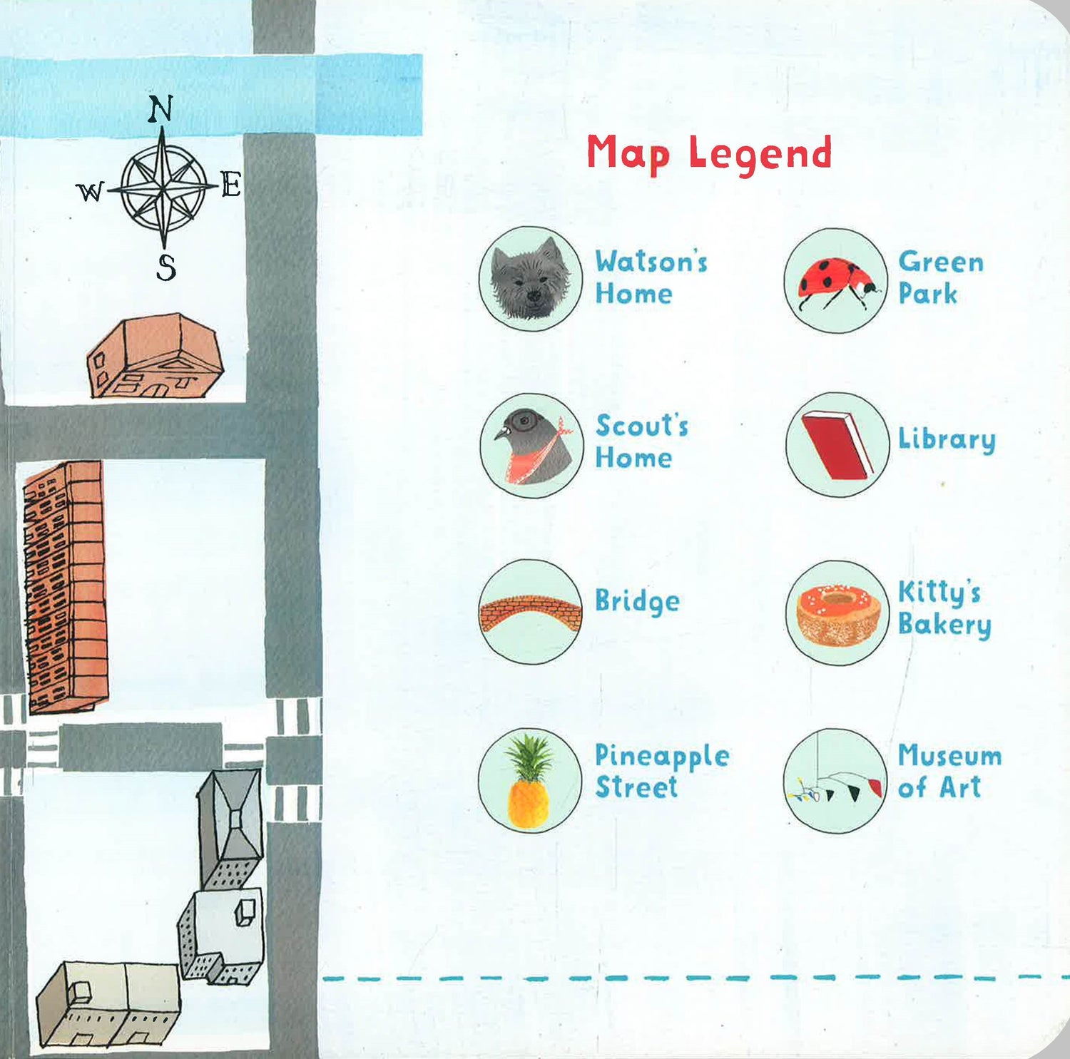 Claudia Pearsons winsome illustrations will draw children and adults into a colorful, breezy day of finding ones way. . . narrated with a clever twist. Watson is a terrier, and his friend Scout is a pigeon. This charming oversized board book will be the go-to book to teach youngsters important skills like directions and reading a map.
