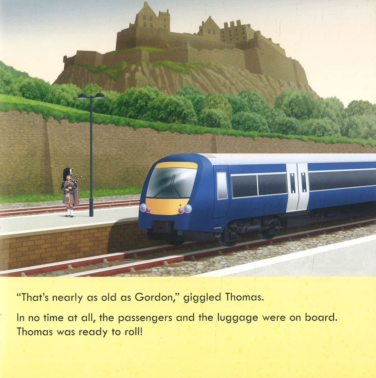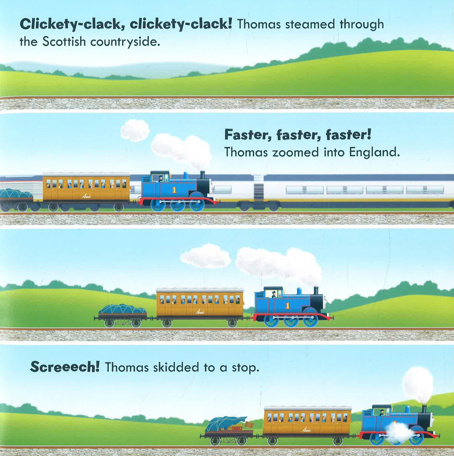 Join the little blue engine as he travels around the country visiting favourite holiday destinations in this delightful new picture book.
