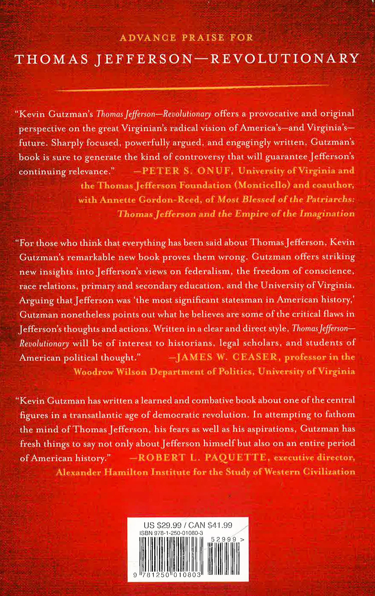 Though remembered chiefly as author of the Declaration of Independence and the president under whom the Louisiana Purchase was effected, Thomas Jefferson was a true revolutionary in the way he thought about the size and reach of government, which Americans who were full citizens and the role of education in the new country. In his new book, Kevin Gutzman gives readers a new view of Jefferson - a revolutionary who effected radical change in a growing country.Jefferson?s philosophy about the size and power of the federal system almost completely undergirded the Jeffersonian Republican Party. His forceful advocacy of religious freedom was not far behind, as were attempts to incorporate Native Americans into American society. His establishment of the University of Virginia might be one of the most important markers of the man?s abilities and character.He was not without flaws. While he argued for the assimilation of Native Americans into society, he did not assume the same for Africans being held in slavery while - at the same time - insisting that slavery should cease to exist. Many still accuse Jefferson of hypocrisy on the ground that he both held that ?all men are created equal? and held men as slaves. Jefferson?s true character, though, is more complex than that as Kevin Gutzman shows in his new book about Jefferson, a revolutionary whose accomplishments went far beyond the drafting of the Declaration of Independence.