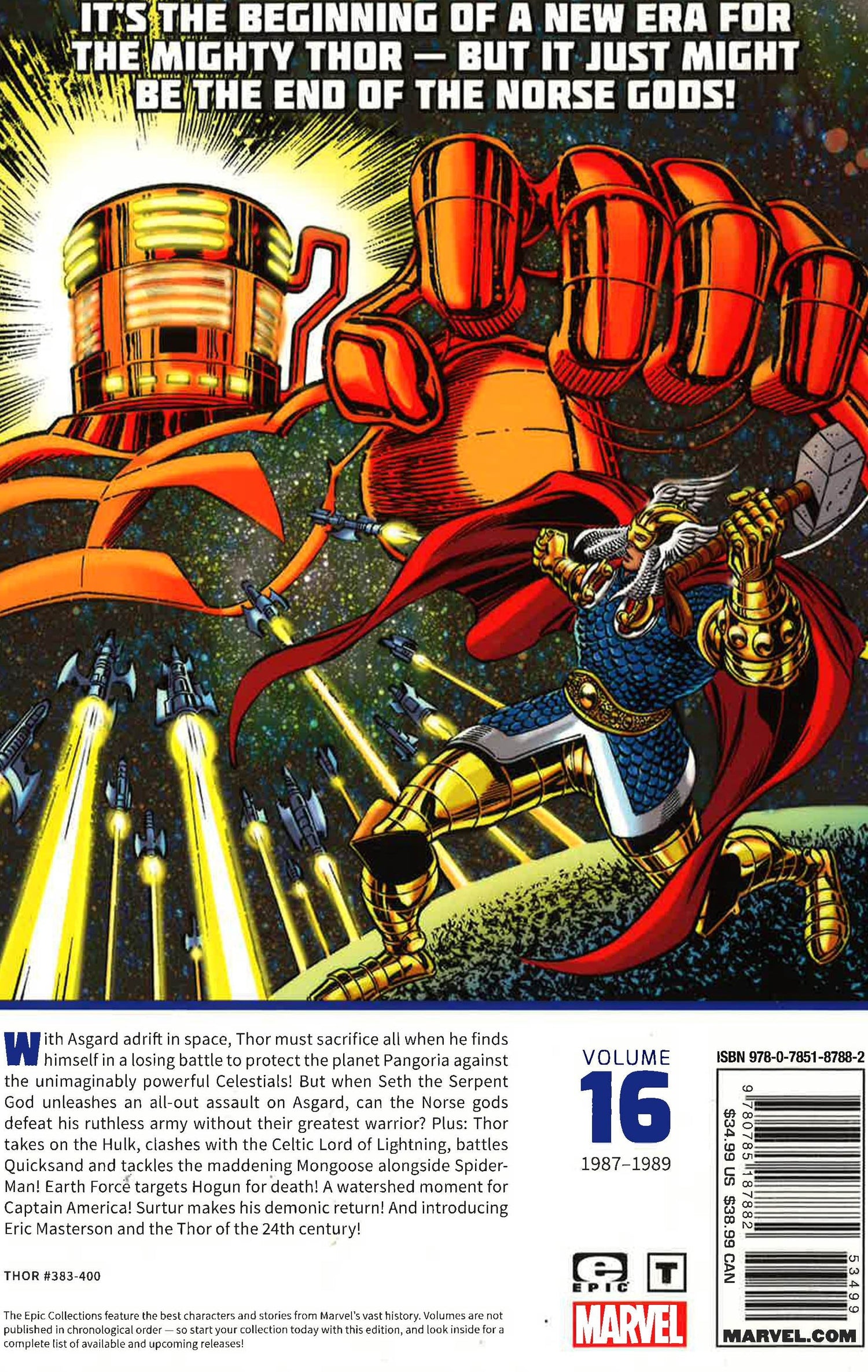 It's the beginning of a new era for the mighty Thor - but it just might be the end of the Norse gods! With Asgard adrift in space, Thor must sacrifice all when he finds himself in a losing battle to protect the planet Pangoria against the unimaginably powerful Celestials! But when Seth the Serpent God unleashes an all-out assault on Asgard, can the Norse gods defeat his ruthless army without their greatest warrior? Plus: Thor takes on the Hulk, clashes with the Celtic Lord of Lightning, battles Quicksand, and tackles the maddening Mongoose alongside Spider-Man! Earth Force targets Hogun for death! A watershed moment for Captain America! Surtur makes his demonic return! COLLECTING: Thor (1966) 383-400