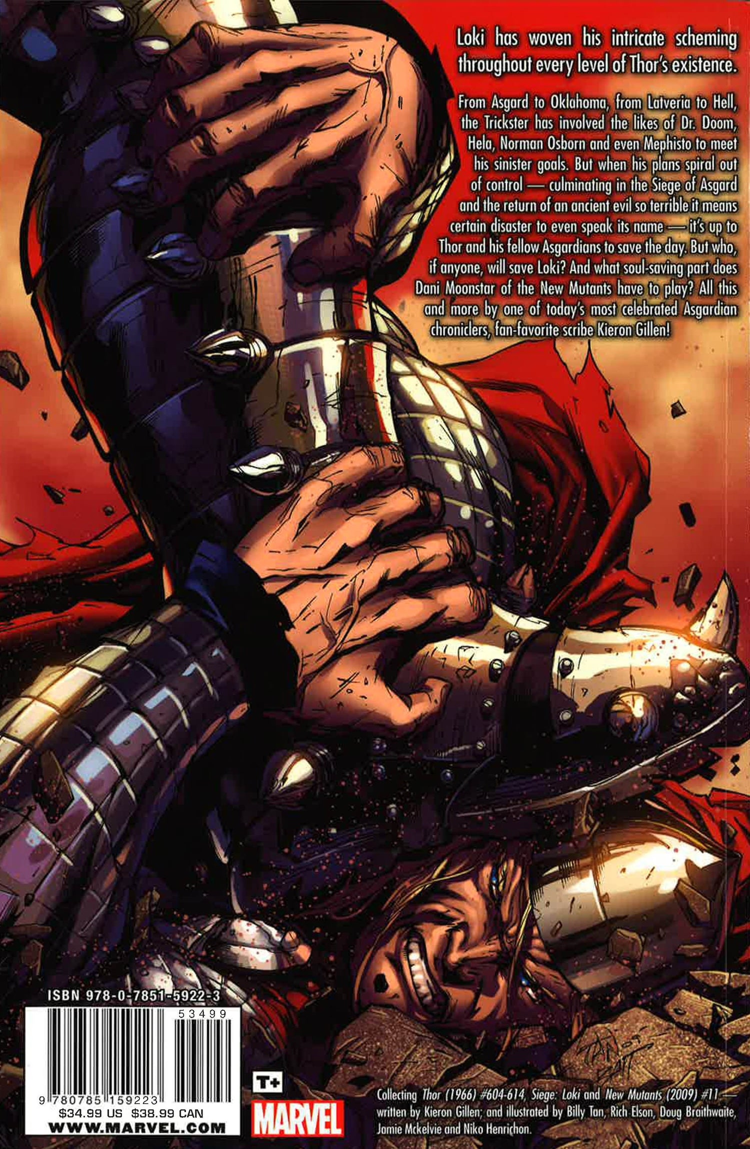 Loki has woven his intricate scheming throughout every level of Thor's existence. From Asgard to Oklahoma, from Latveria to Hell, the Trickster has involved the likes of Dr. Doom, Hela, Norman Osborn and even Mephisto to meet his sinister goals. But when his plans spiral out of control - culminating in the Siege of Asgard and the return of an ancient evil so terrible it means certain disaster to even speak its name - it's up to Thor and his fellow Asgardians to save the day. But who, if anyone, will save Loki? And what soul-saving part does Dani Moonstar of the New Mutants have to play? All this and more by one of today's most celebrated Asgardian chroniclers, fan-favorite scribe Kieron Gillen! Collecting THOR (1966) #604-614, SIEGE: LOKI and NEW MUTANTS (2009) #11.
