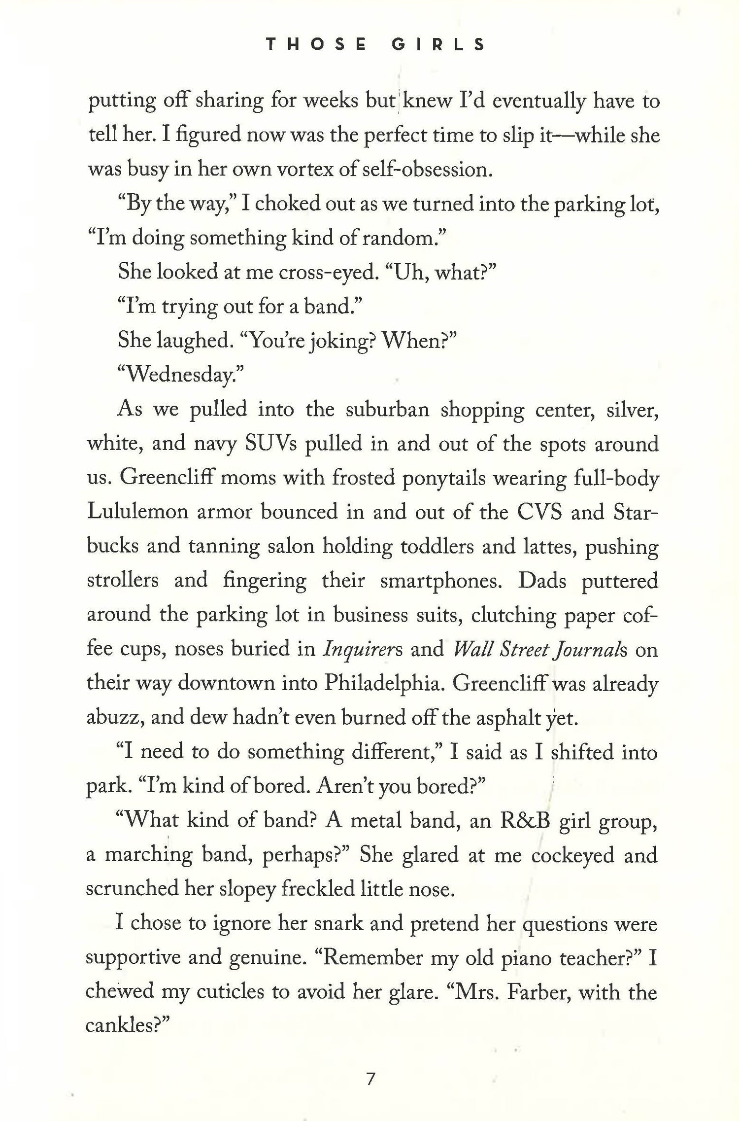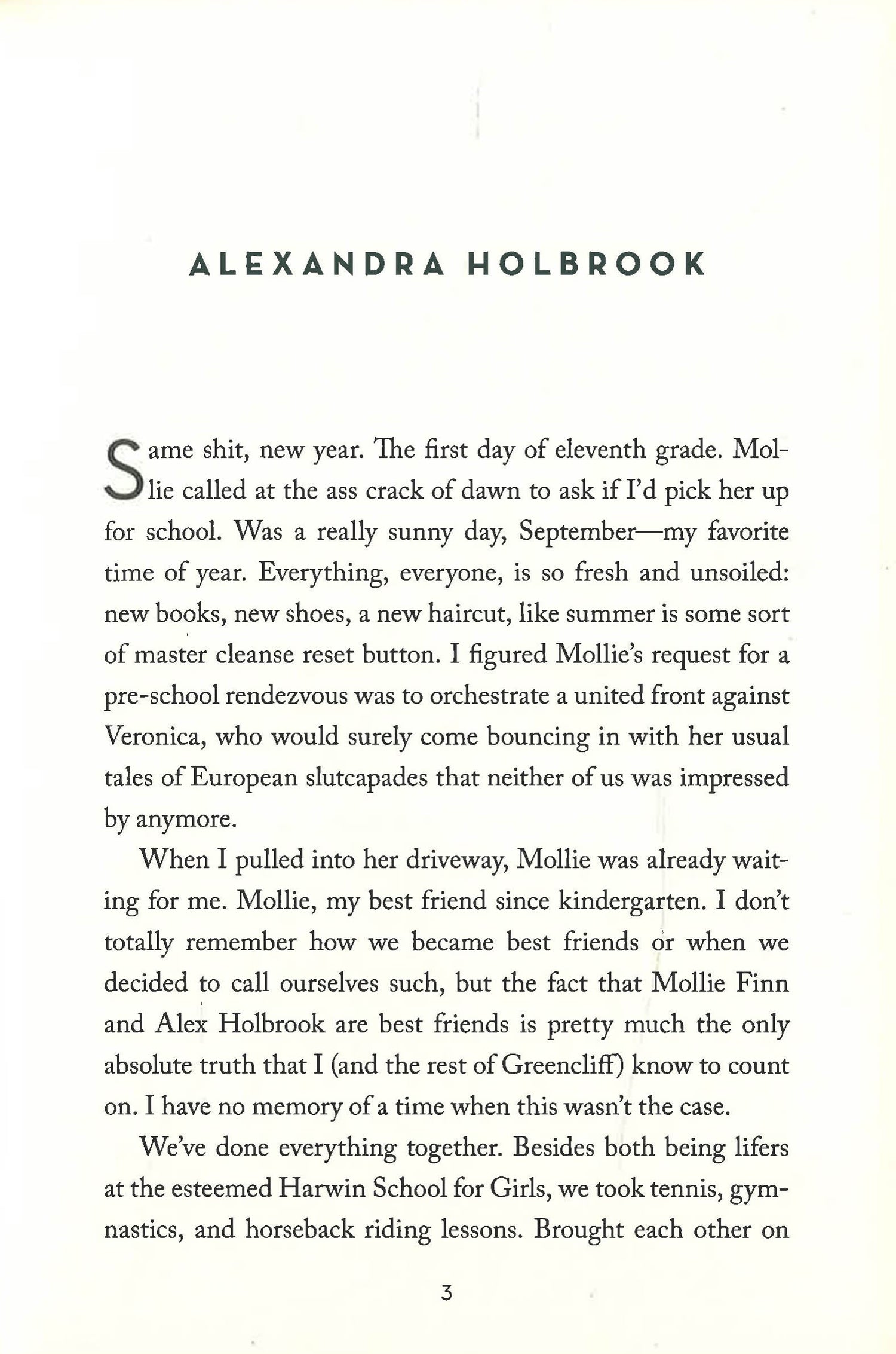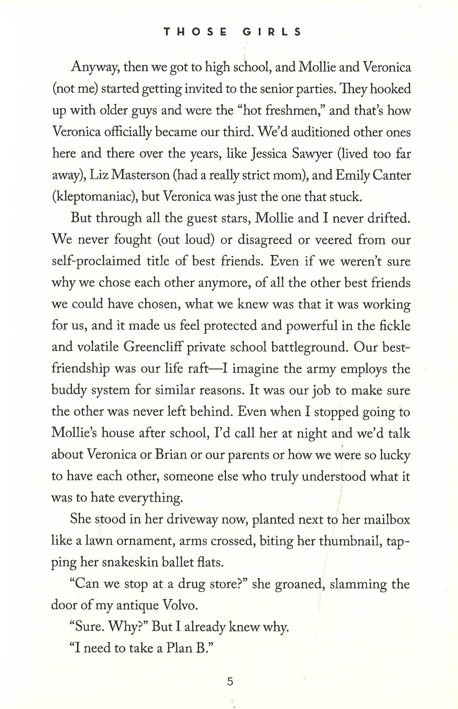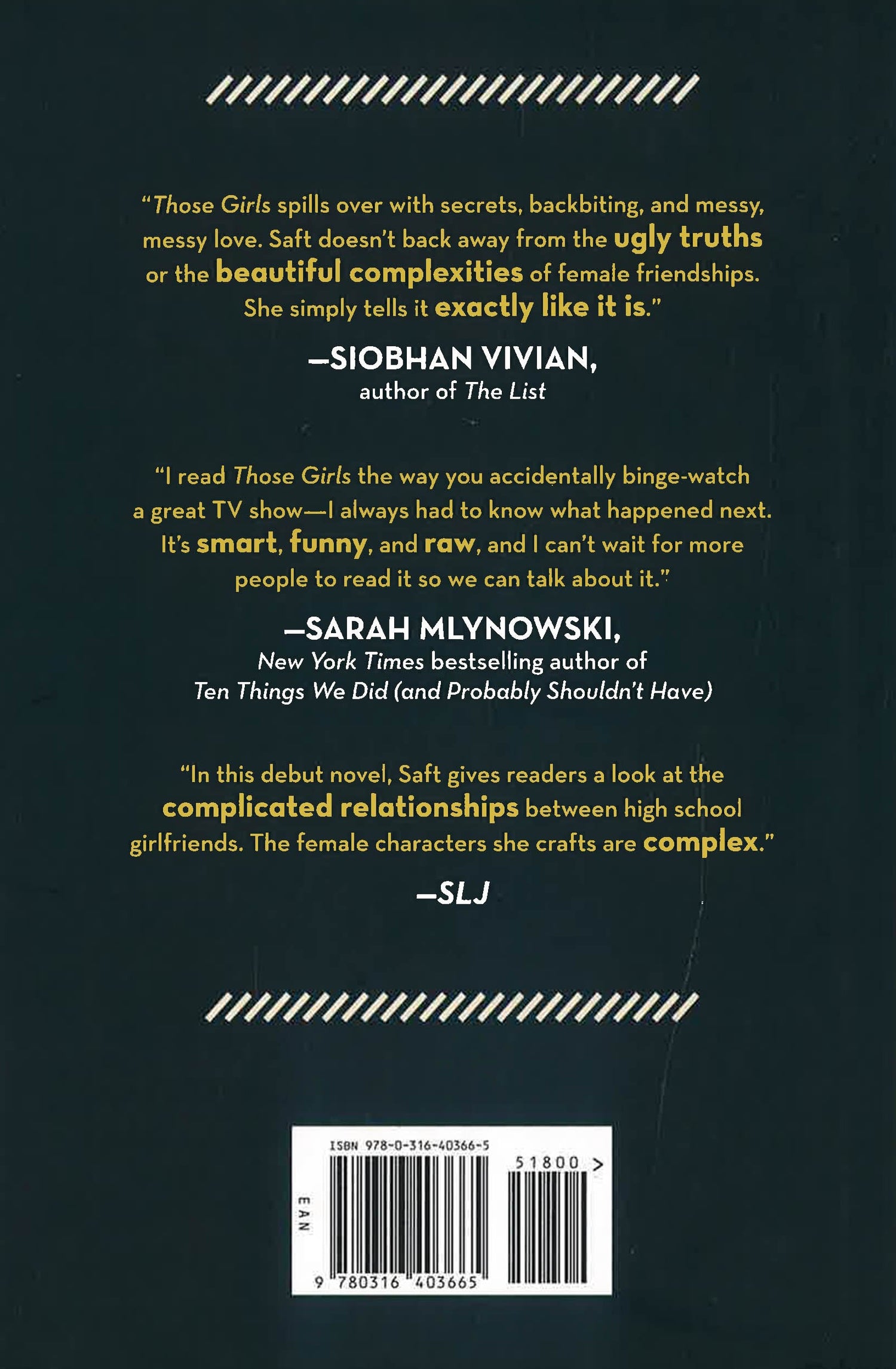 Some girls will always have your back, and some girls can't help but stab you in it. Junior year, the suburbs of Philadelphia. Alex, Mollie and Veronica are those girls: They're the best of friends and the party girls of the school. But how well does everybody know them--and really, how well do they know one another? Alex is secretly in love with the boy next door and has joined a band--without telling anyone. Mollie suffers from a popular (and possibly sociopathic) boyfriend and a serious mean streak. And Veronica just wants to be loved--literally, figuratively, physically...she's not particular. Will this be the year that bonds them forever or tears them apart for good? In a debut novel that is raw, honest, hilarious, and thought-provoking, Lauren Saft masterfully conveys what goes on in the mind of a teenage girl and how often even the closest of friends walk the thin line between love and hate.