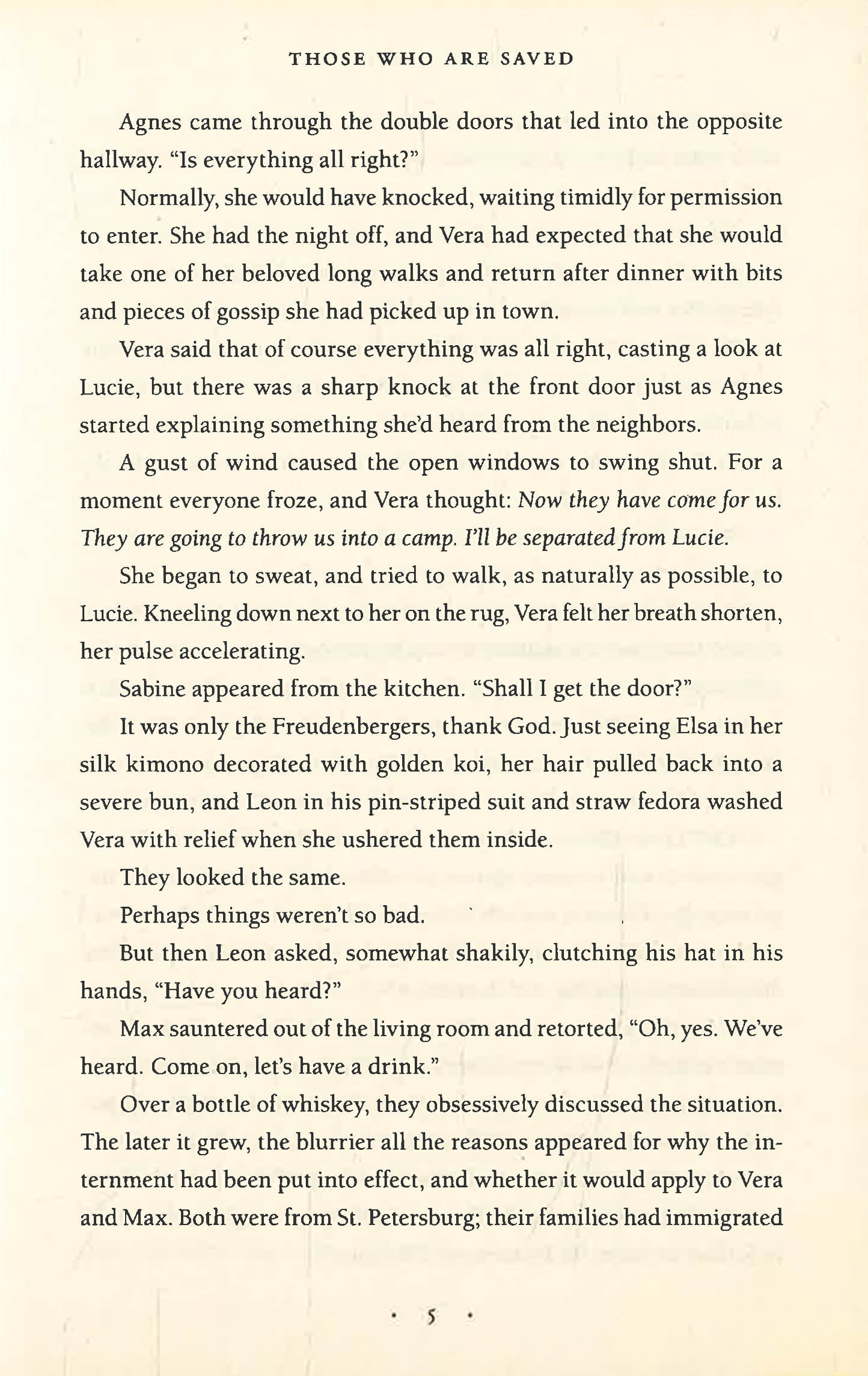 After receiving notice that all foreigners must report to an internment camp, Vera must decide: does she subject Lucie to the horrid conditions of the camp, or put Lucie into hiding with her beloved and trusted governess, safe until Vera can retrieve her? Surely the war will end soon...