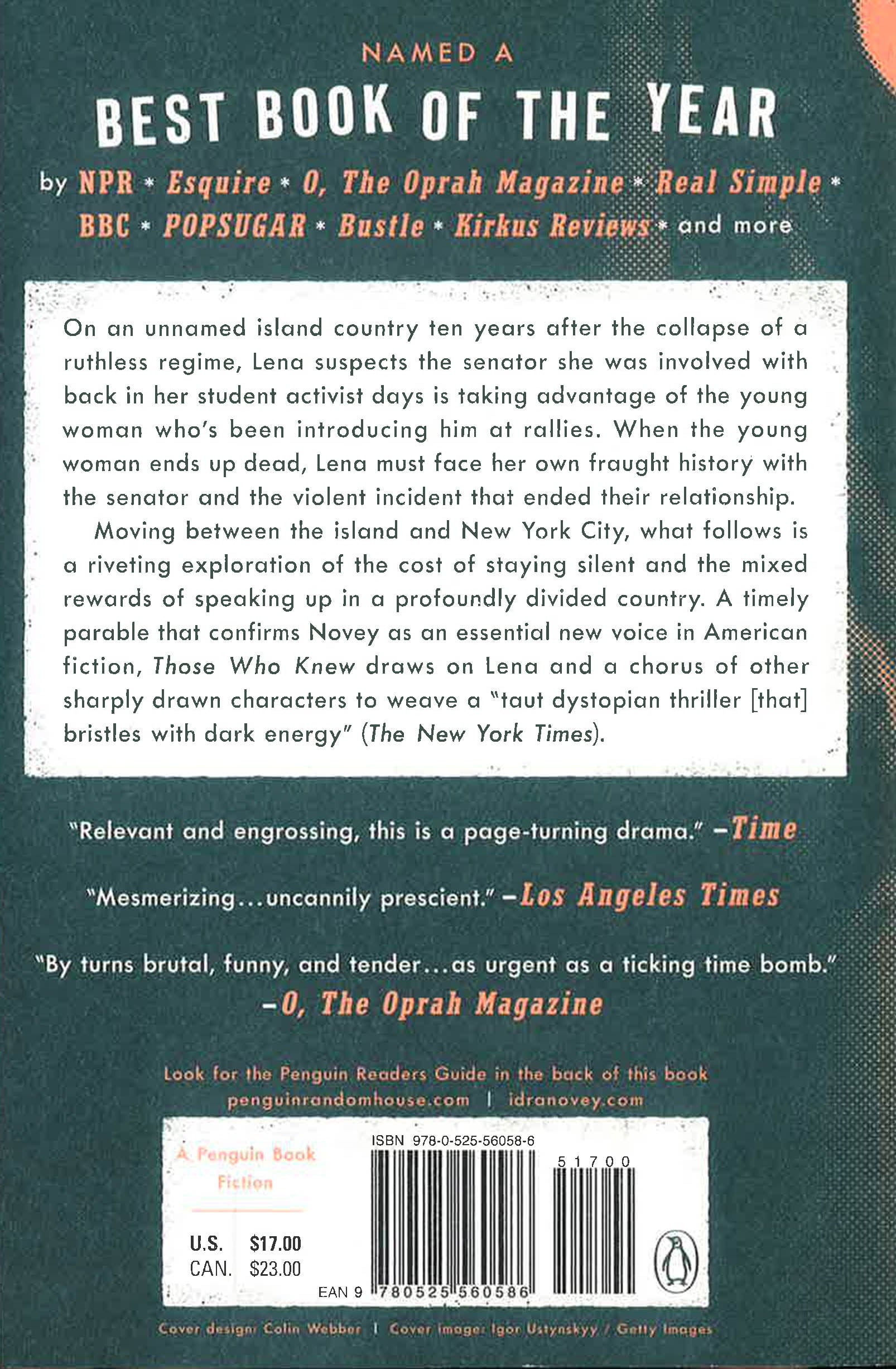 What follows is a riveting exploration of the cost of staying silent and the mixed rewards of speaking up in a profoundly divided country. Those Who Knew confirms Novey's place as an essential new voice in American fiction.