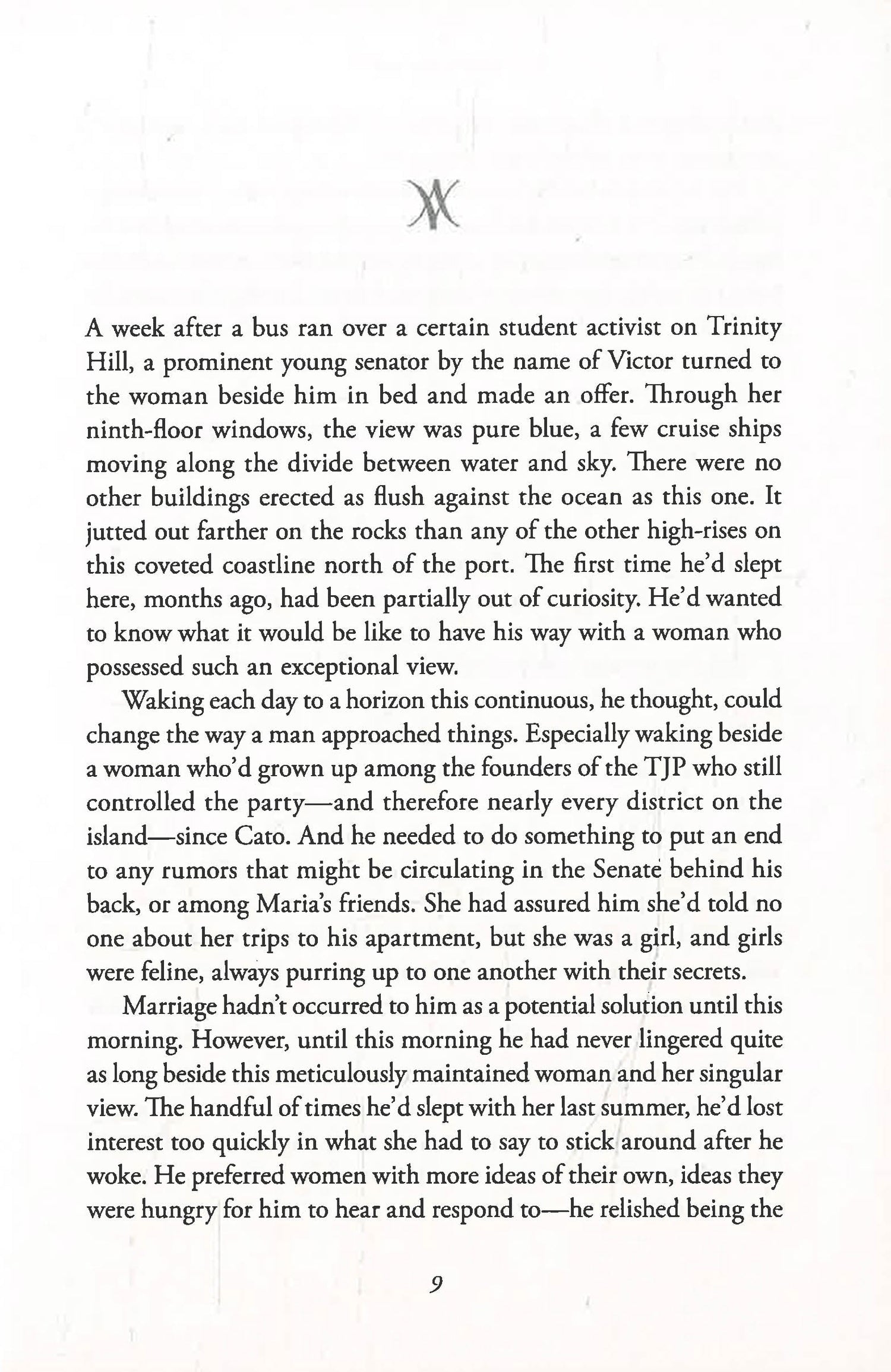 On an unnamed island country ten years after the collapse of a U.S.-supported regime, Lena suspects the powerful senator she was involved with back in her student activist days is taking advantage of a young woman who's been introducing him at rallies. When the young woman ends up dead, Lena revisits her own fraught history with the senator and the violent incident that ended their relationship.