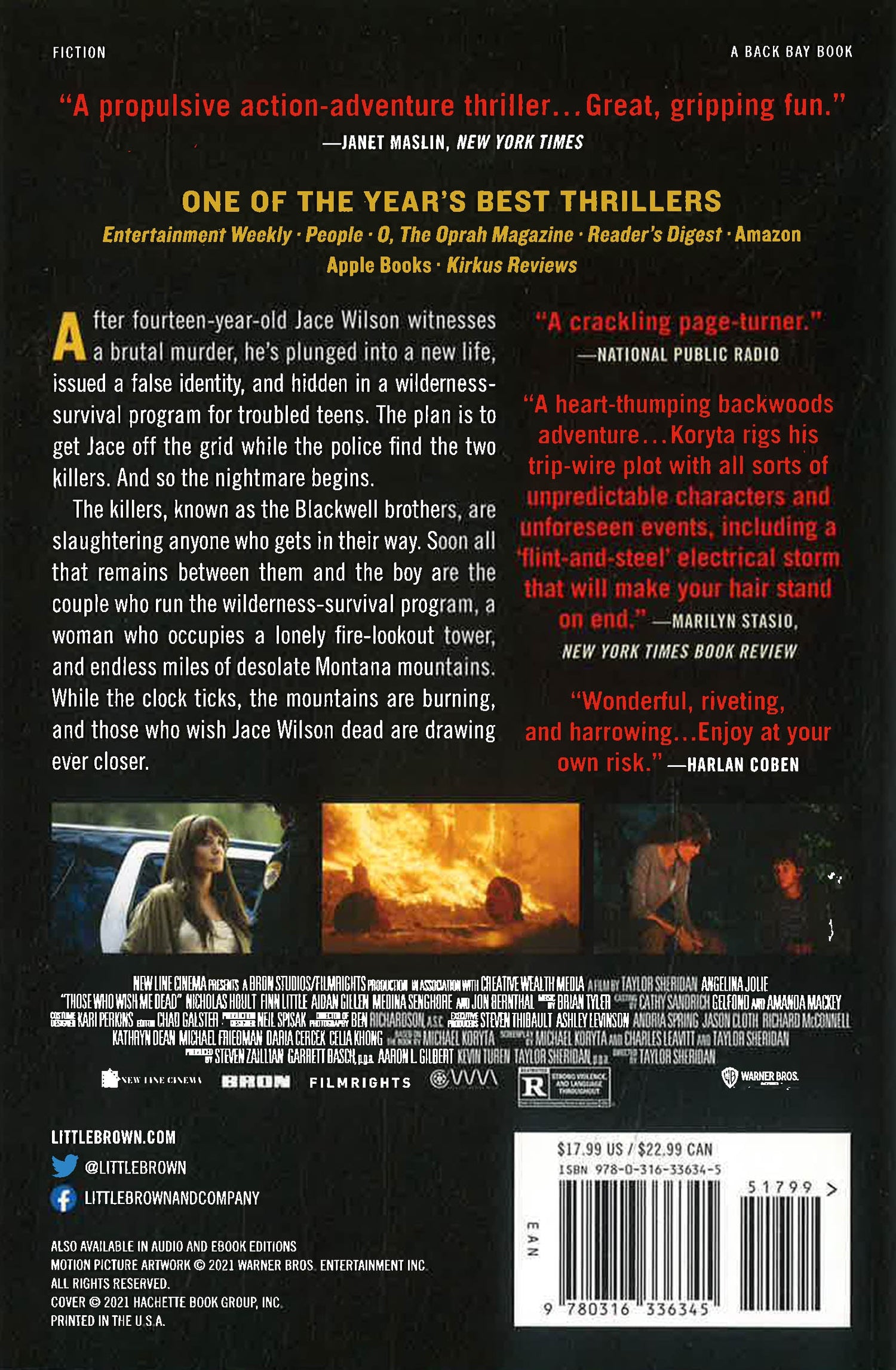 The result is the start of a nightmare. The killers, known as the Blackwell Brothers, are slaughtering anyone who gets in their way in a methodical quest to reach him. Now all that remains between them and the boy are Ethan and Allison Serbin, who run the wilderness survival program; Hannah Faber, who occupies a lonely fire lookout tower; and endless miles of desolate Montana mountains. The clock is ticking, the mountains are burning, and those who wish Jace Wilson dead are no longer far behind.
