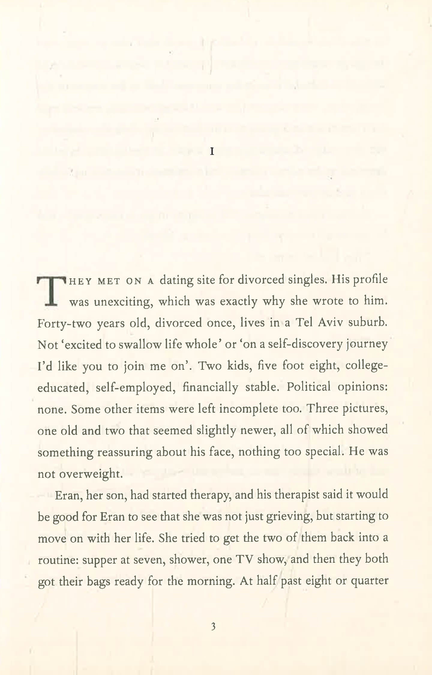 Three tells the stories of three women: Orna, a divorced single-mother looking for a new relationship; Emilia, a Latvian immigrant on a spiritual search; and Ella, married and mother of three, returning to University to write her thesis. All of them will meet the same man. His name is Gil. He won''t tell them the whole truth about himself - but they don''t tell him everything either.