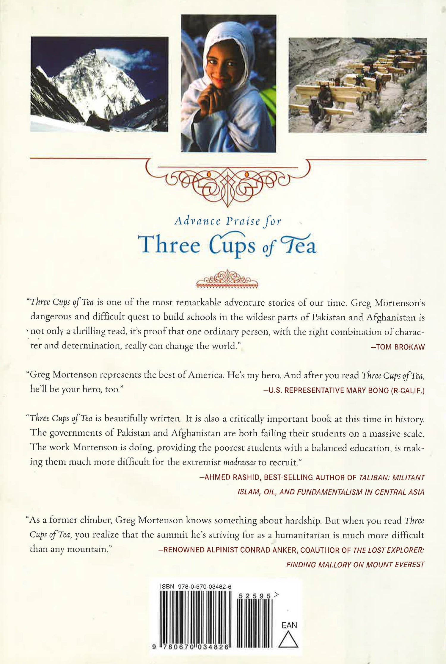 In 1993, following a failed attempt to ascend K2, Greg Mortenson was inspired by a chance encounter with impoverished mountain villagers in Pakistan and promised to build them a school. From that rash, earnest promise grew one of the most incredible humanitarian campaigns of our time--Mortenson's one-man mission to counteract extremism by building schools, especially for girls, throughout the breeding ground of the Taliban.Award-winning journalist David Oliver Relin has collaborated on this spellbinding account of Mortenson's incredible accomplishments in a region where Americans are often feared and hated. Over the following decade Mortenson built not just one but fifty-five schools. Three Cups of Tea is at once an unforgettable adventure and the inspiring story of how one man really is changing the world--one school at a time.