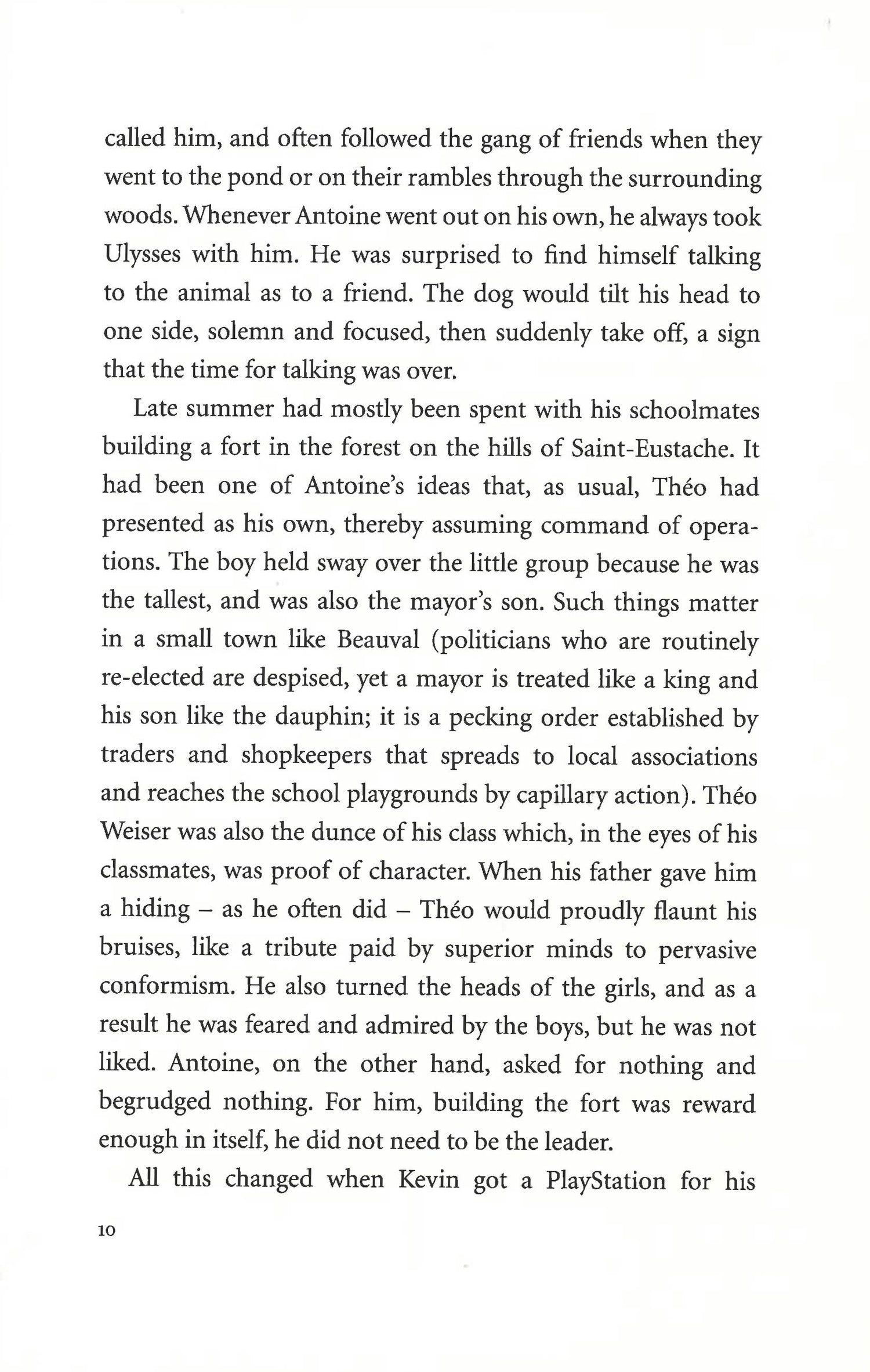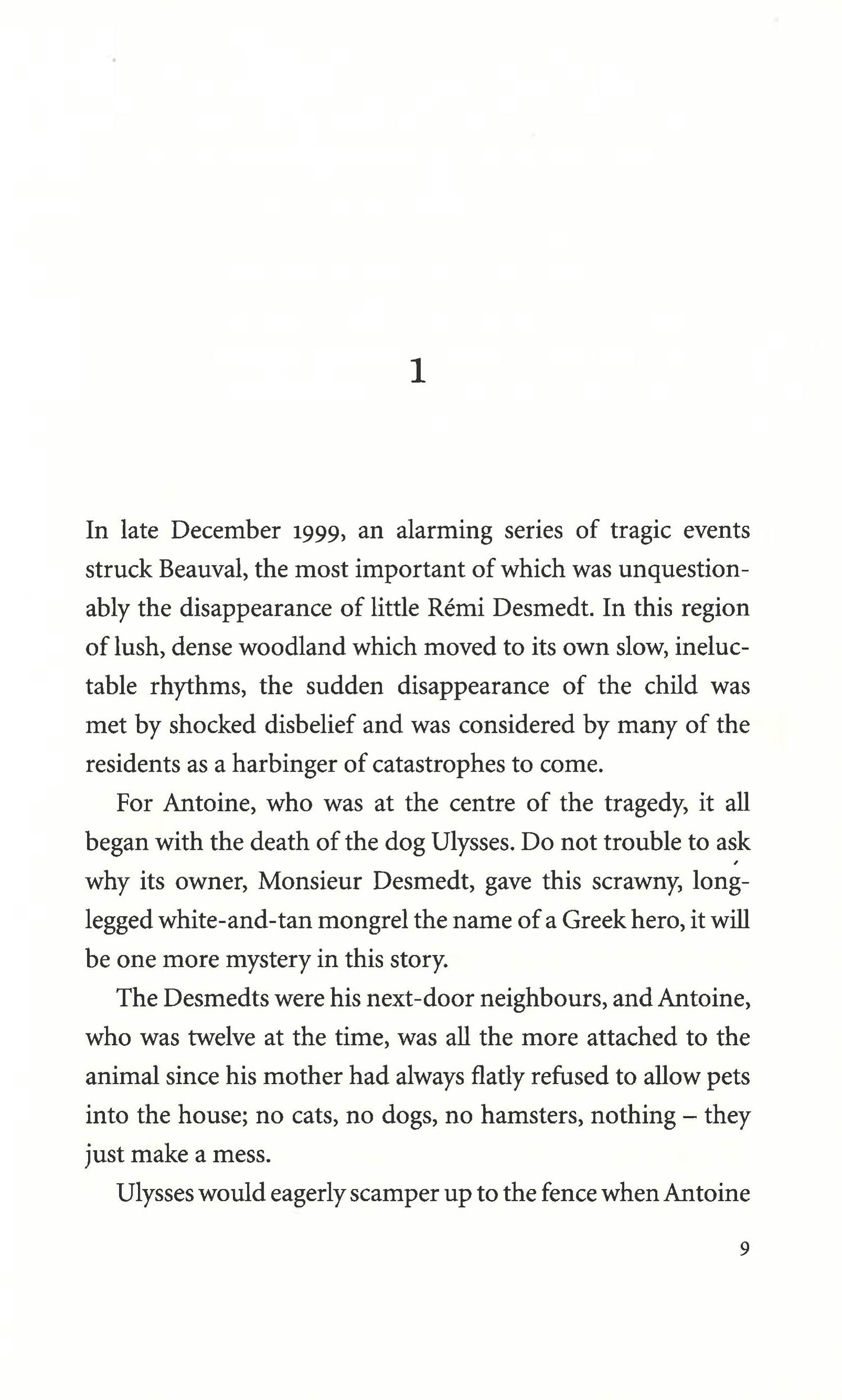 Antoine is twelve years old. His parents are divorced and he lives with his mother in Beauval, a small, backwater town surrounded by forests, where everyone knows everyone's business, and nothing much ever happens. But in the last days of 1999, a series of events unfolds, culminating in the shocking vanishing without trace of a young child. The adults of the town are at a loss to explain the disappearance, but for Antoine, it all begins with the violent death of his neighbour's dog. From that one brutal act, his fate and the fate of his neighbour's six year old son are bound forever. In the years following Remi's disappearance, Antoine wrestles with the role his actions played. As a seemingly inescapable net begins to tighten, breaking free from the suffocating environs of Beauval becomes a gnawing obsession. But how far does he have to run, and how long will it take before his past catches up with him again? Translated from the French by Frank Wynne