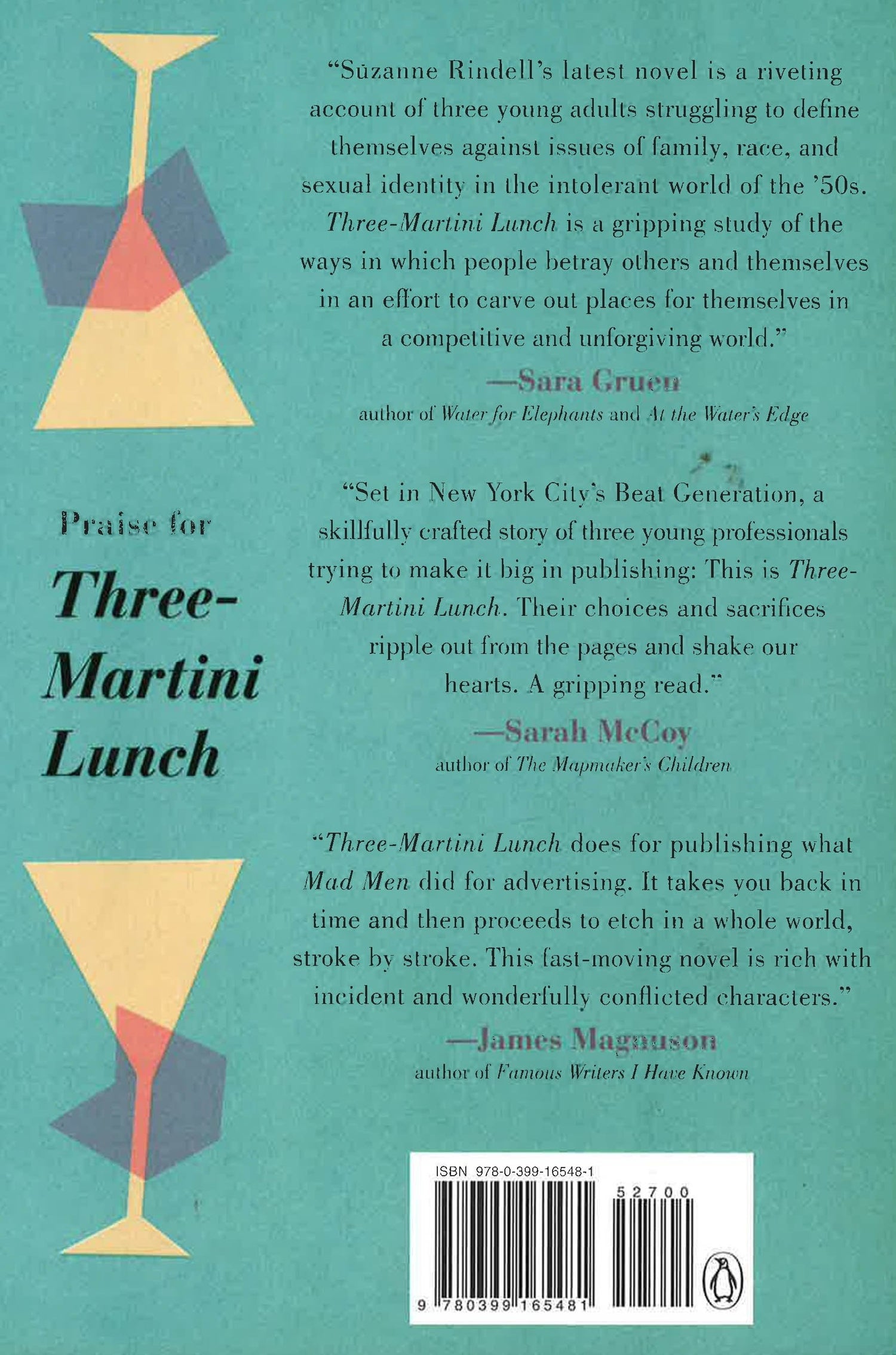 From the author of the "thrilling" (The Christian Science Monitor) novel The Other Typist comes an evocative, multilayered story of ambition, success, and secrecy in 1950s New York. In 1958, Greenwich Village buzzes with beatniks, jazz clubs, and new ideas--the ideal spot for three ambitious young people to meet. Cliff Nelson, the son of a successful book editor, is convinced he's the next Kerouac, if only his father would notice. Eden Katz dreams of being an editor but is shocked when she encounters roadblocks to that ambition. And Miles Tillman, a talented black writer from Harlem, seeks to learn the truth about his father's past, finding love in the process. Though different from one another, all three share a common goal: to succeed in the competitive and uncompromising world of book publishing. As they reach for what they want, they come to understand what they must sacrifice, conceal, and betray to achieve their goals, learning they must live with the consequences of their choices. In Three-Martini Lunch, Suzanne Rindell has written both a page-turning morality tale and a captivating look at a stylish, demanding era--and a world steeped in tradition that's poised for great upheaval.