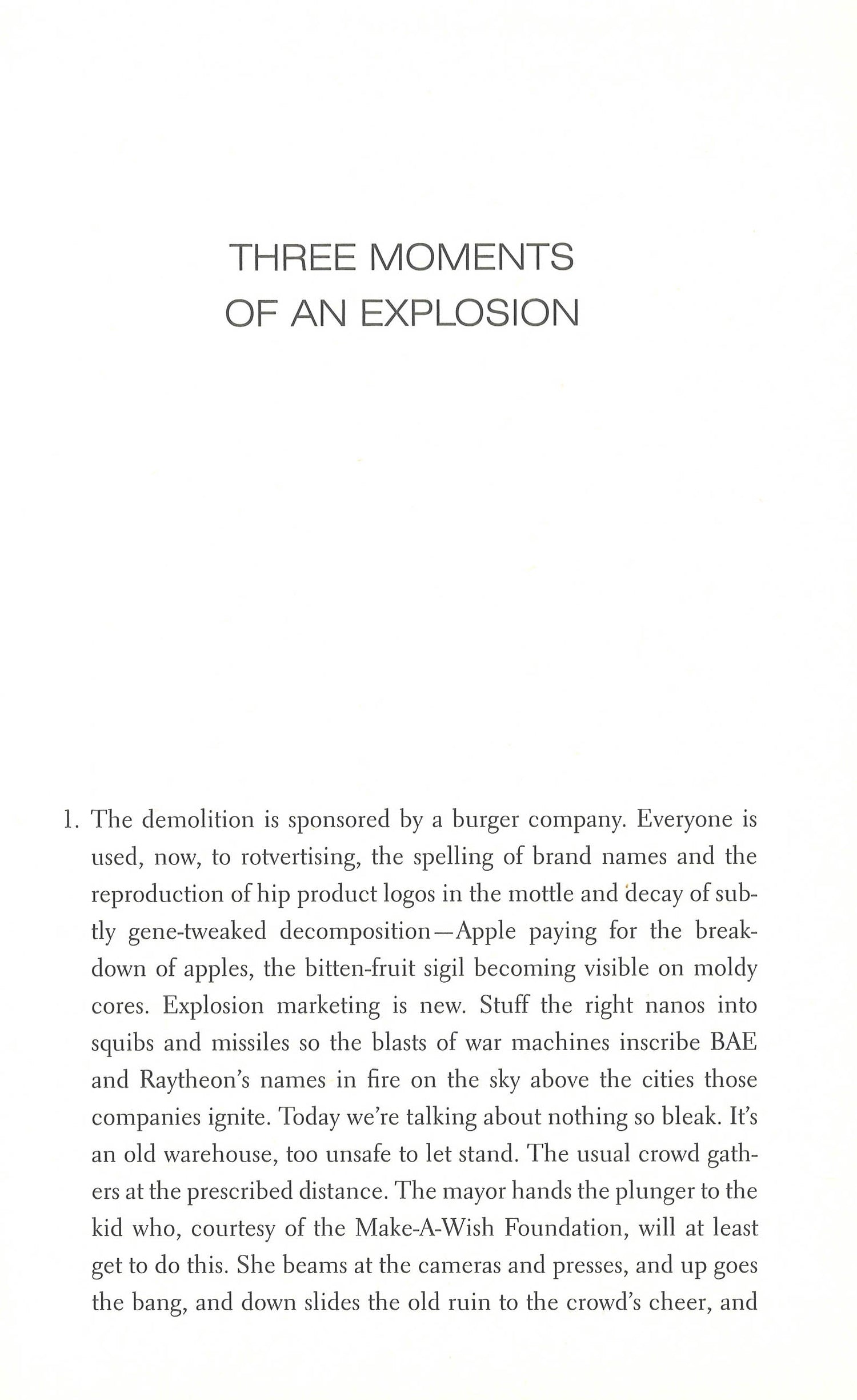 London- awakes one morning to find itself besieged by a sky full of floating icebergs. Destroyed oil rigs, mysteriously reborn, clamber from the sea and onto the land, driven by an obscure but violent purpose. An anatomy student cuts open a cadaver to discover impossibly intricate designs carved into a corpse s bones designs clearly present from birth, bearing mute testimony to . . . what? Of such concepts and unforgettable images are made the twenty-eight stories in this collection many published here for the first time. By turns speculative, satirical, and heart-wrenching, fresh in form and language, and featuring a cast of damaged yet hopeful seekers who come face-to-face with the deep weirdness of the world and at times the deeper weirdness of themselves "Three Moments of an Explosion" is a fitting showcase for one of literature s most original voices.