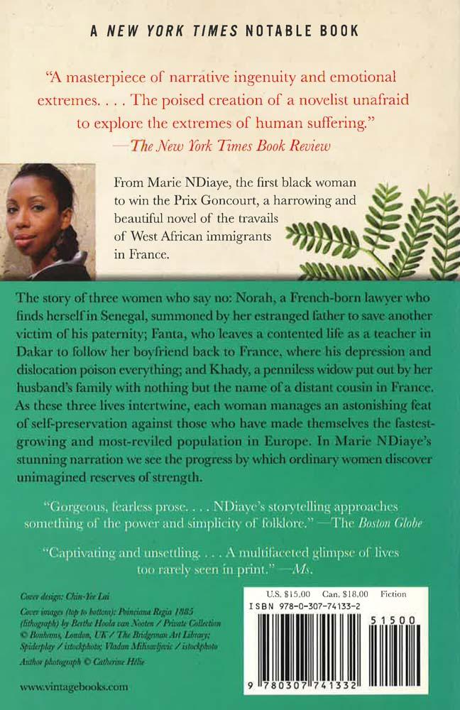 From Marie NDiaye, the first black woman to win the Prix Goncourt, a harrowing and beautiful novel of the travails of West African immigrants in France. The story of three women who say no: Norah, a French-born lawyer who finds herself in Senegal, summoned by her estranged father to save another victim of his paternity; Fanta, who leaves a contented life as a teacher in Dakar to follow her boyfriend back to France, where his depression and dislocation poison everything; and Khady, a penniless widow put out by her husband's family with nothing but the name of a distant cousin in France. As these three lives intertwine, each woman manages an astonishing feat of self-preservation against those who have made themselves the fastest-growing and most-reviled people in Europe. In Marie NDiaye's stunning narration we see the progress by which ordinary women discover unimagined reserves of strength.