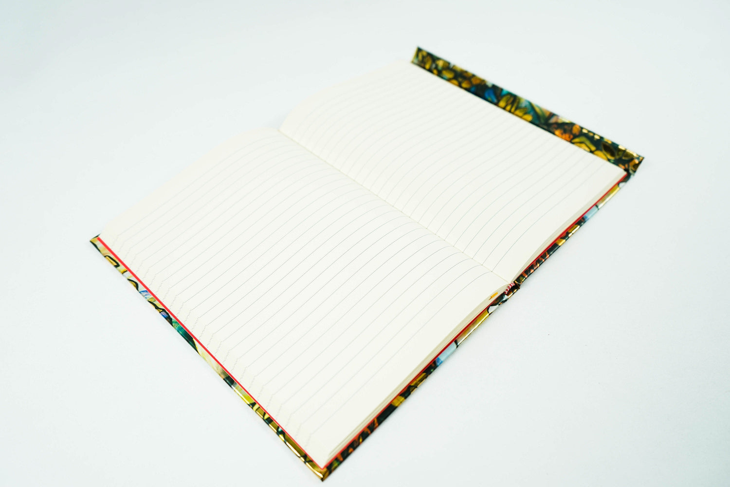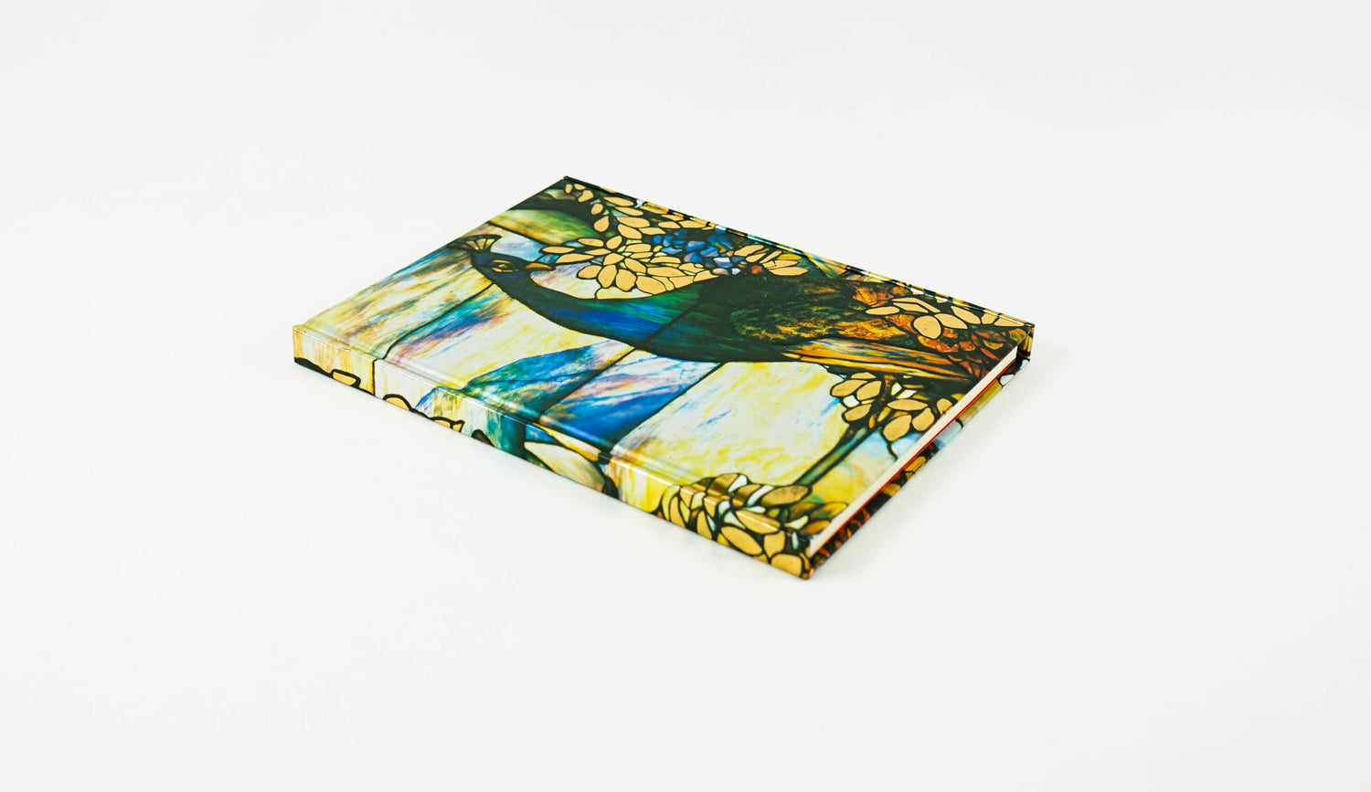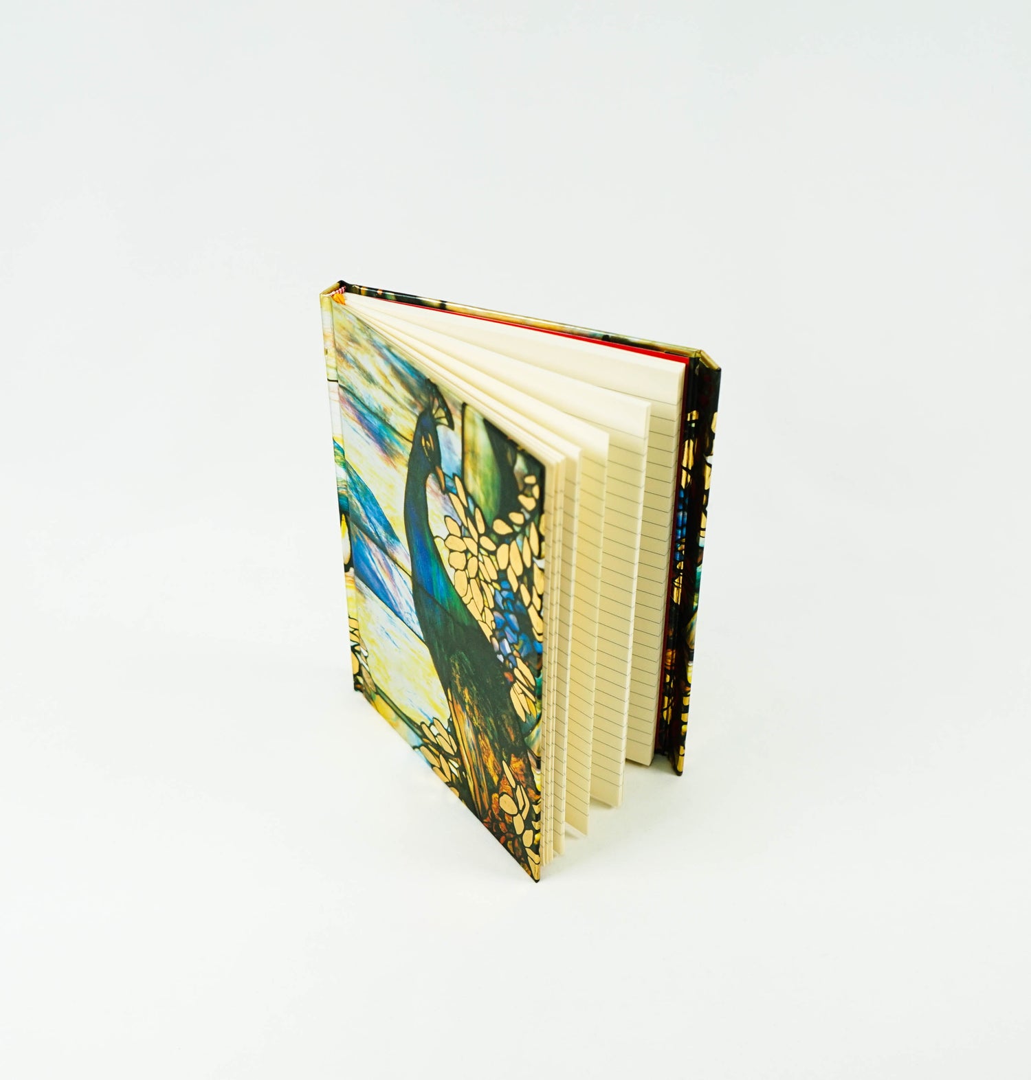Part of a series of exciting and luxurious Flame Tree Notebooks. Combining high-quality production with magnificent fine art, the covers are printed on foil in five colours, embossed, then foil stamped. And they're powerfully practical: a pocket at the back for receipts and scraps, two bookmarks and a solid magnetic side flap. These are perfect for personal use and make a dazzling gift. This example features a beautiful Louis Comfort Tiffany image of a leaded glass window landscape.