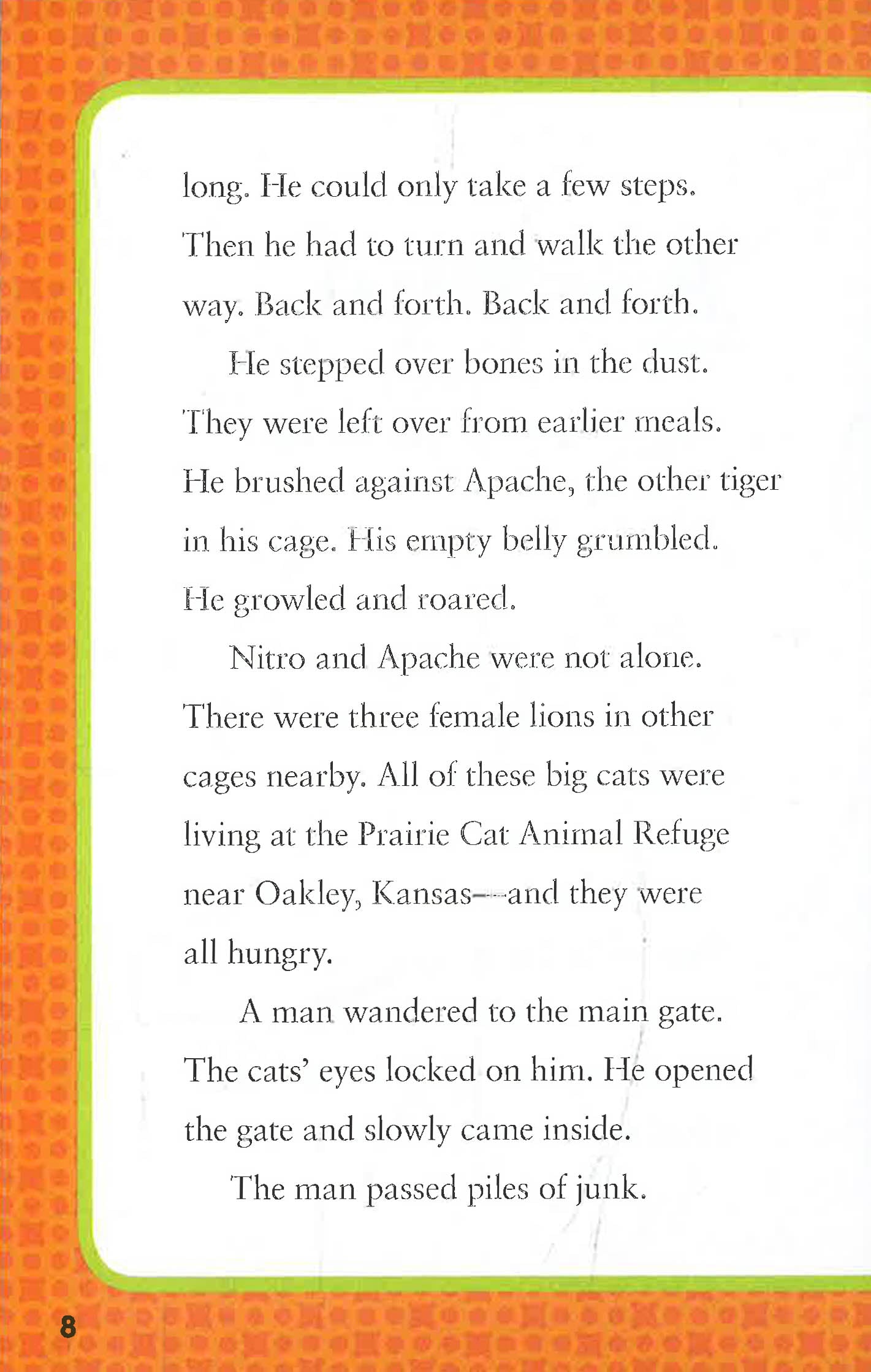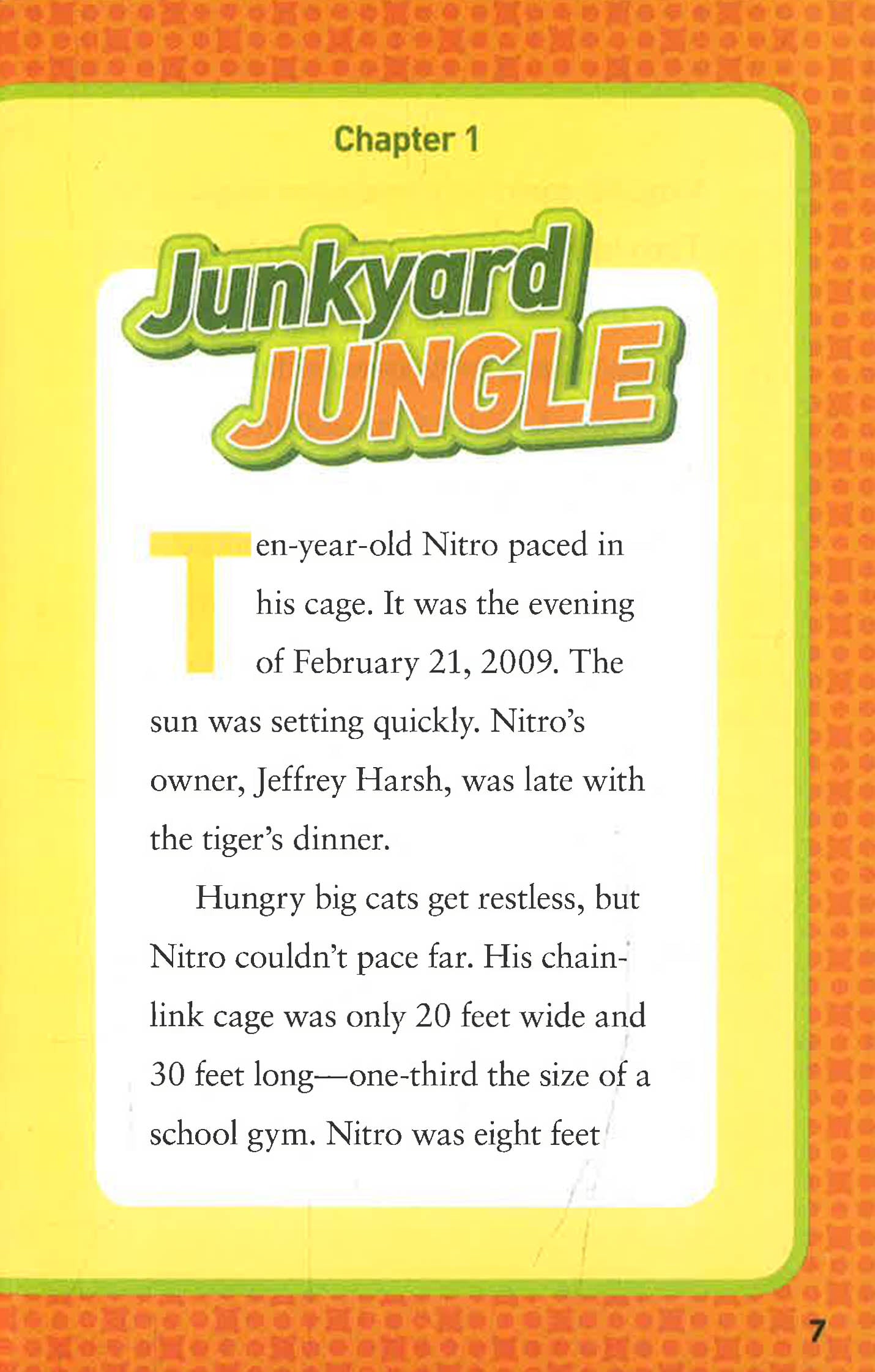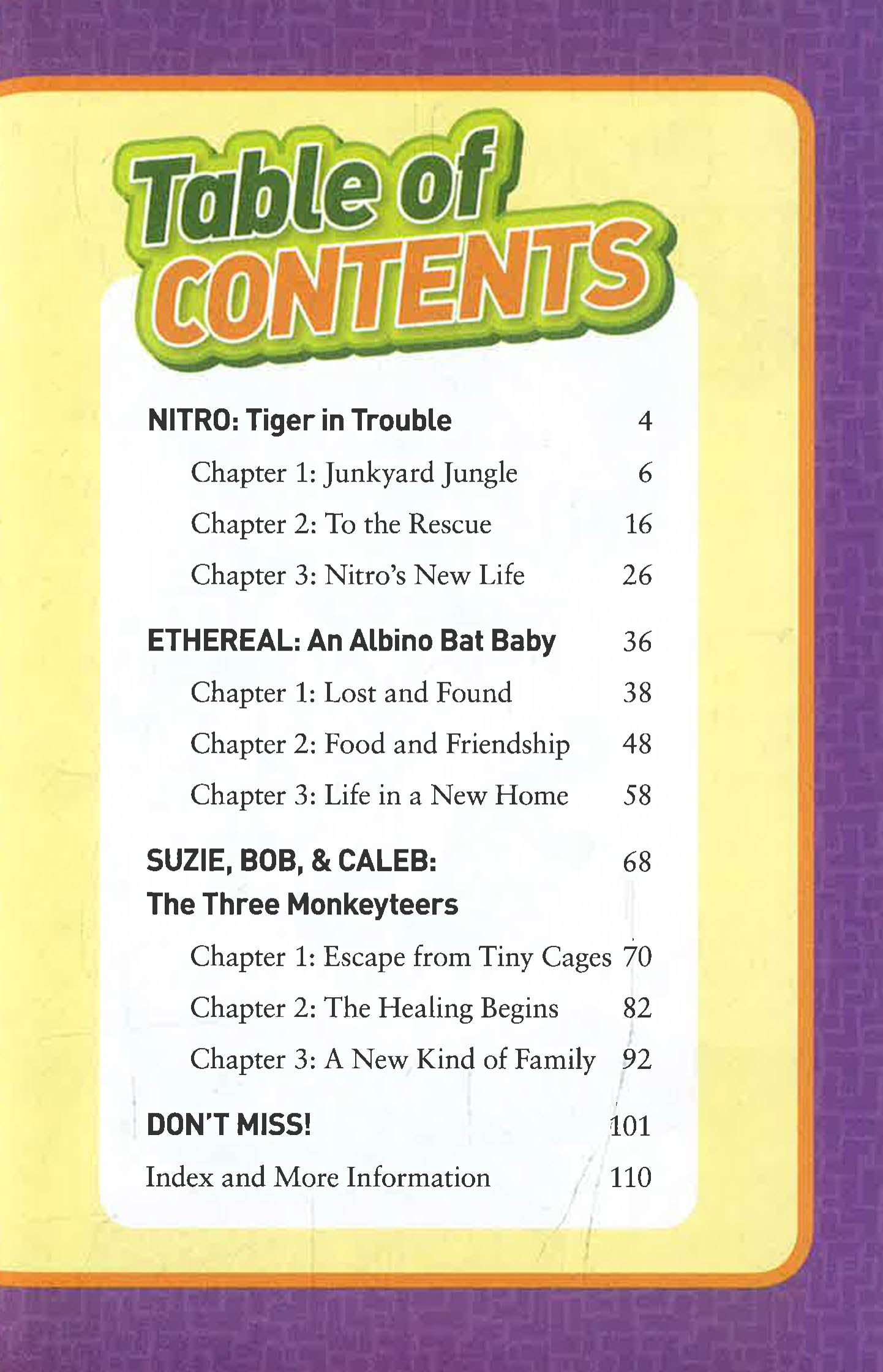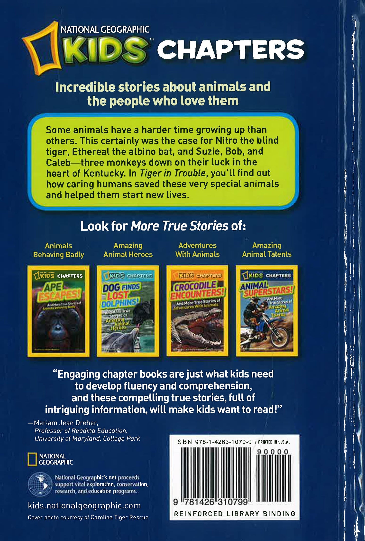 Follow the journey of Nitro, a tiger kept in captivity in Kansas. His story starts when the county sheriffs visited a Kansas property and decided to confiscate all big cats from their owner. Lions were sent to the Detroit Zoo, and Nitro and his friend Apache went to the Carolina Tiger Rescue. As Nitro was adjusting to his new home, things went terribly wrong. Fever broke out, and he lost his sight. With the help of his rescuers, his friend Apache, and a lot of patience and love, blind Nitro was given a whole new way to "see". Nitro became the keepers' and visitors' favorite. Filled with gorgeous photographs, sidebars, and fun facts, Tiger in Trouble! is sure to captivate all big cats lovers. Kids will learn great tips about these fascinating creatures and how to contribute to their conservation.Stories in this books also include: • Ethereal's survival story: the white albino bat • Susie, Bob, and Caleb: The Three MonkeyteersThis book will capture the hearts of animal lovers everywhere, as they will love reading the true stories of humans saving the lives of amazing animals.Releases simultaneously in Reinforced Library Binding: 978-1-4263-1079-9 , $14.90/$16.95 CanE-book: 978-1-4263-1080-5 , $5.99/$5.99 CanNational Geographic supports K-12 educators with ELA Common Core Resources.Visit www.natgeoed.org/commoncore for more information.