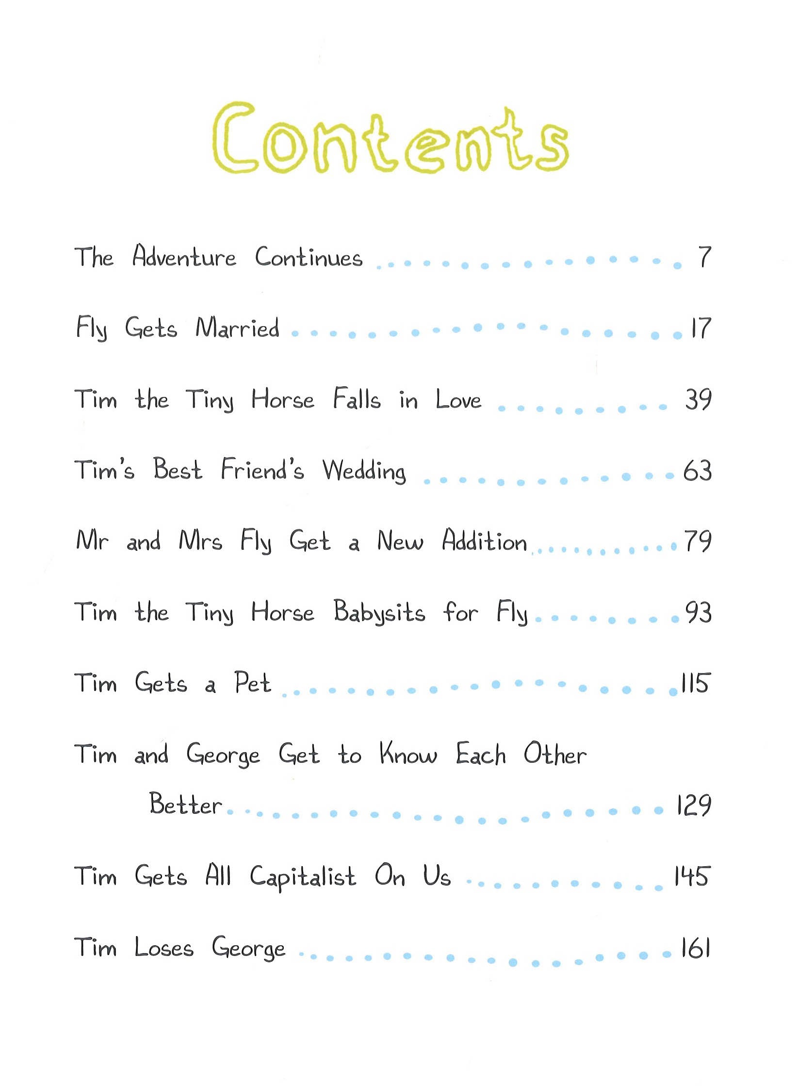 In his new book of adventures, Tim the tiny horse has to deal with some BIG things. He falls in love for the first time with a lady fly who doesn't appreciate him, so he acquires a pet greenfly (called George) to love instead. He has fun being best man at Fly's wedding, and experiences the joys and horrors of babysitting Fly's new baby. And then he decides to rent out his matchbox stable to a mad ladybird and her chaotic host of ant friends.