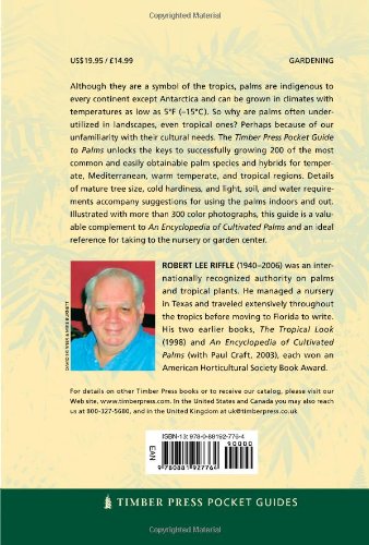 Native to every continent except Antarctica, palms are most closely identified with tropical regions and one species in particular, Cocos nucifera, the coconut palm, is the universally recognized symbol of all things tropical. Yet, many palms can withstand freezing and thus can be grown in mild temperate climates where the average low temperature does not drop below 5-F ( 15-C). In addition, palms thrive in a wide range of habitats from swamps to deserts, rain forests to plains and grasslands. Some prefer full sun, others deep shade. Some are stemless shrubs, others are solitary or clustering trees, and still others are vinelike, but all are evergreen. Given such diversity and versatility, it is surprising that palms are underutilized in landscapes and gardens, even in tropical climes. Several reasons account for this, including misconceptions about the plants' growing requirements and unfamiliarity with their ornamental qualities. This pocket guide remedies both problems. It unlocks the keys to successfully growing 200 of the most common and easily obtainable palm species and hybrids, and it highlights botanical characteristics that are of interest to gardeners and landscapers. Each description includes details of trunk, crownshaft, leaf, flower, and fruit to assist in plant identification and selection. The extensive cultivation notes include details of mature tree size, cold hardiness, and light, soil, and water requirements. Suggestions for using the plants indoors and out will help even novice gardeners know where to start, and succinct information on seed germination will assist anyone who wants to grow their own palms from seed. Illustrated with more than 300 color photographs, this guide is a valuable complement to "An Encyclopedia of Cultivated Palms" and an ideal reference for taking to the nursery or garden center.