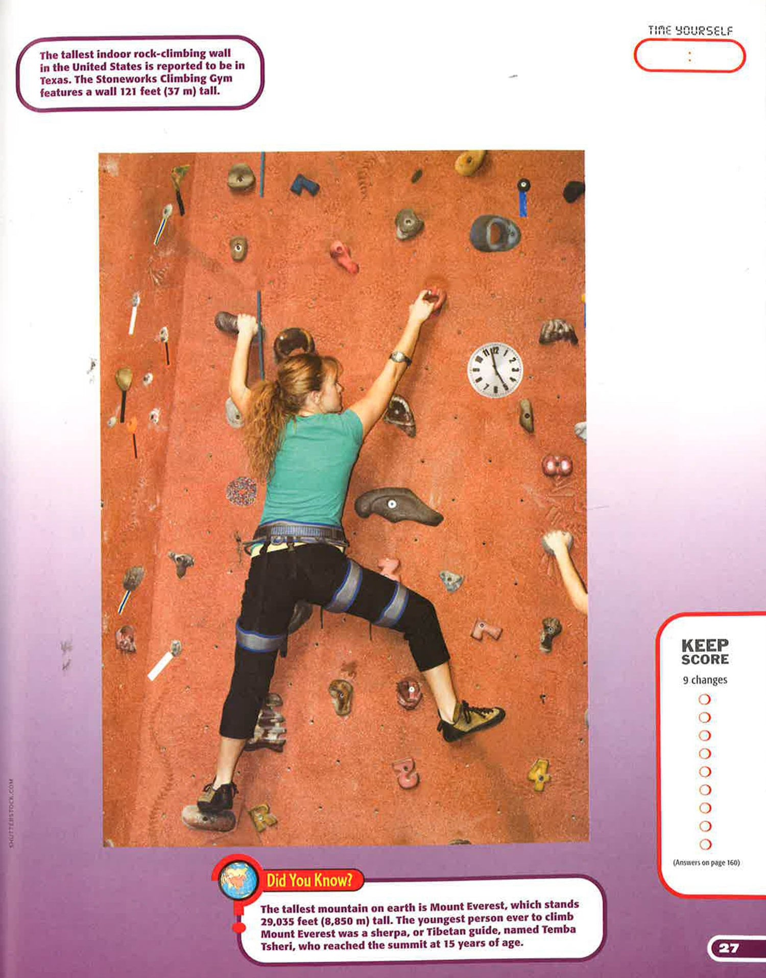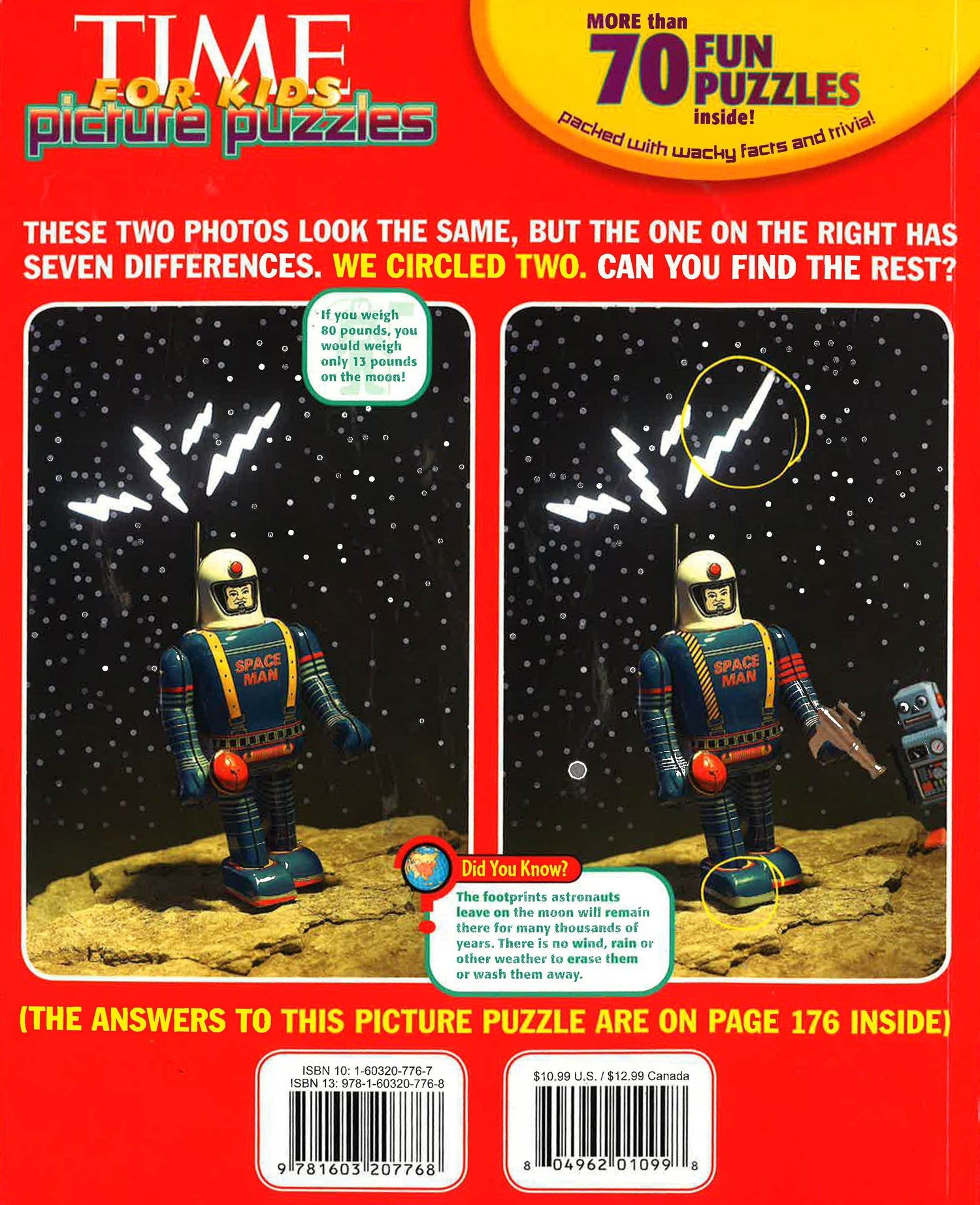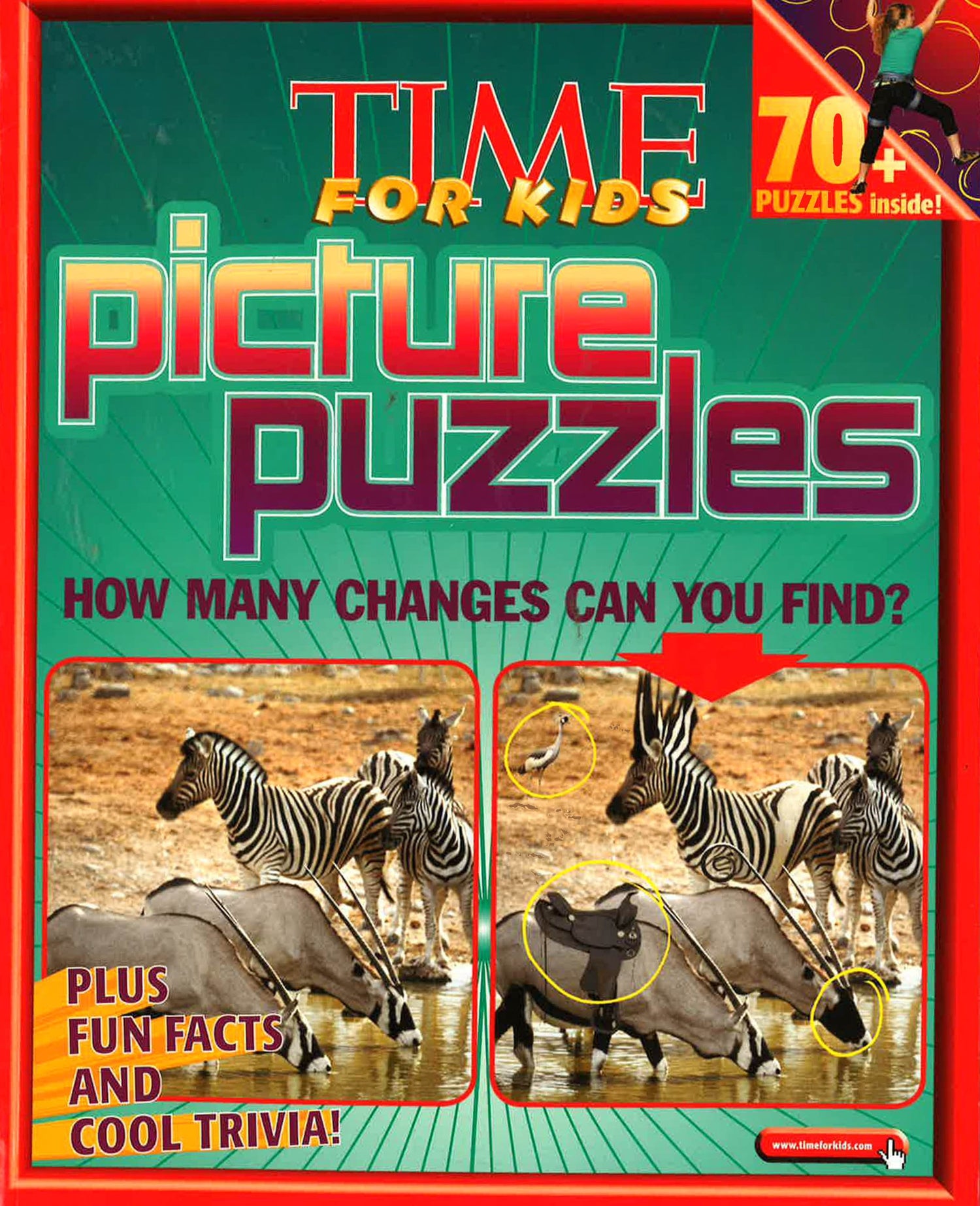 "Time For Kids" has taken the phrase "what's wrong with this picture? to a whole new level. A spin-off of the best-selling, totally addictive "Life Picture Puzzle" book series, each spread in the "Time For Kids Picture Puzzles" features 2 versions of a fetching photo. For each pair of pictures, the puzzler must find the differences from one photo to the next. Did a zebra lose its stripes? Maybe a car changed directions (or got a new license plate or a paint job)? With more than seventy puzzles inside, each boasting anywhere from six to fifteen changes, "Time For Kids Picture Puzzles" is sure to captivate kids for hours.