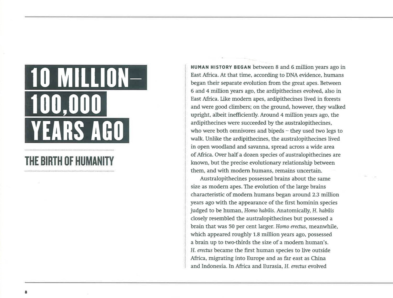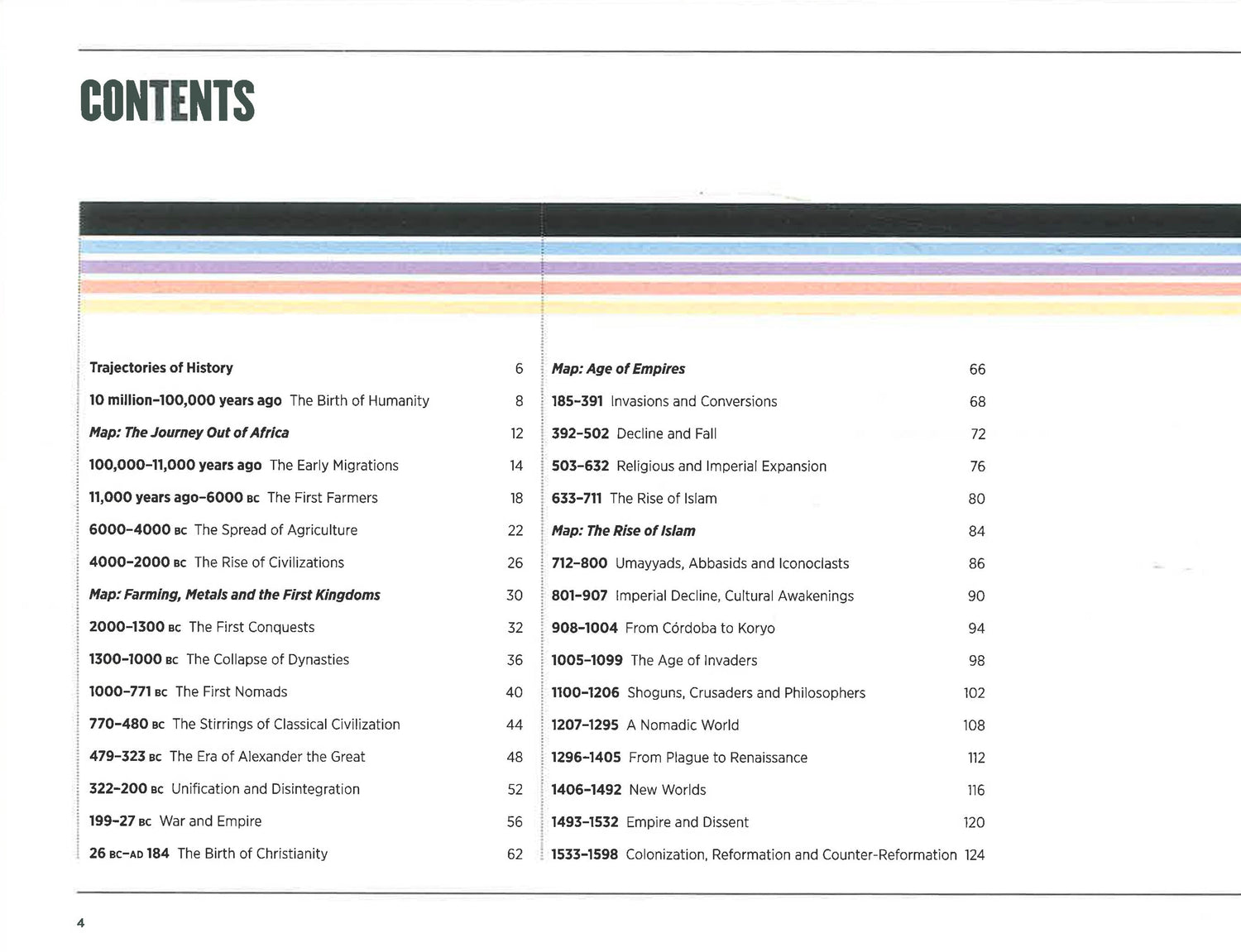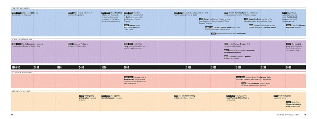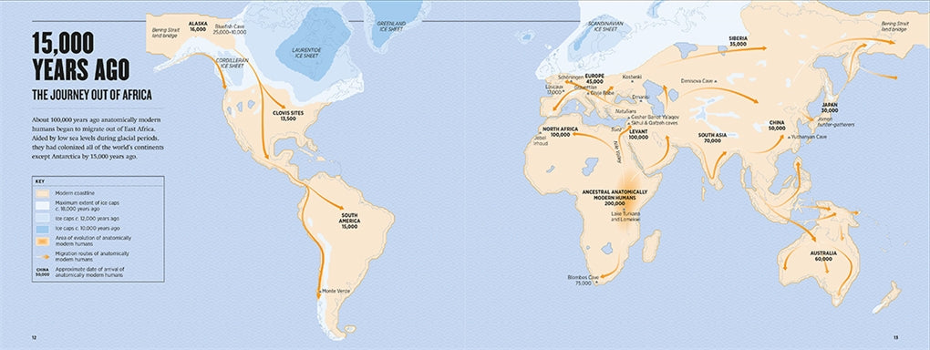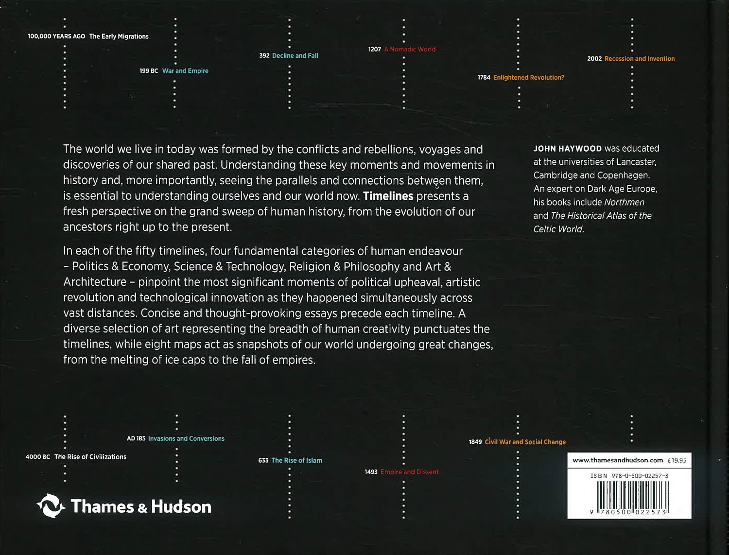 John Haywood presents a grand sweep of global history in an immediately accessible format via concise, insightful and engaging text summaries alongside timelines, maps and illustrations. There are 50 sections, each dealing with significant moments in the human story from the origins of our first ancestors right up to the present day. A short essay introduces and summarizes the most important political and cultural landmarks with a clear timeline then presenting events in four categories: Politics & Economy, Religion & Philosophy, Science & Technology and Arts & Architecture. Maps revealing the changes in our physical world at key junctures in human history as well as galleries of images illustrating the rich and diverse products of our cultural heritage, offer a visual path through time.