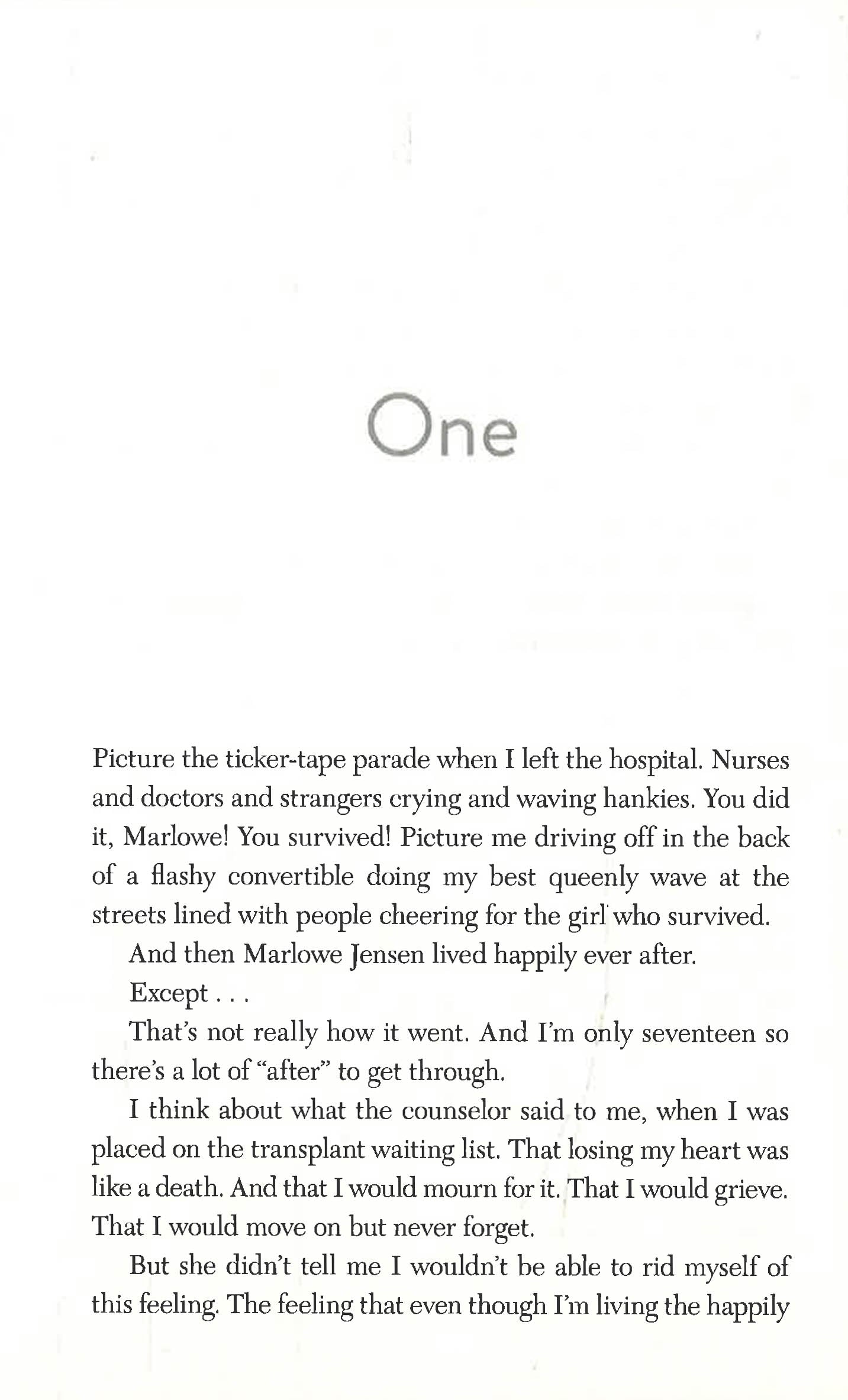 When Marlowe gets a heart transplant and a second chance at life, all she wants to do is to thank her donor's family. Maybe then she can move on. Maybe then she'll discover who she is if she's no longer The Dying Girl.