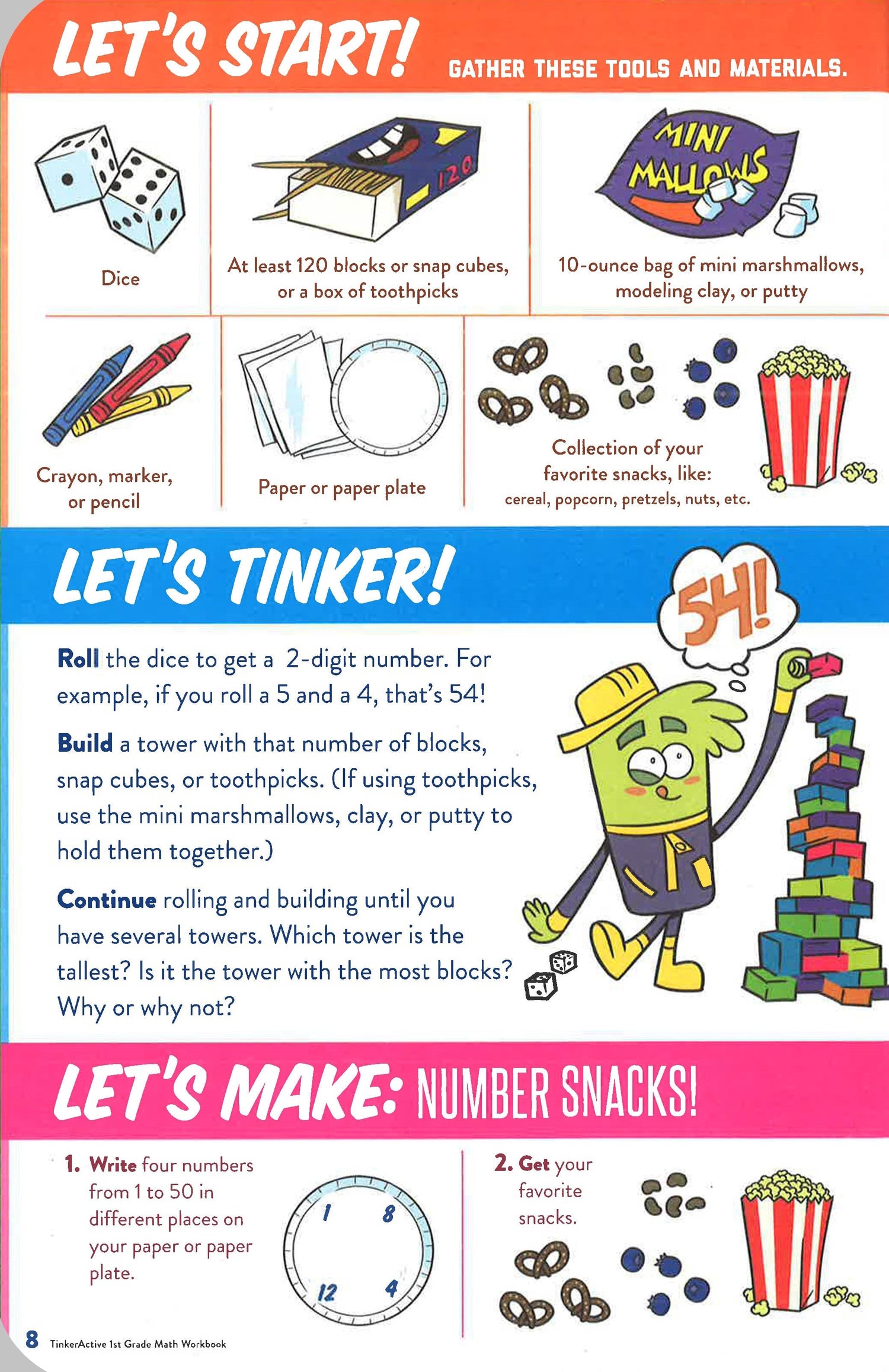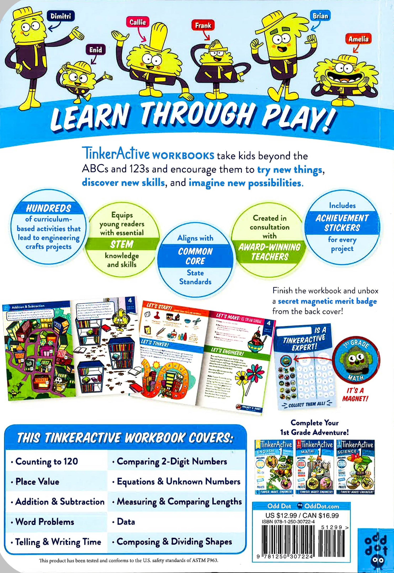 Tinker, make, and engineer to learn through play! With TinkerActive Workbooks, learning leaps off the page and into the real world. Start with interactive and entertaining exercises that cover the essential first grade math and problem-solving skills. Then, apply what you've learned in exciting hands-on tinkering, making, and engineering activities that utilize only common household materials. Plus, the charming cast of characters, the MotMots, guide kids through every new concept with cheer and humor. Once you've completed the workbook, unbox a collectible magnet hidden in the back cover! Vetted by award-winning educators, TinkerActive Workbooks are designed for all learners. They build your child's fundamental math skills AND inspire them to try new things, discover new skills, and imagine new possibilities.