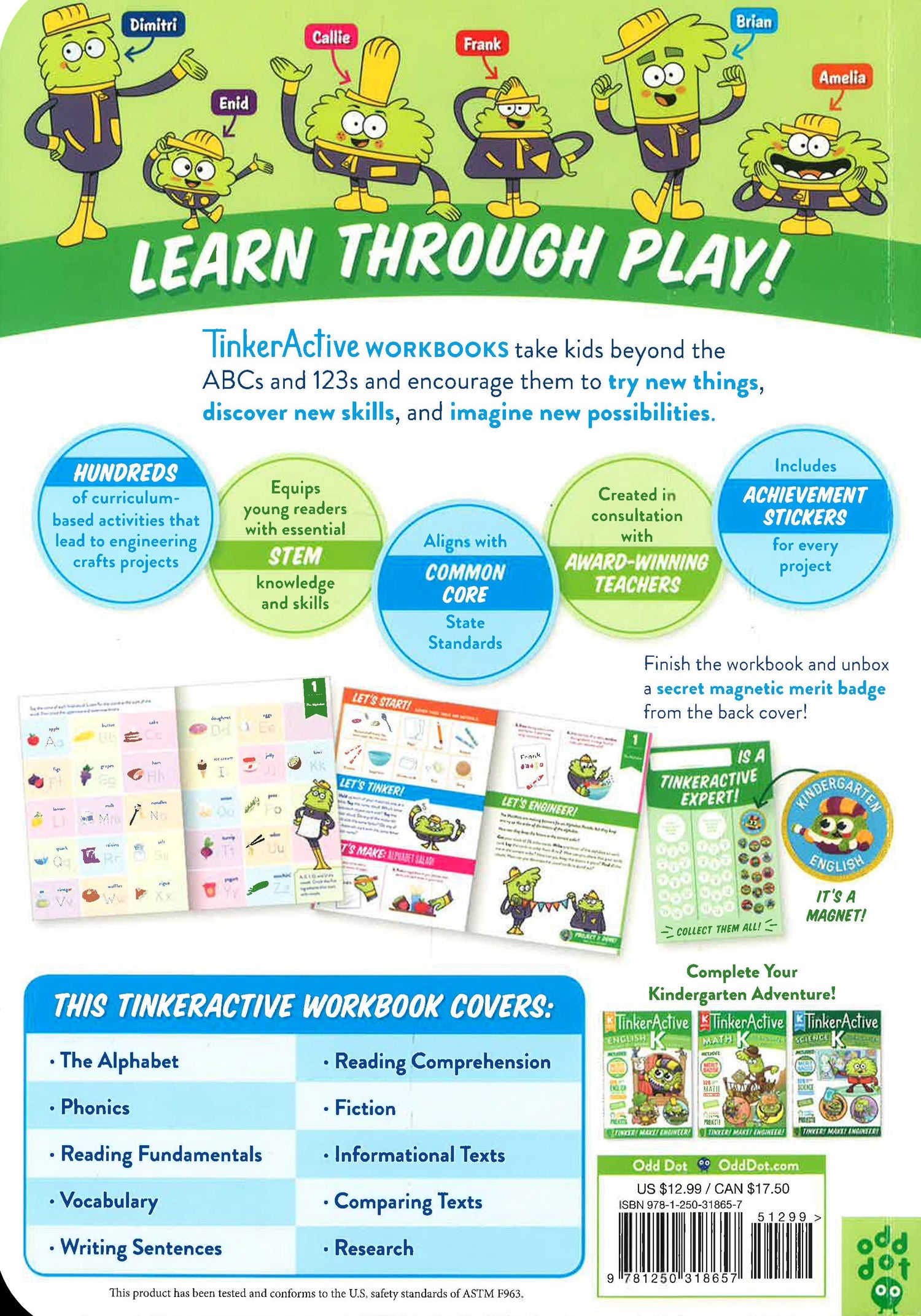 Tinker, make, and engineer to learn through play! With TinkerActive Workbooks, learning leaps off the page and into the real world. Start with interactive and entertaining exercises that cover the essential kindergarten English skills. Then, apply what you've learned with exciting hands - on tinkering, making, and engineering activities that utilize only common household materials. Plus, the charming cast of characters, the MotMots, guide kids through every new concept with cheer and humor. Once you've completed the workbook, unbox a collectible magnet badge hidden in the back cover. Vetted by award - winning educators, TinkerActive Workbooks are designed for all learners. They build your child's fundamental English skills AND inspire them to try new things, discover new skills, and imagine new possibilities.