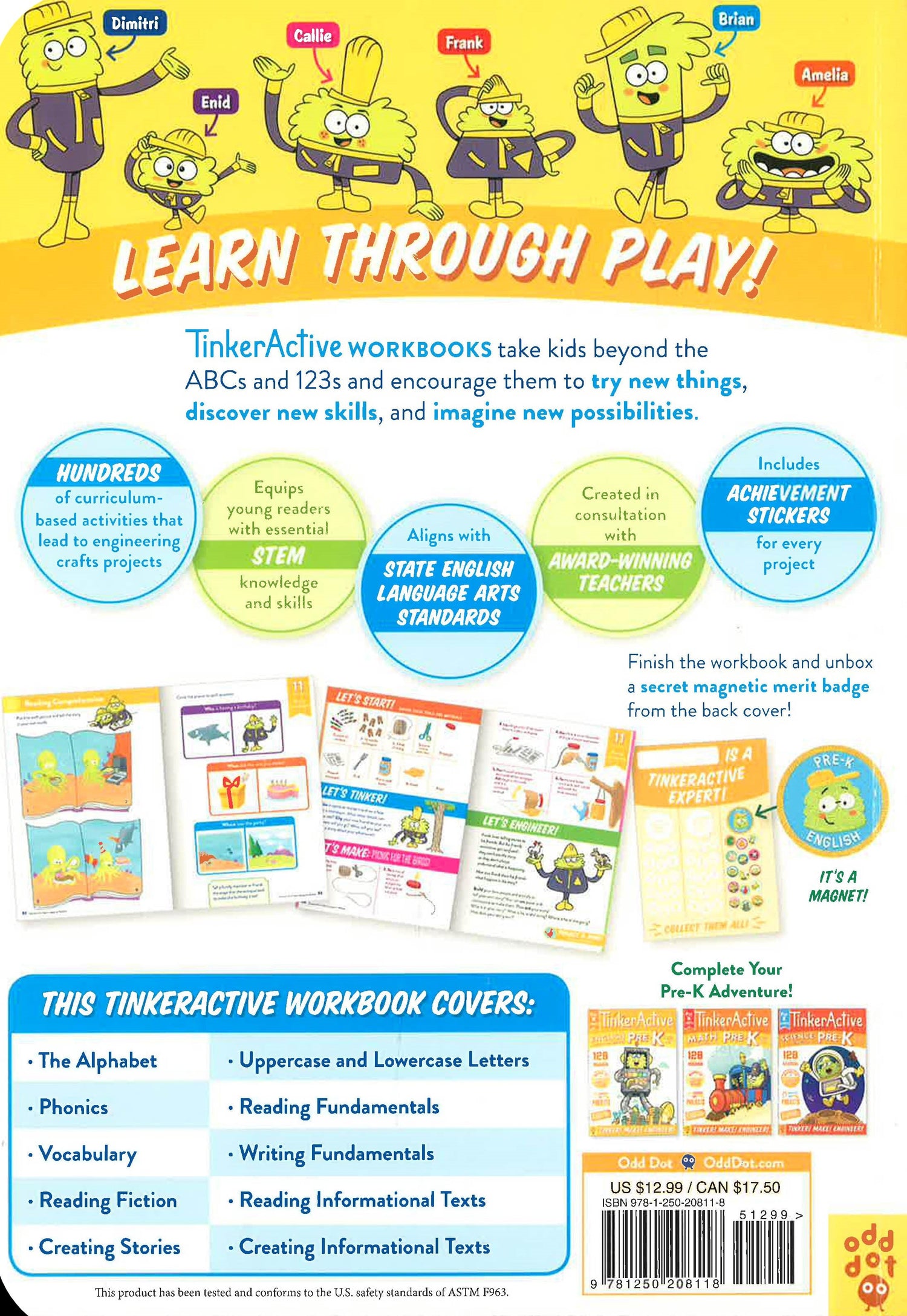 With TinkerActive Workbooks, learning leaps off the page and into the real world. Start with interactive and entertaining exercises that cover the essential pre-K English skills. Then apply what you've learned with exciting hands-on tinkering, making, and engineering activities and common household materials. A charming cast of characters guide kids through every new concept with cheer and humor. Once you've completed the workbook, unbox a collectible magnet badge hidden in the back cover. Created in consultation with award-winning educators, TinkerActive Workbooks are designed so kids can learn through play! They build your child's fundamental English skills AND inspire them to try new things, discover new skills, and imagine new possibilities. This workbook covers: The Alphabet, Uppercase & Lowercase Letters, Phonics, Reading Fundamentals, Writing Fundamentals, Vocabulary, Reading Comprehension: Fiction, Reading Comprehension: Informational Texts, Writing Stories, and Writing Informational Texts.