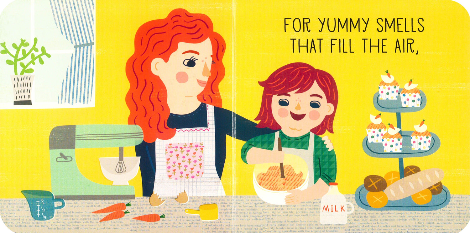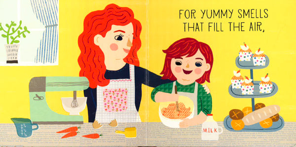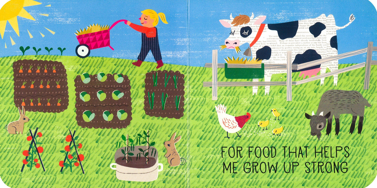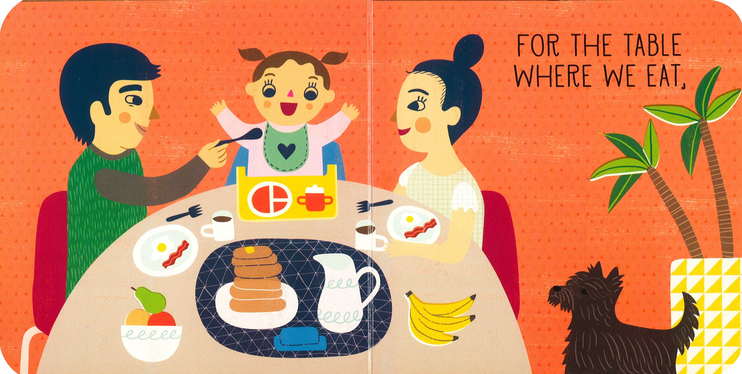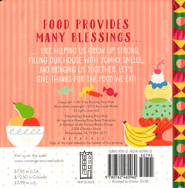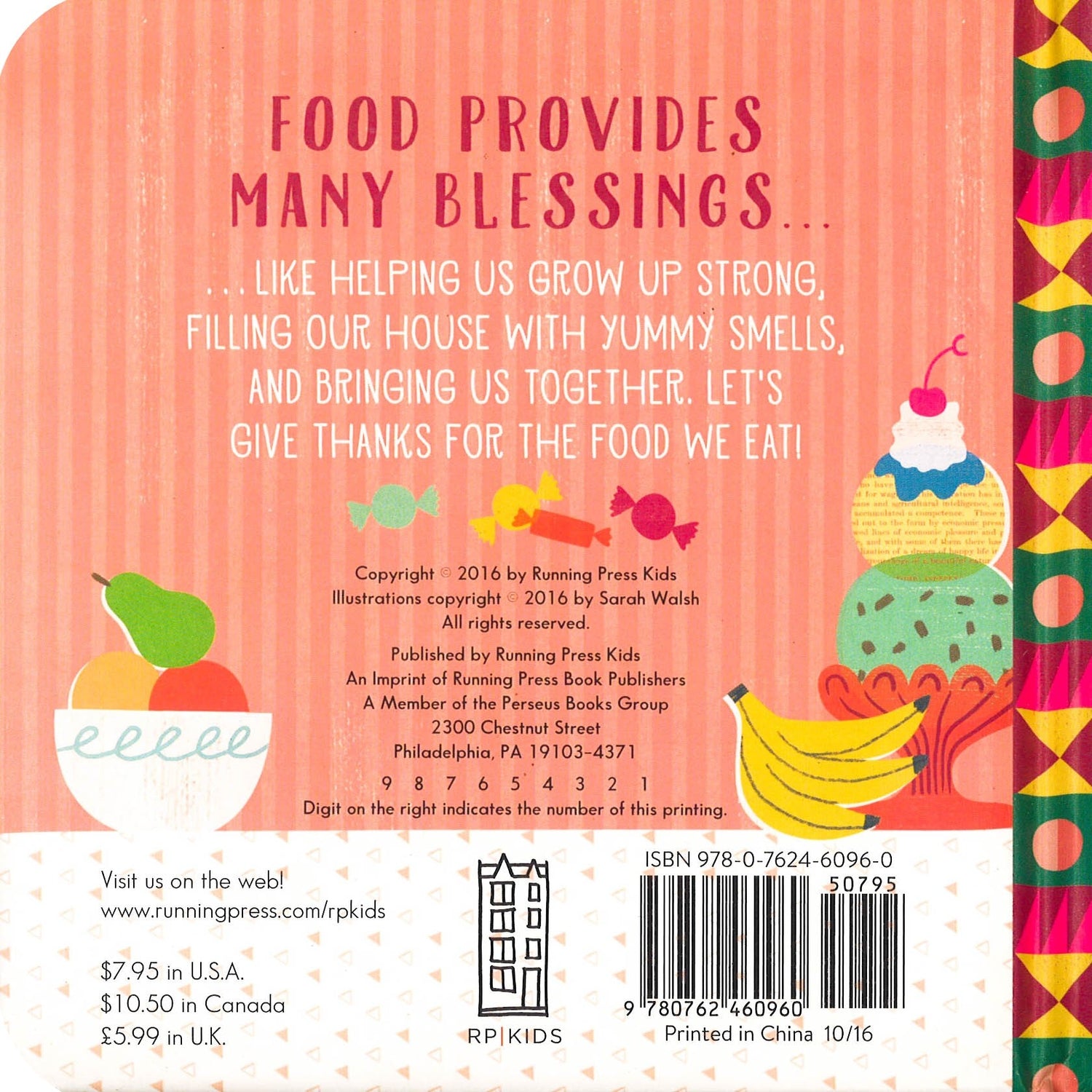 Food Provides Many Blessings. . .Like helping us grow up strong, filling our house with yummy smells, and bringing us together. Let's give thanks for the food we eat! With thoughtful verse and illustrations that highlight the warmth of home, parents and children will delight in the simple blessings included in this sweet padded-cover board book.