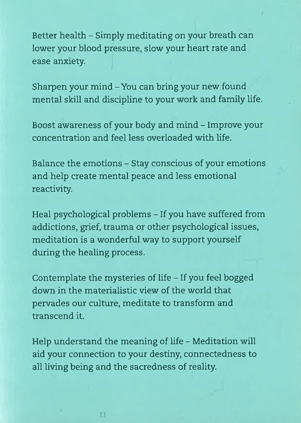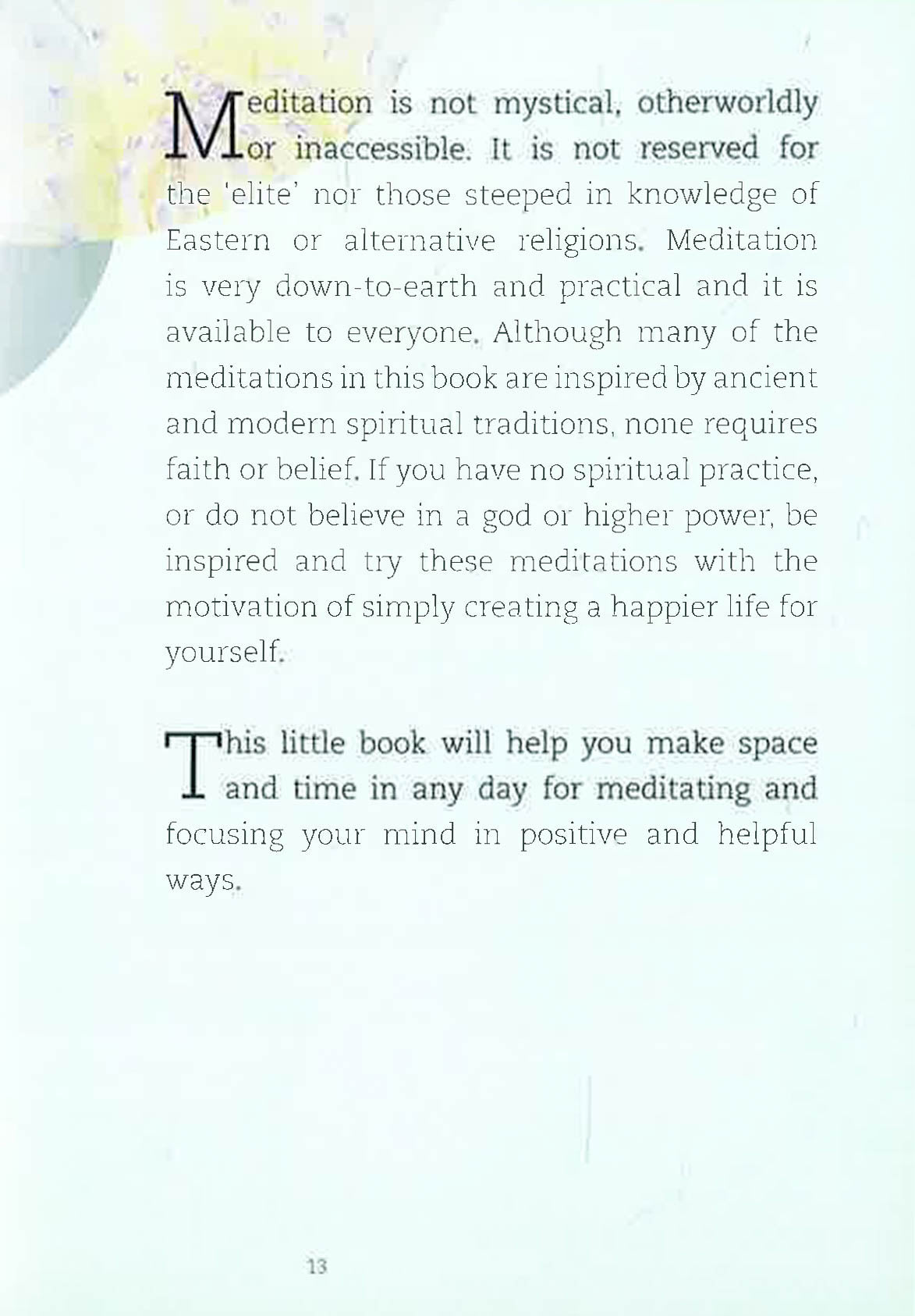 Meditation is an indispensable tool for daily living. It can sharpen the mind, balance the emotions and even help you understand the mysteries of life.Whether you are a beginner or have been meditating for some time, this little book offers a collection of simple and effective meditations and words of inspiration to enrich your daily life and deepen your spiritual practice.Chapters:INTRODUCTION HOW TO START MEDITATIONS FOR BODY, MIND & SPIRITMEDITATIONS FOR LOVE & COMPASSIONMEDITATIONS FOR PROBLEM SOLVING