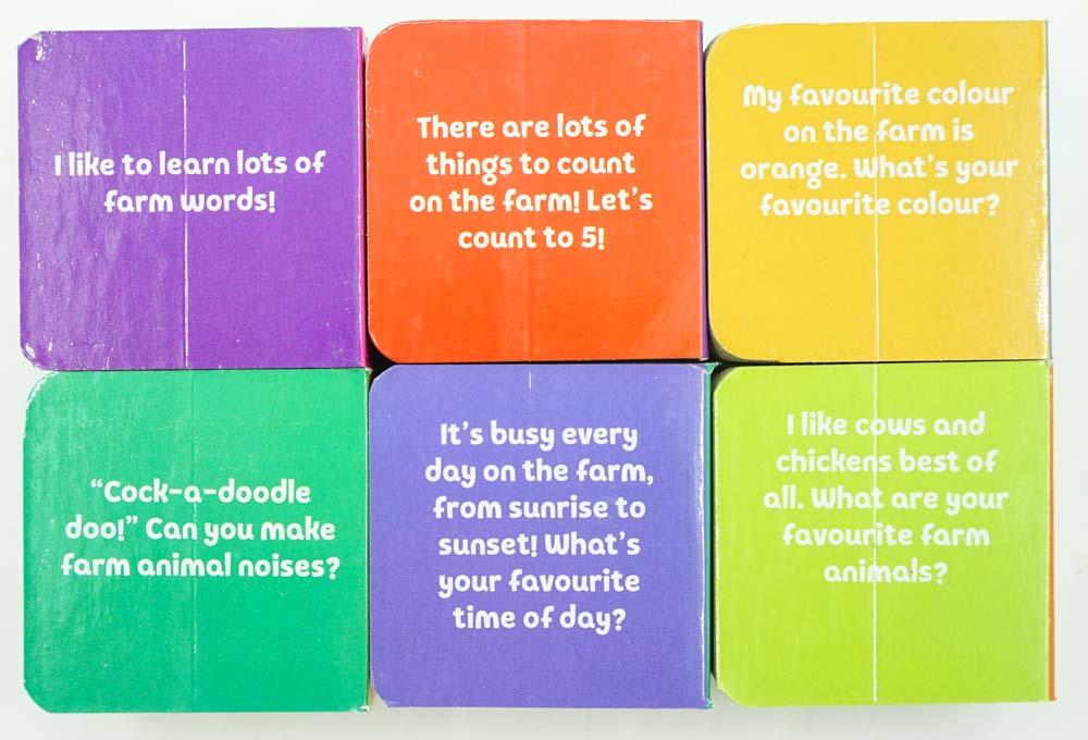 Includer 6 little learning books to make your first library. -Farm Counting -Famn Colouring -Farm Animals -Animal Noises -A Day on the Farm -Farm Words