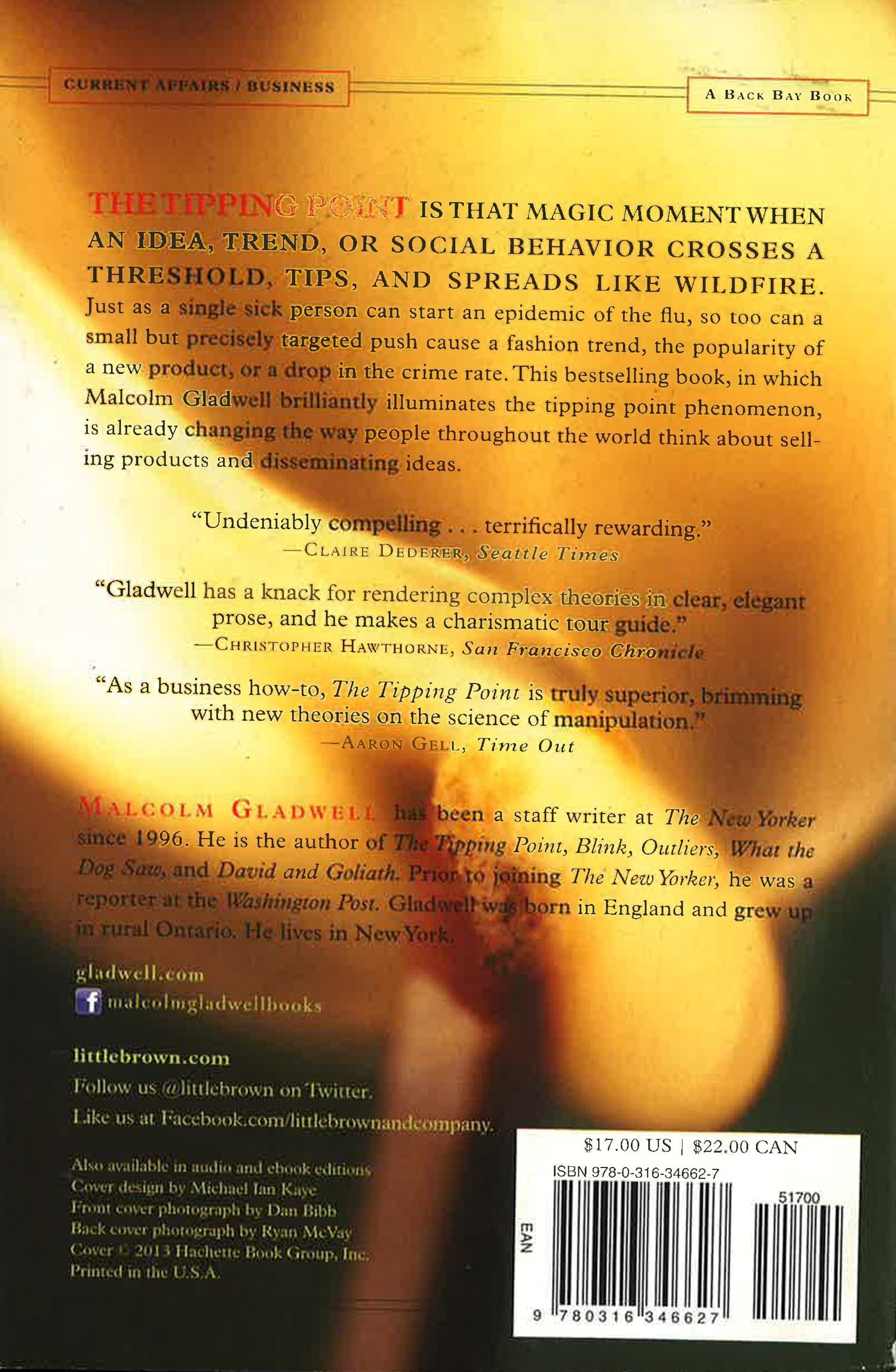 The tipping point is that magic moment when an idea, trend, or social behavior crosses a threshold, tips, and spreads like wildfire. Just as a single sick person can start an epidemic of the flu, so too can a small but precisely targeted push cause a fashion trend, the popularity of a new product, or a drop in the crime rate. This widely acclaimed bestseller, in which Malcolm Gladwell explores and brilliantly illuminates the tipping point phenomenon, is already changing the way people throughout the world think about selling products and disseminating ideas.
