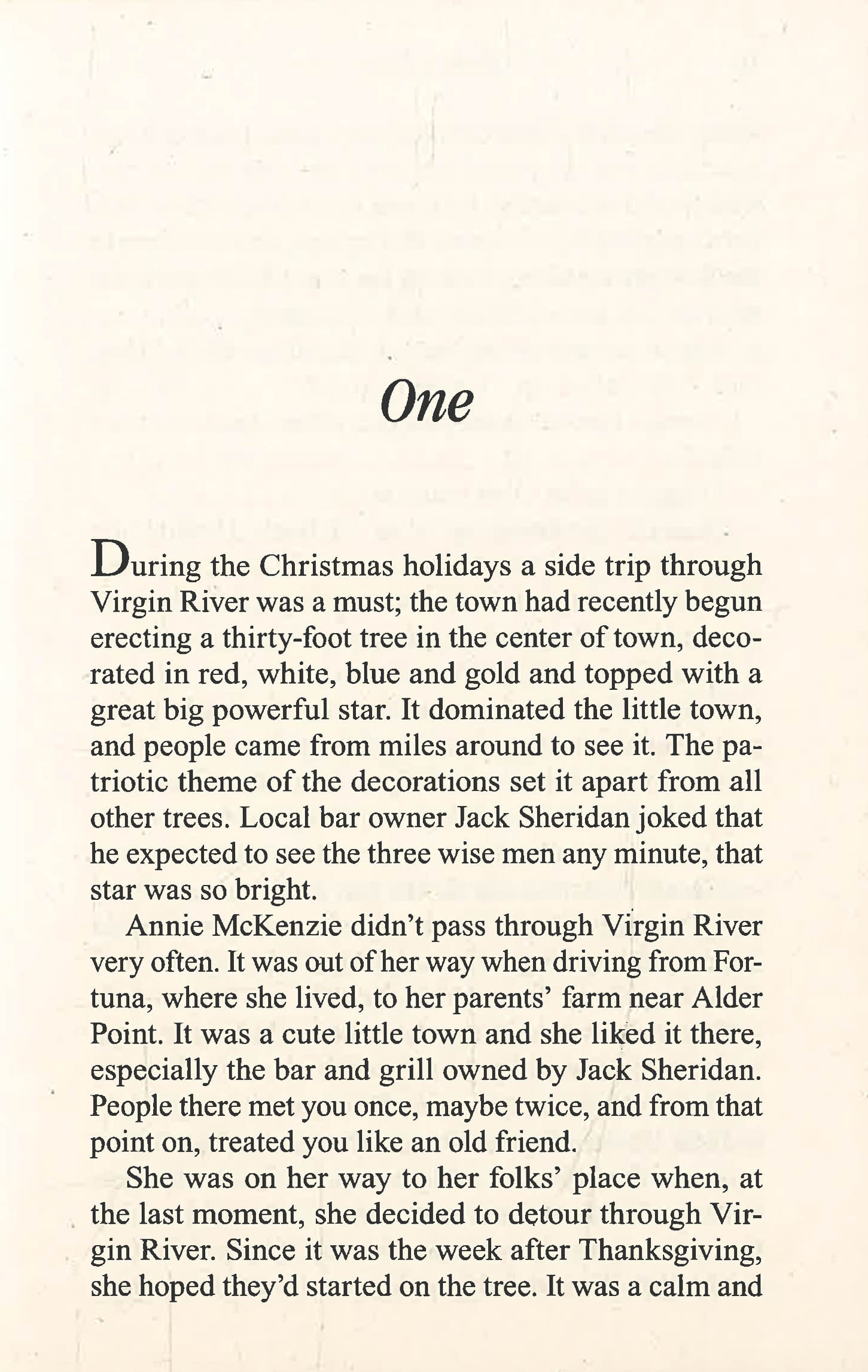 Drew Foley and Sunny Archer are each visiting Virgin River for the holidays, and trying to escape broken hearts. Sunny, left at the altar the previous New Year’s Eve, is in no mood to celebrate and Drew, getting over his own heartbreak, is trying to find some peace in the beautiful town.