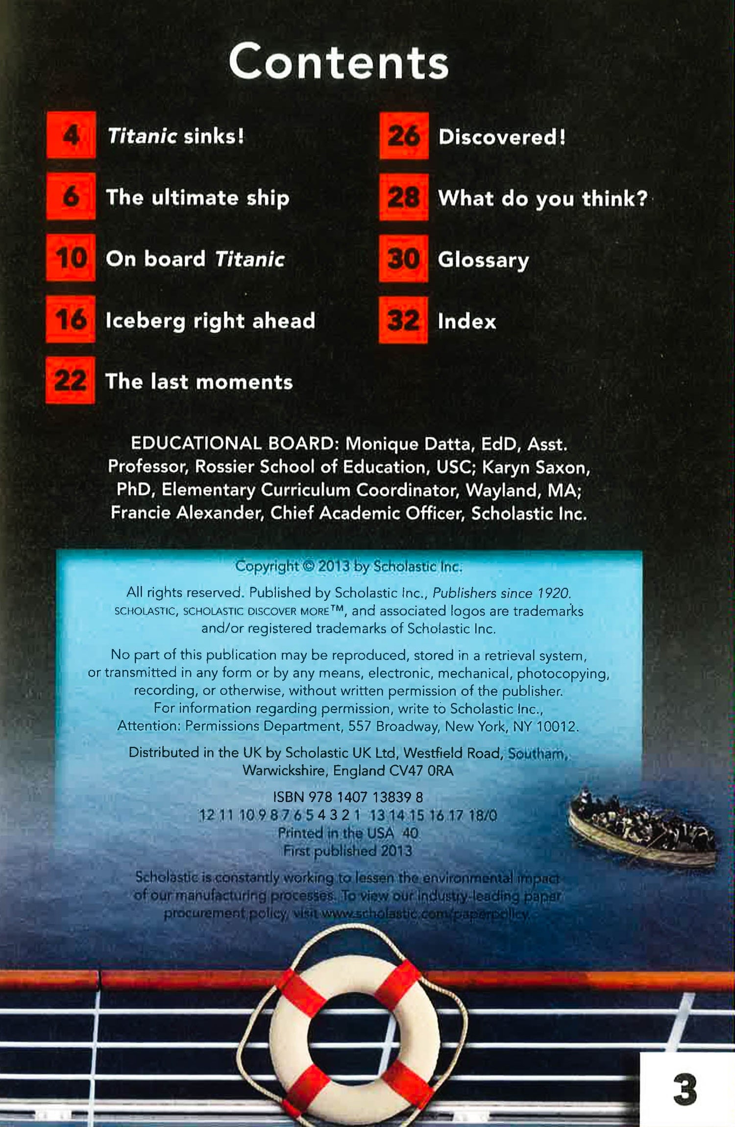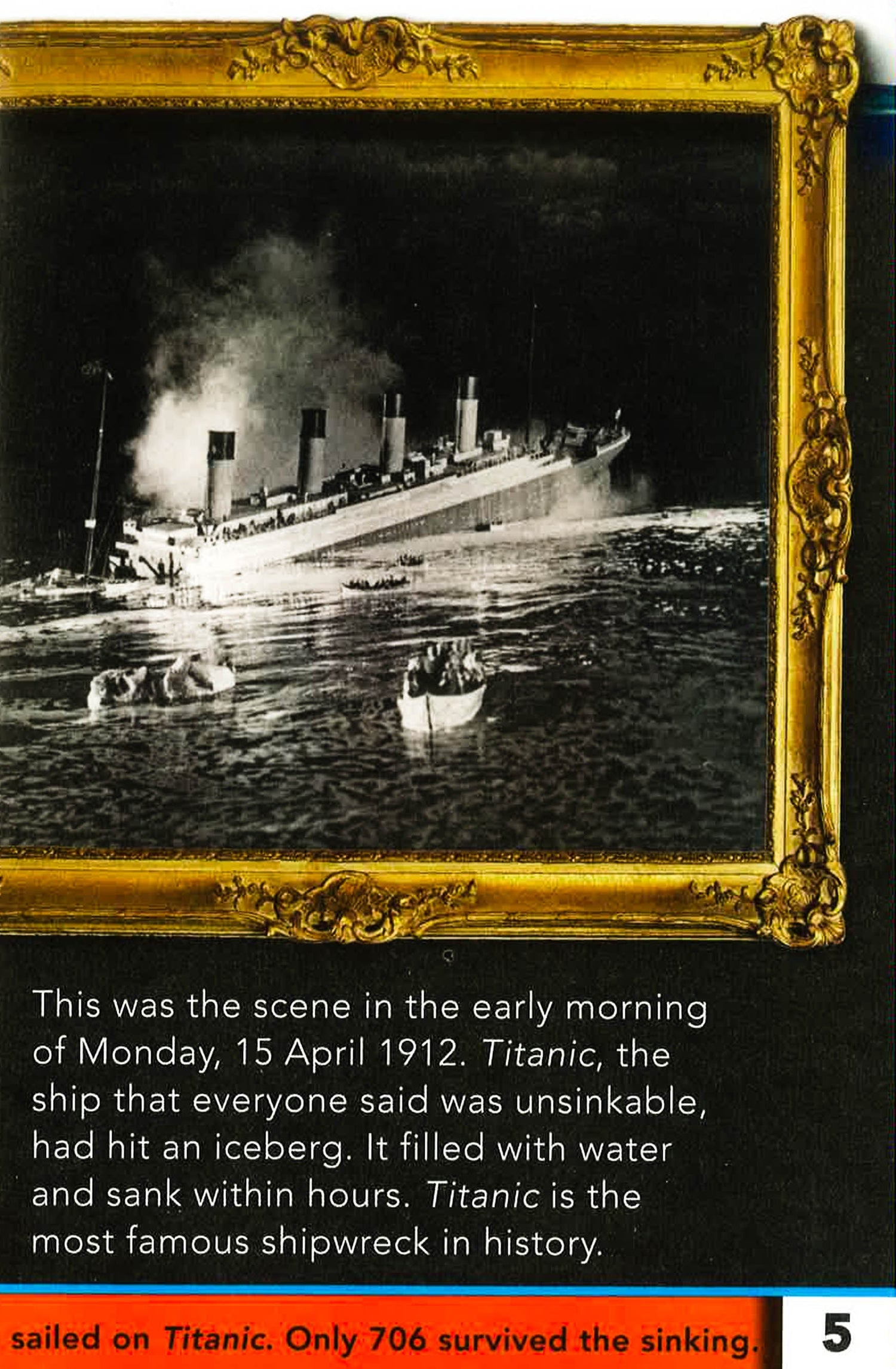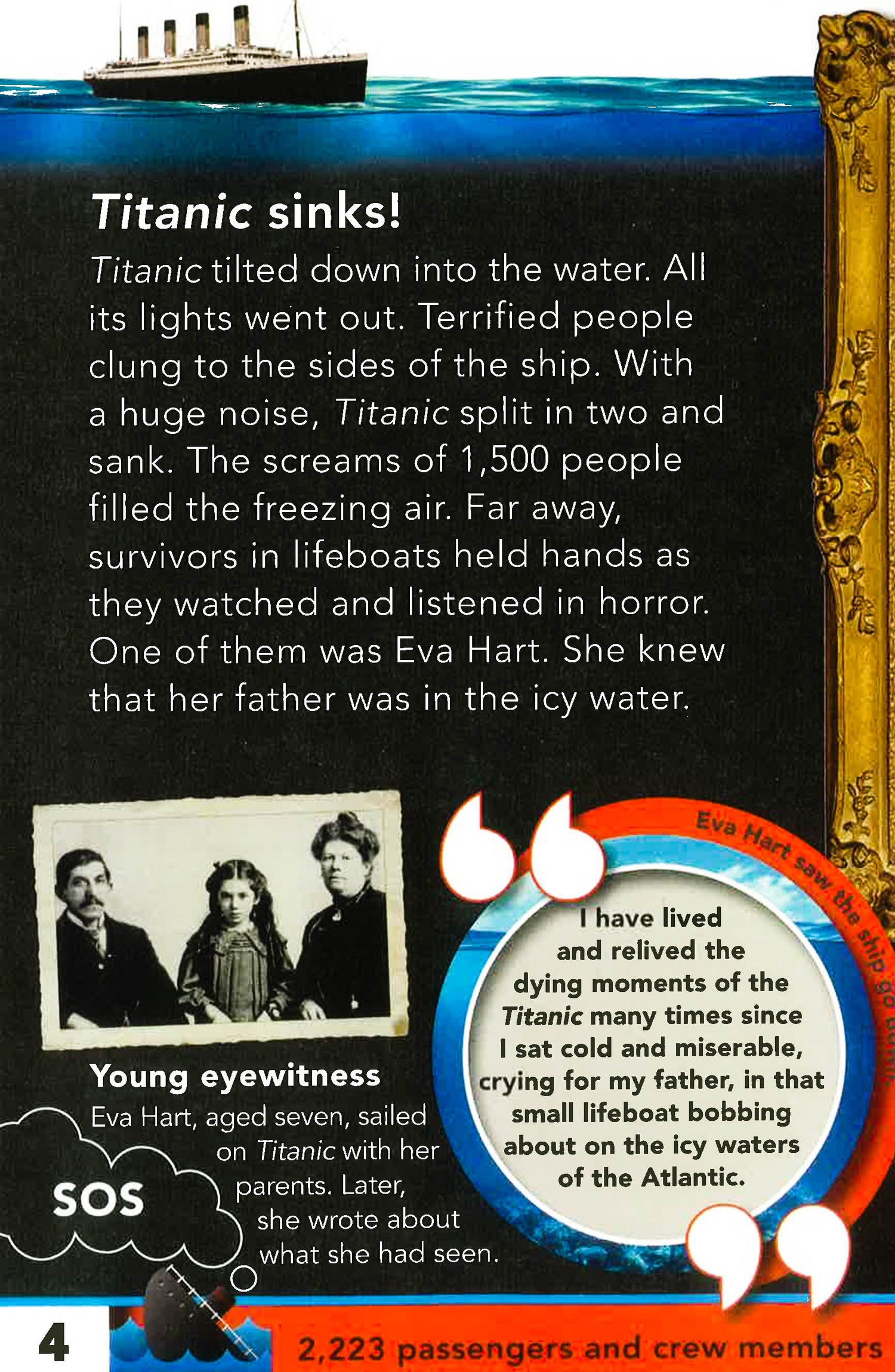 Discover More Readers: Titanic is a Level 3 Reader (ages 7-9) for independent learners with timelines, vivid charts, exciting photographs and technical vocabulary. Independent readers can examine the technology of the ship, and read eyewitness accounts through the eyes of Eva Hart, a seven-year-old girl who survived the sinking of RMS Titanic \- perfect for budding scientists. Comes with a free digital book featuring extra content, games and activities, plus audio and video enhancements.