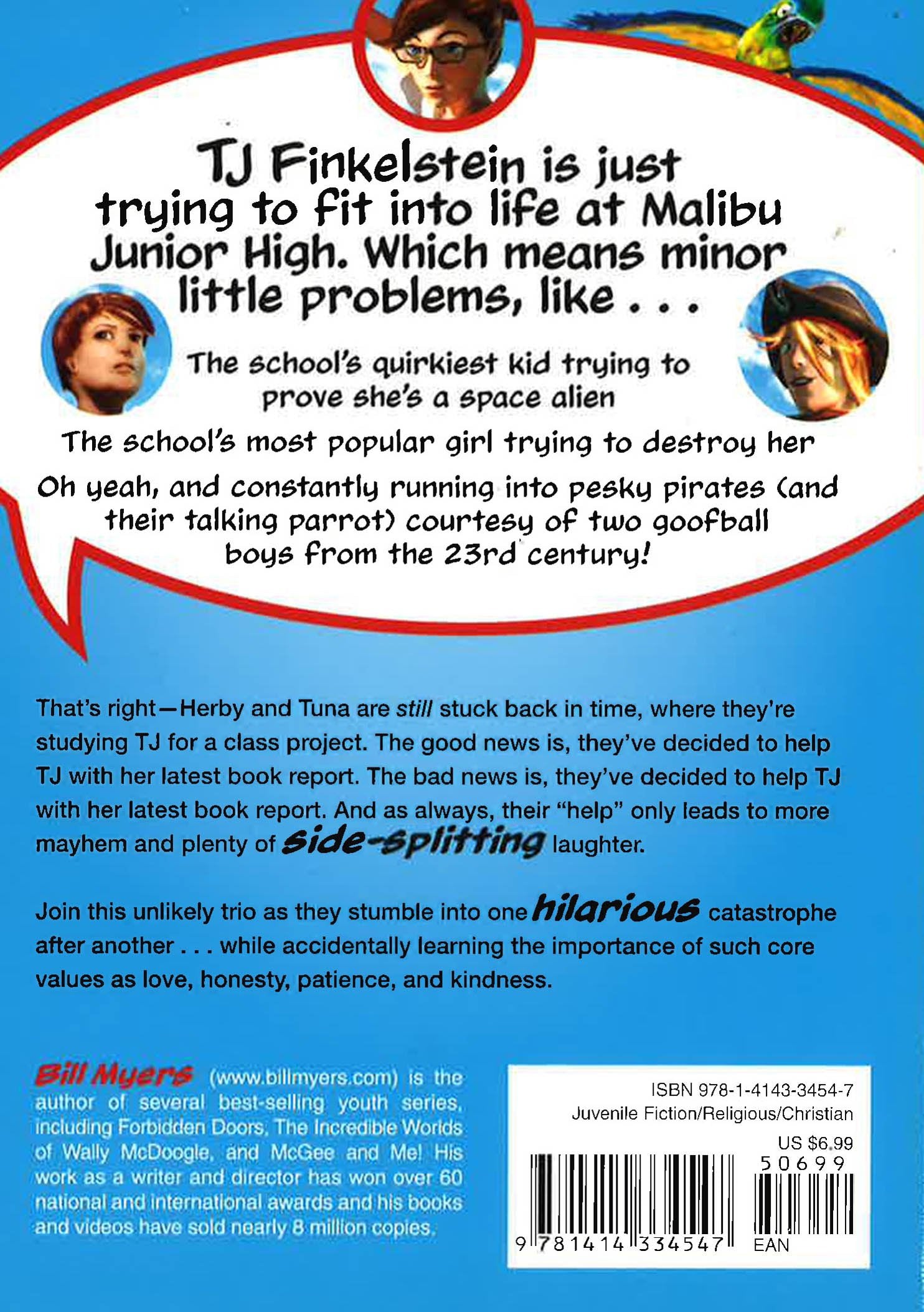 This six-book series centers around two 23rd century goofballs, Tuna and Herby, who travel back in time to study TJ Finkelstein for their history project. TJ will someday become a great leader who demonstrates honesty, integrity, thoughtfulness, self-sacrifice, respect for others--all traits she hones and grasps through her adventures in this series. Unfortunately, Tuna and Herby get stuck in TJ's time (modern day), so she has to deal with their schemes while juggling the normal issues of a seventh grader who has moved to a new city, is trying to fit in, and is coping with her mother's death and her family's new life. In AAAARGH!!!, Tuna and Herby try to help TJ with a book report by getting the author to write it for her, but all three of them quickly see the consequences of cheating spiral out of control. Meanwhile, TJ's cute neighbor and classmate Chad Steel is getting ready for a big surfing competition--and learning his own lesson about honesty.