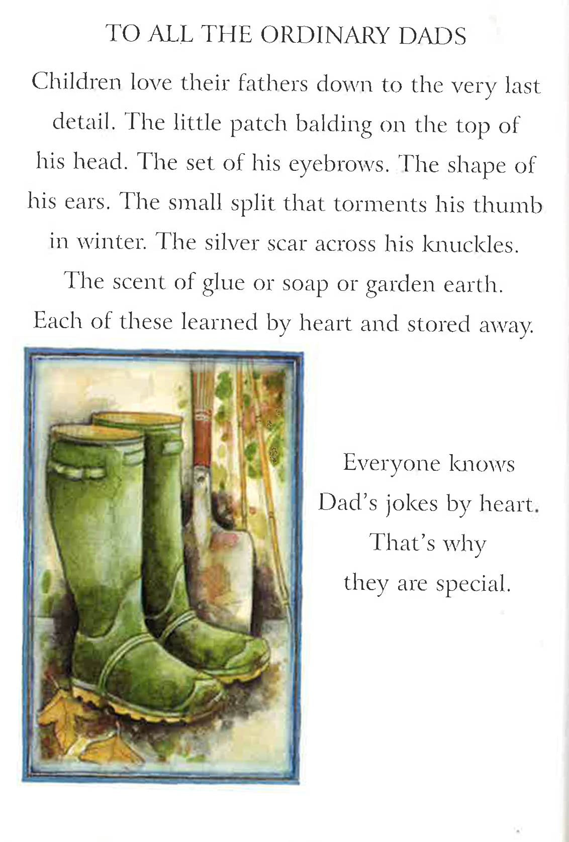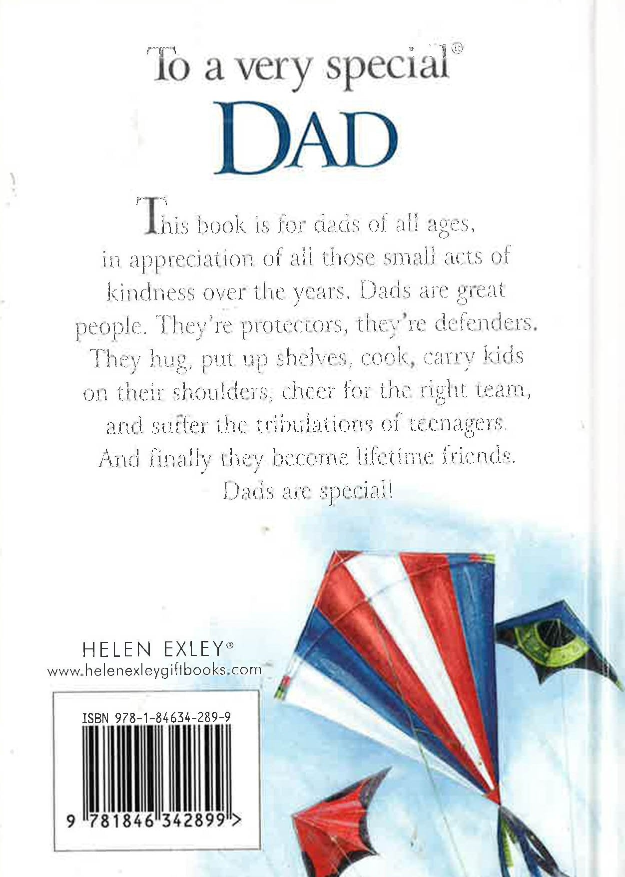 This book is for dads of all ages, in appreciation of all those small acts of kindness over the years. Dads are great people. They're protectors, they're defenders. They hug, put up shelves, cook, carry kids on their shoulders, cheer for the right team, and suffer the tribulations of teenagers. And finally they become life long friends. Dads are special!
