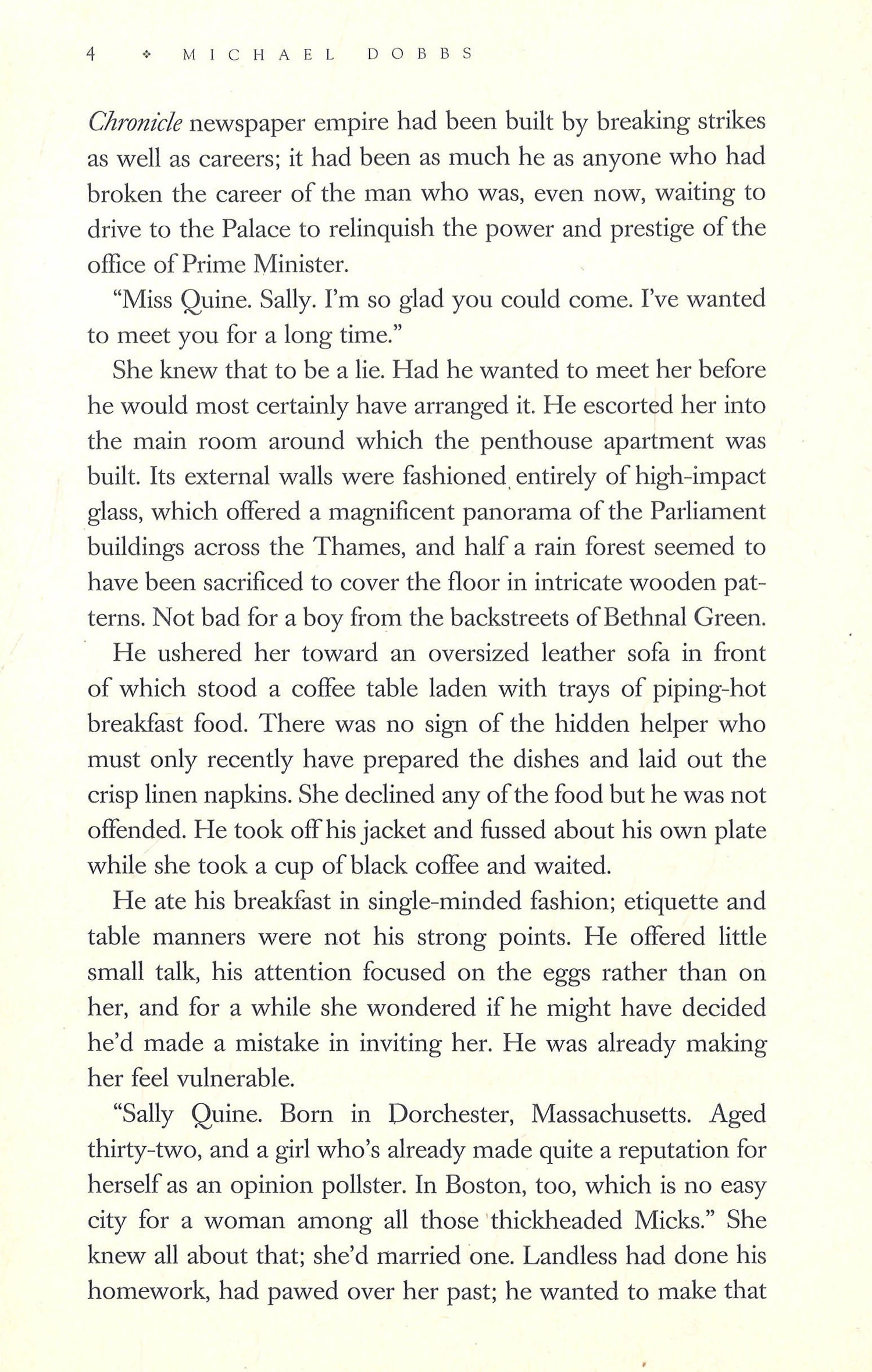 'With a friend like Michael Dobbs, who needs enemies? A good romp, and gloriously cheeky. Dobbs' books grab because of their authenticity - the man knows his stuff.' - The Times