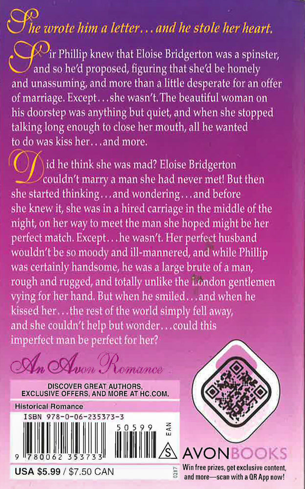 Did he think she was mad? Eloise Bridgerton couldn't marry a man she had never met! But then she started thinking . . . and wondering . . . and before she knew it, she was in a hired carriage in the middle of the night, on her way to meet the man she hoped might be her perfect match. Except . . . he wasn't. Her perfect husband wouldn't be so moody and ill-mannered, and while Phillip was certainly handsome, he was a large brute of a man, rough and rugged, and totally unlike the London gentlemen vying for her hand. But when he smiled . . . and when he kissed her . . . the rest of the world simply fell away, and she couldn't help but wonder . . . could this imperfect man be perfect for her?