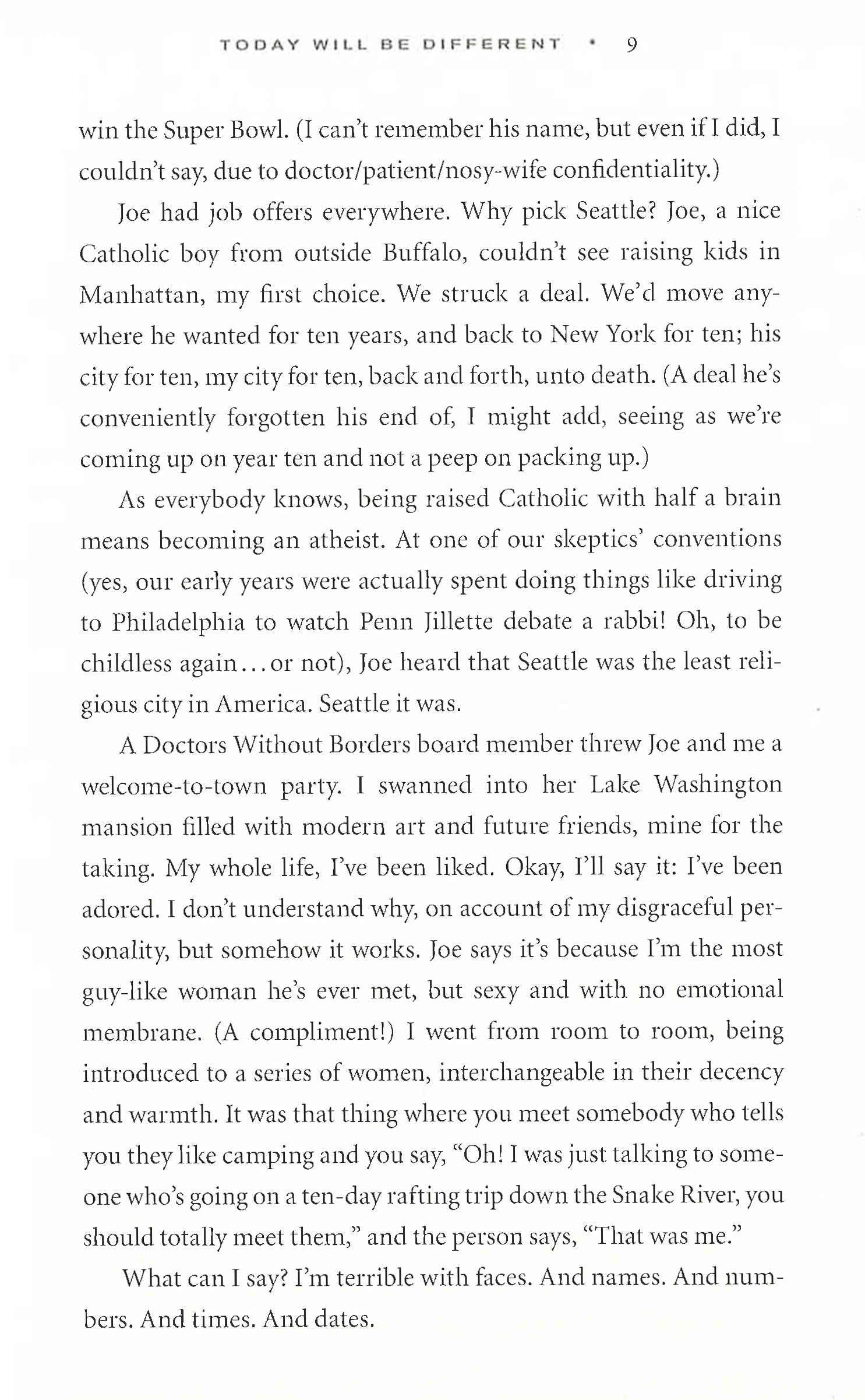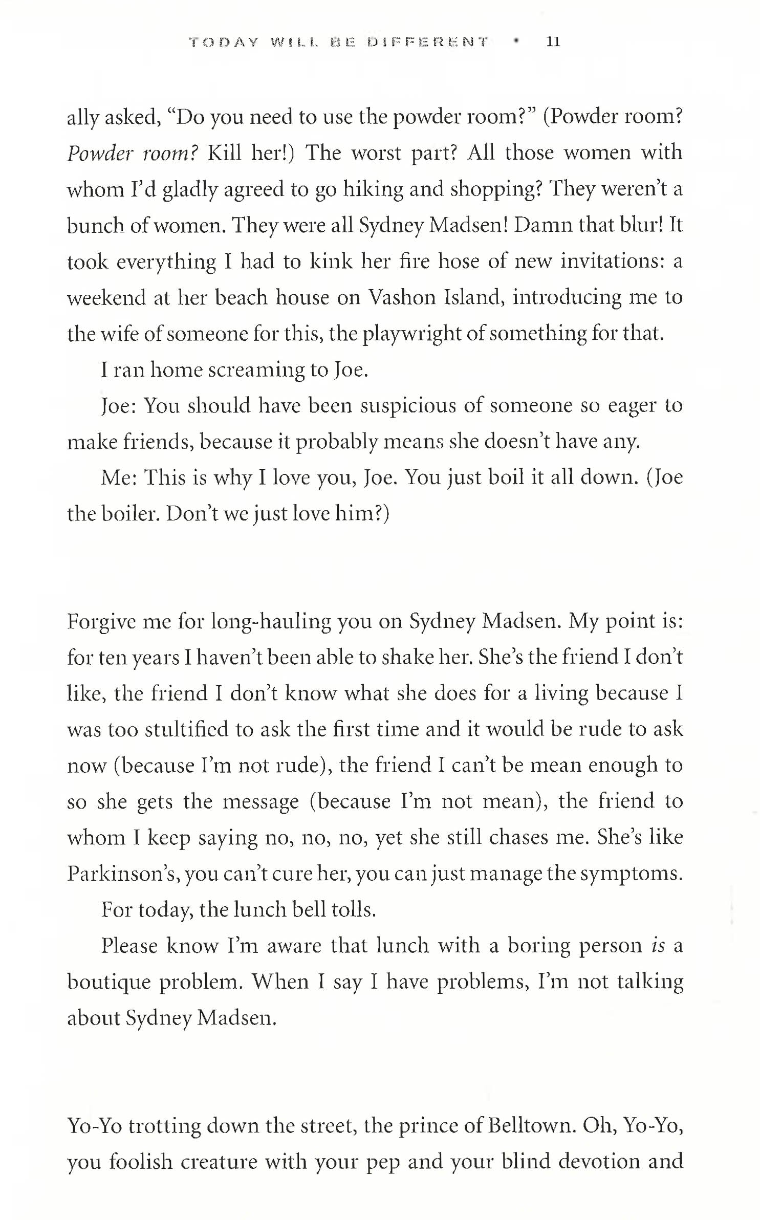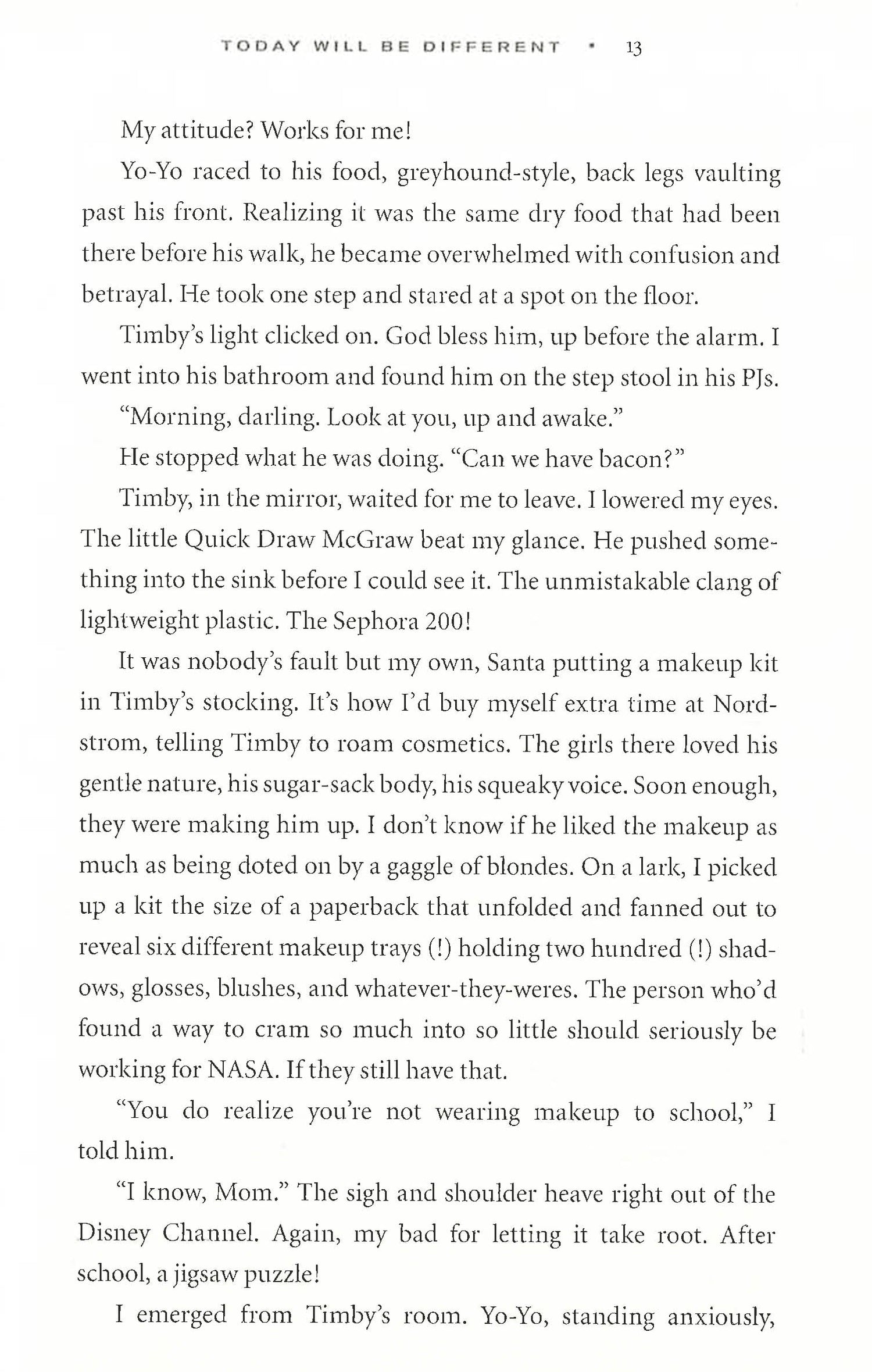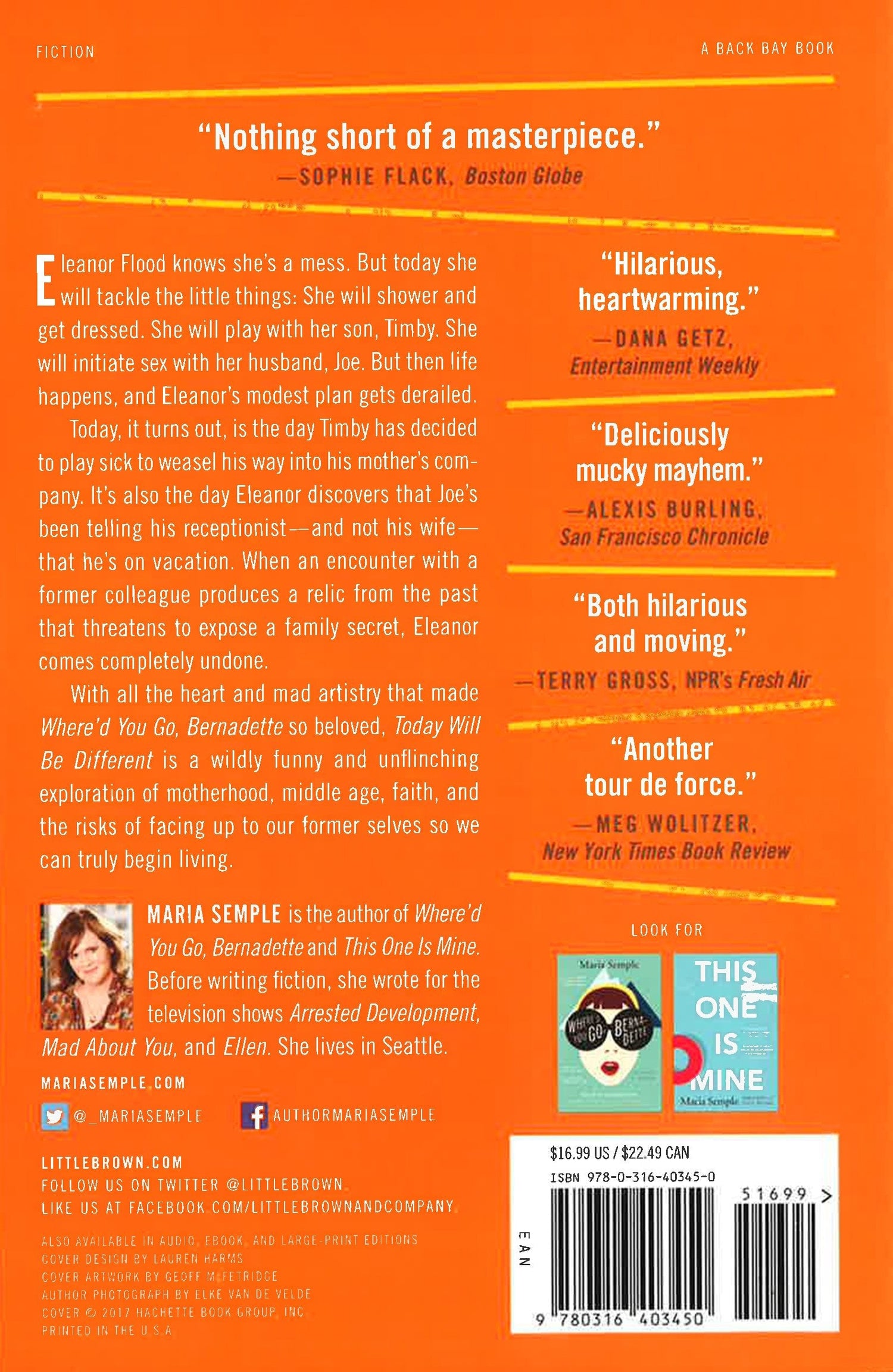 Eleanor knows she's a mess. But today, she will tackle the little things. She will shower and get dressed. She will have her poetry and yoga lessons after dropping off her son, Timby. She won't swear. She will initiate sex with her husband, Joe. But before she can put her modest plan into action - life happens. Today, it turns out, is the day Timby has decided to fake sick to weasel his way into his mother's company. It's also the day Joe has chosen to tell his office - but not Eleanor - that he's on vacation. Just when it seems like things can't go more awry, an encounter with a former colleague produces a graphic memoir whose dramatic tale threatens to reveal a buried family secret. TODAY WILL BE DIFFERENT is a hilarious, heart-filled story about reinvention, sisterhood, and how sometimes it takes facing up to our former selves to truly begin living.