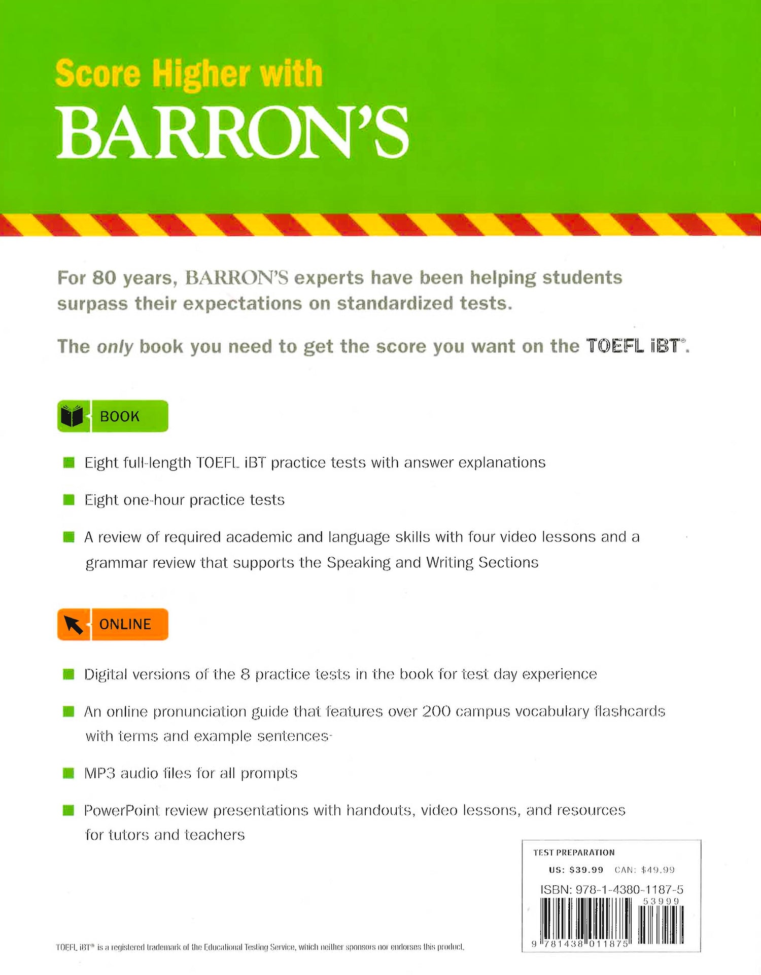 Eight online full-length TOEFL iBT practice tests with answer explanationsA review of required academic and language skills with four video lessons and a grammar review that supports the Speaking and Writing SectionsAn online pronunciation guide that features over 200 campus flash cards with vocabulary terms and example sentencesMP3 audio files for all promptsA general overview of the TOEFL iBTPowerPoint review presentations with handouts, video lessons; and resources for tutors and teachers