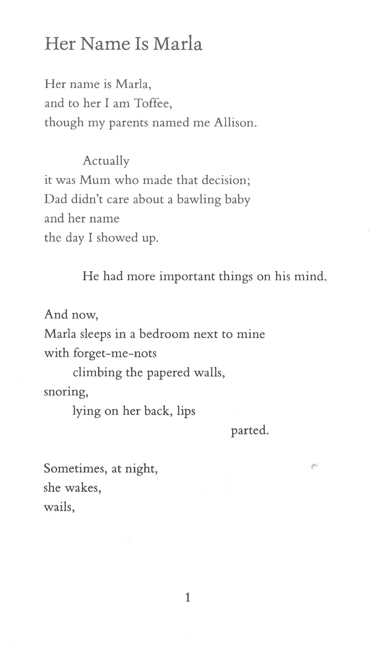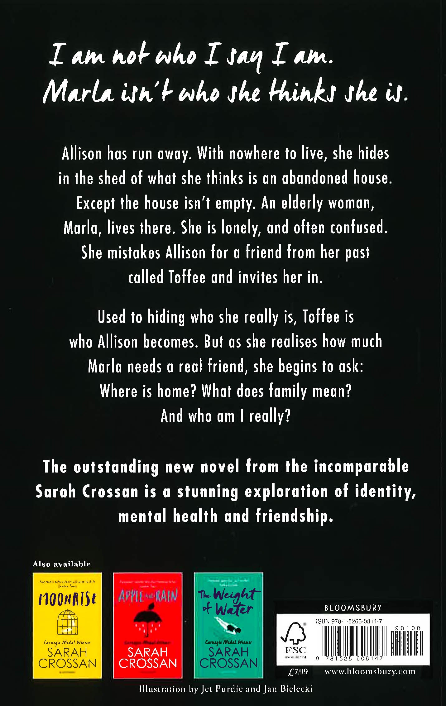 WINNER OF THE BOOKS ARE MY BAG YA AWARD 2019 The astonishing new novel from the incomparable, multi-award-winning and Laureate na nOg Sarah Crossan. I am not who I say I am. Marla isn't who she thinks she is. I am a girl trying to forget. Marla is a woman trying to remember. Allison has run away from home and with nowhere to live finds herself hiding out in the shed of what she thinks is an abandoned house. But the house isn't empty. An elderly woman named Marla, with dementia, lives there - and she mistakes Allison for an old friend from her past called Toffee. Allison is used to hiding who she really is, and trying to be what other people want her to be. And so, Toffee is who she becomes. After all, it means she has a place to stay. There are worse places she could be. But as their bond grows, and Allison discovers how much Marla needs a real friend, she begins to ask herself -where is home? What is a family? And most importantly, who am I, really?