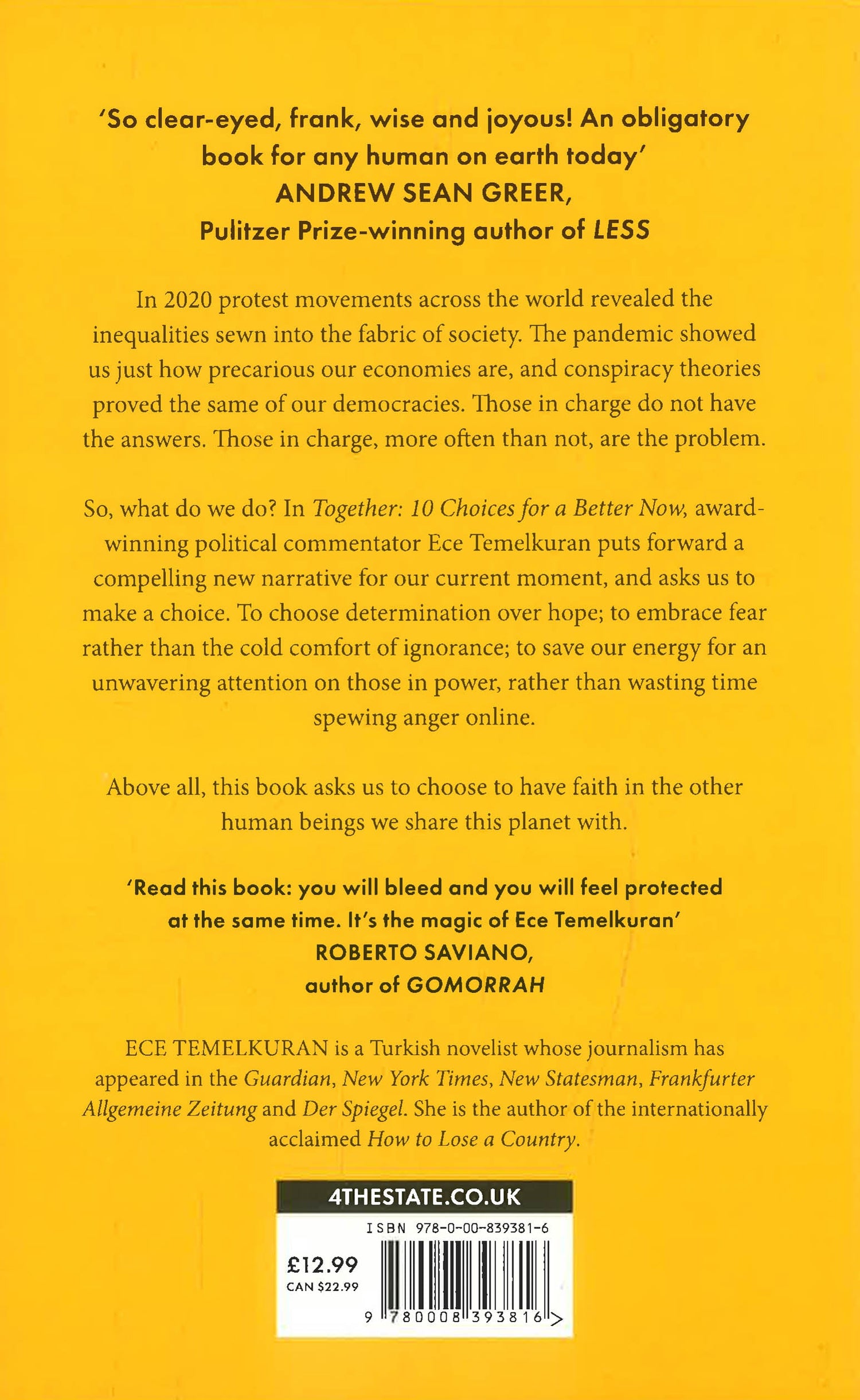 So, what do we do? In Together: 10 Choices for a Better Now, award-winning political commentator Ece Temelkuran puts forward a compelling new narrative for our current moment, not for some idealised future but for right now, and asks us to make a choice. To choose determination over hope; to embrace fear rather the cold comfort of ignorance; to save our energy for an unwavering attention on those in power and the destructive systems they uphold, rather than wasting time spewing out anger and outrage online.