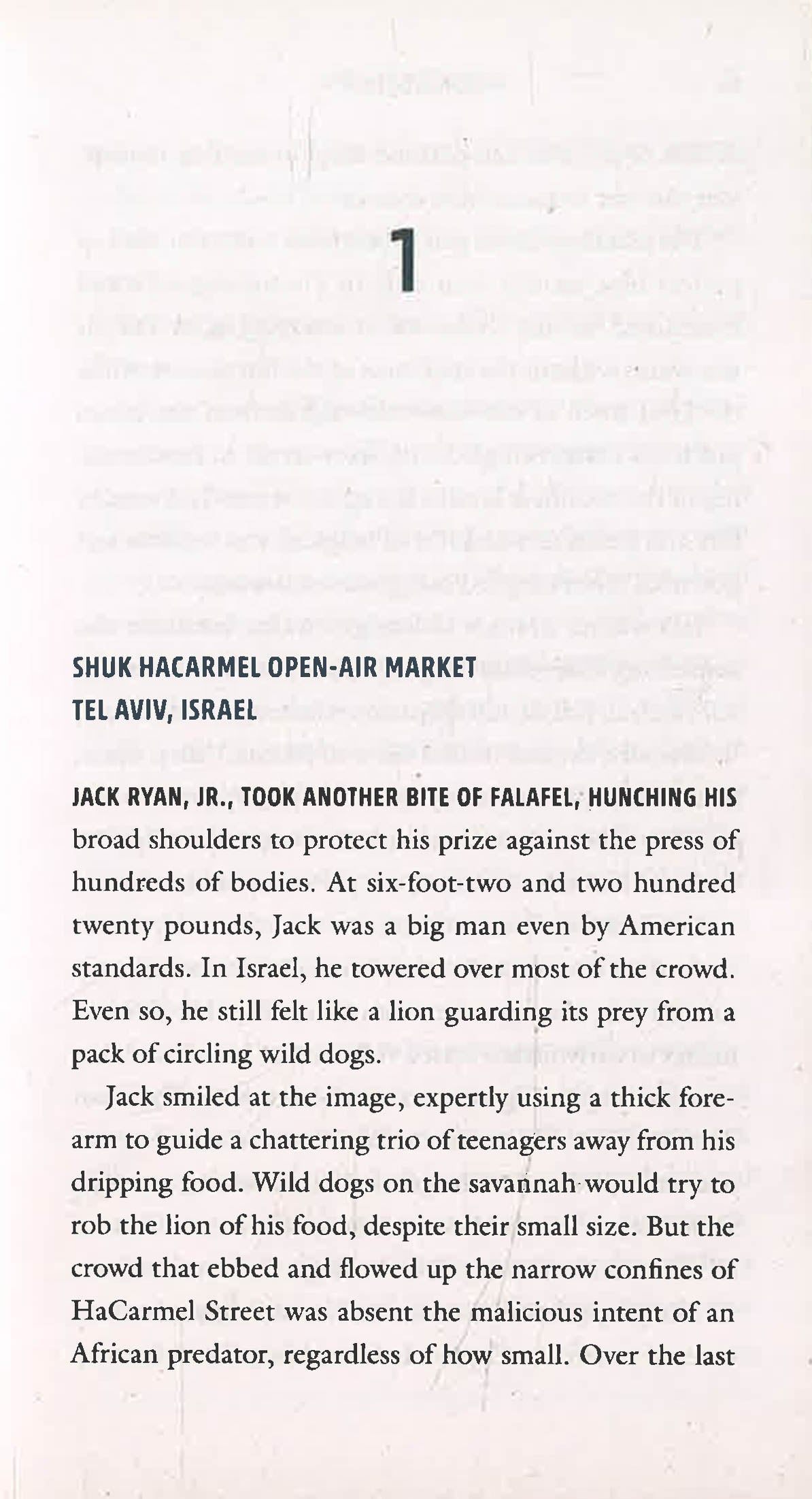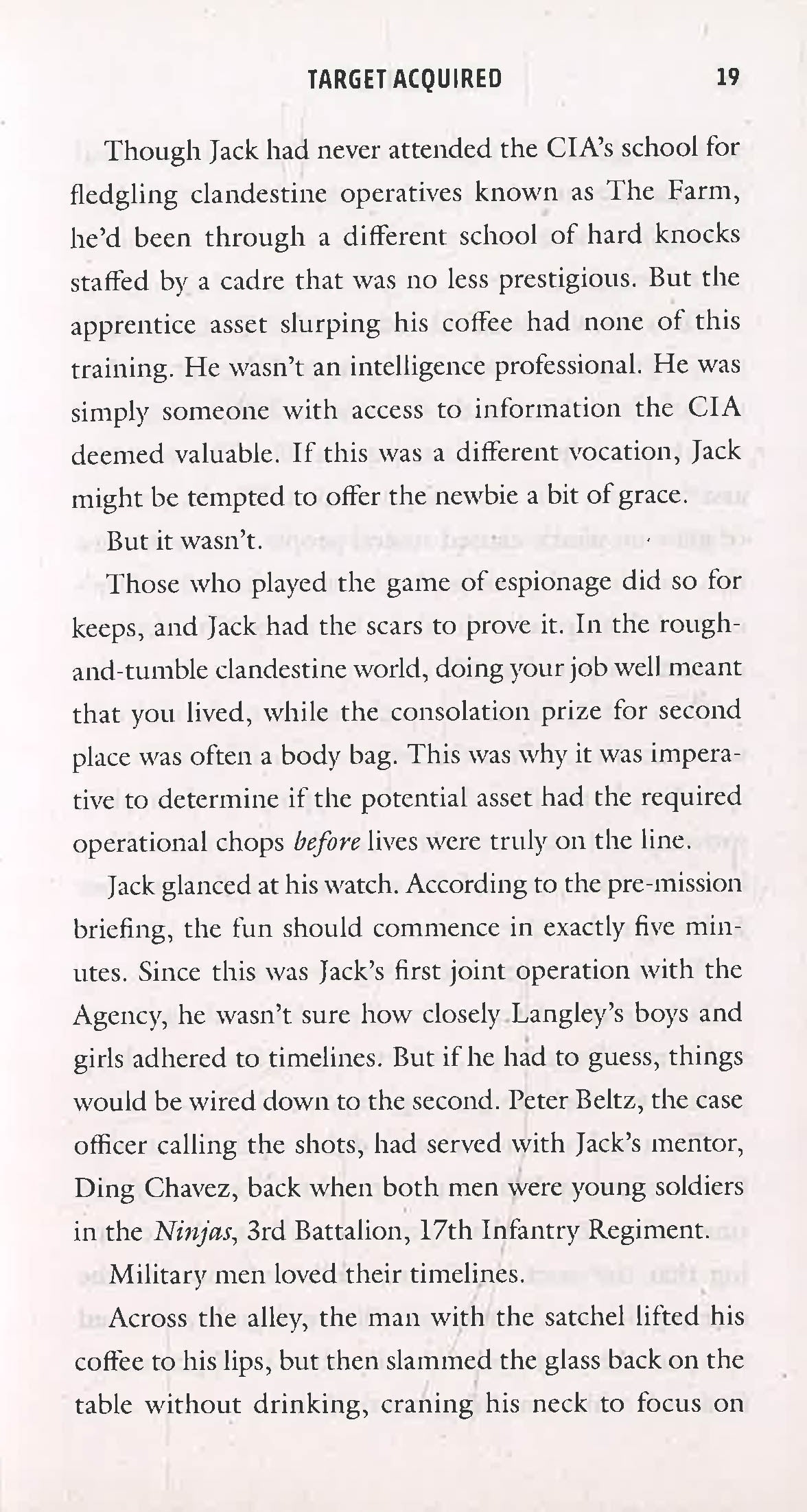 Jack Ryan, Jr., would do anything for Ding Chavez. That's why Jack is currently sitting in an open-air market in Israel, helping a CIA team with a simple job. The man running the mission, Peter Beltz, is an old friend from Ding's Army days. Ding hadn't seen his friend since Peter's transfer to the CIA eighteen months prior and intended to use the assignment to reconnect. Unfortunately, Ding had to cancel at the last minute and asked Jack to take his place. It's a cushy assignment—a trip to Israel in exchange for a couple hours of easy work, but Jack could use the downtime after his last operation.