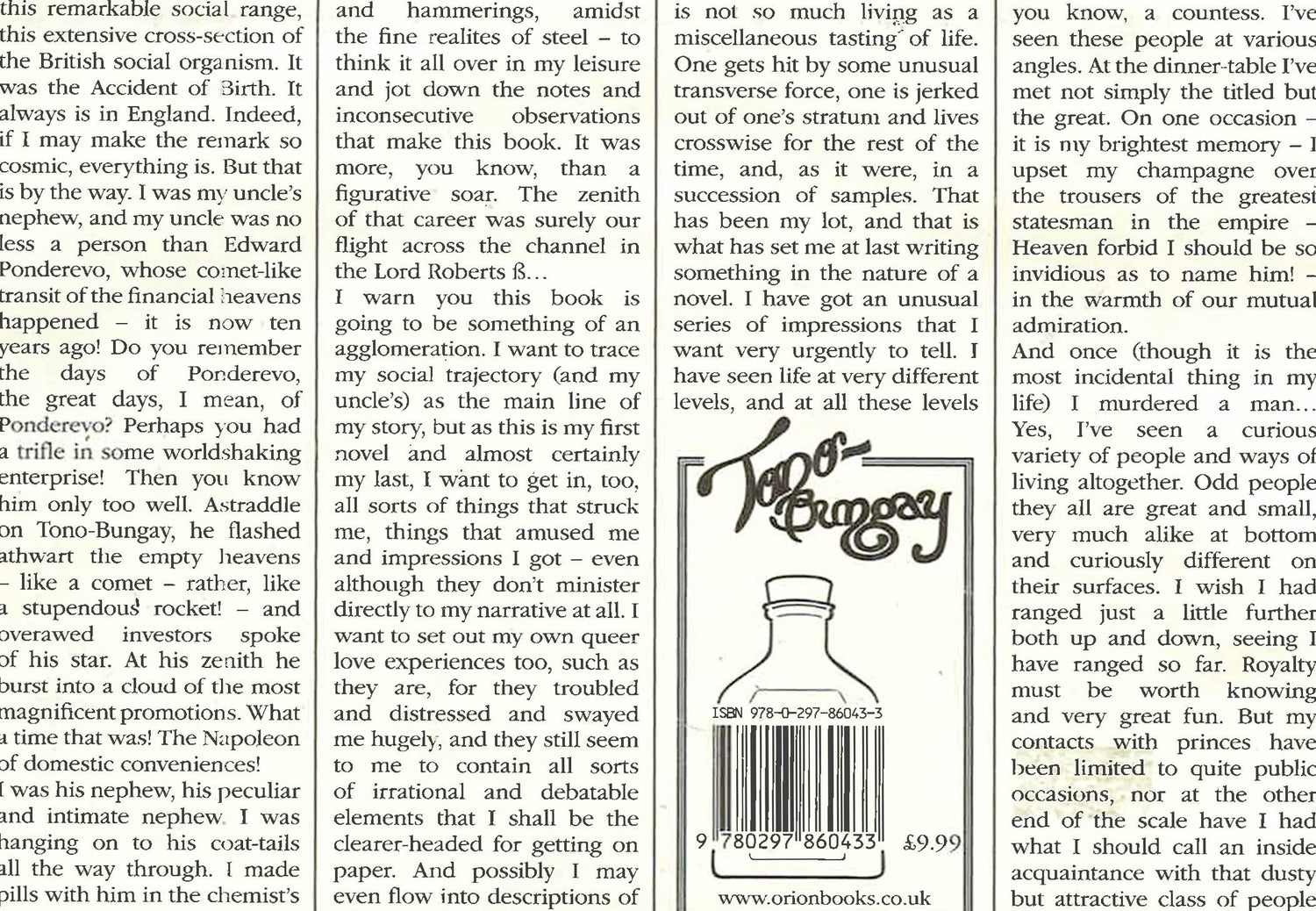 George Ponderevo, a student of science, is enlisted to help with the promotion of Tono-Bungay. Tono-Bungay is a harmful stimulant disguised as a miraculous cure-all, the creation of his ambitious uncle Edward. As the tonic prospers, George experiences a swift rise in social status, elevating him to riches and opportunities that he had never imagined, nor indeed desired. Meanwhile, George ricochets romantically between his unsuccessful marriage to Marion, his affair with the liberated Effie and his doomed relationship with the Hon. Beatrice Normandy, a childhood friend. But the Tono-Bungay empire eventually over-extends itself and George must try to prop up his uncle's finances by stealing the radioactive compound 'quap' from an island near Africa...