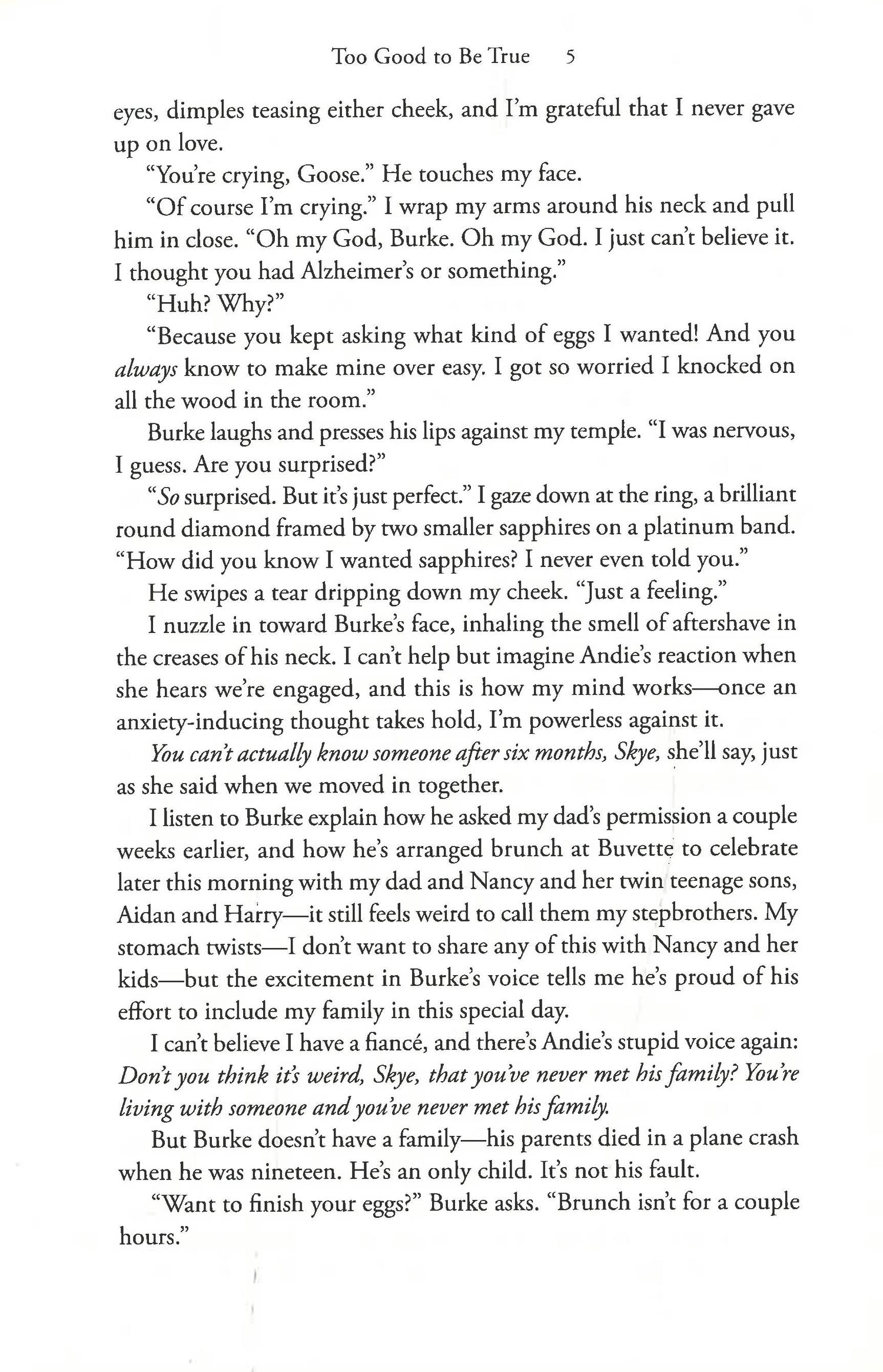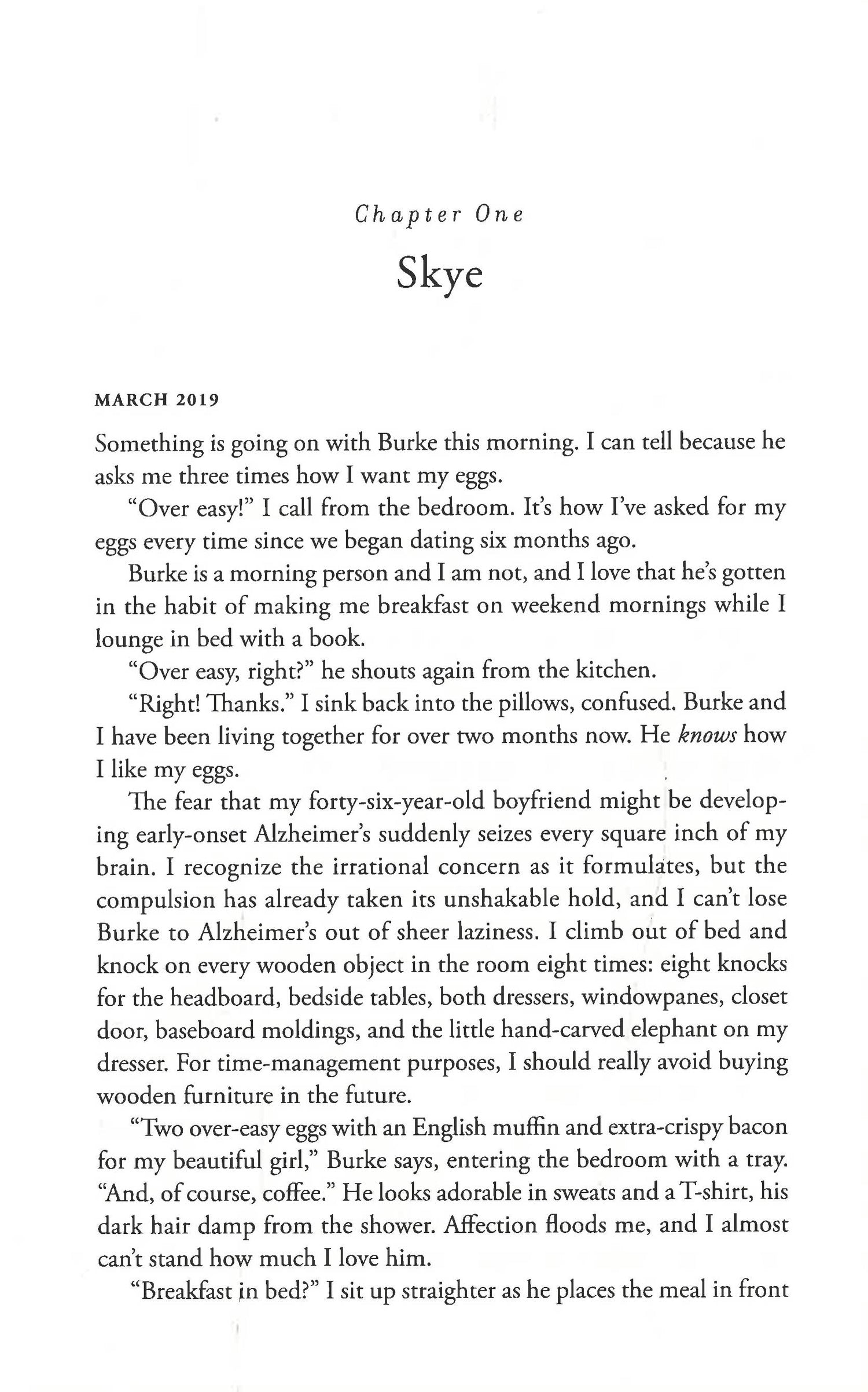 Skye Starling is overjoyed when her boyfriend, Burke Michaels, proposes after a whirlwind courtship. Though Skye seems to have the world at her fingertips--she's smart, beautiful, and from a well-off family--she's also battled crippling OCD ever since her mother's death when she was eleven, and her romantic relationships have suffered as a result.
