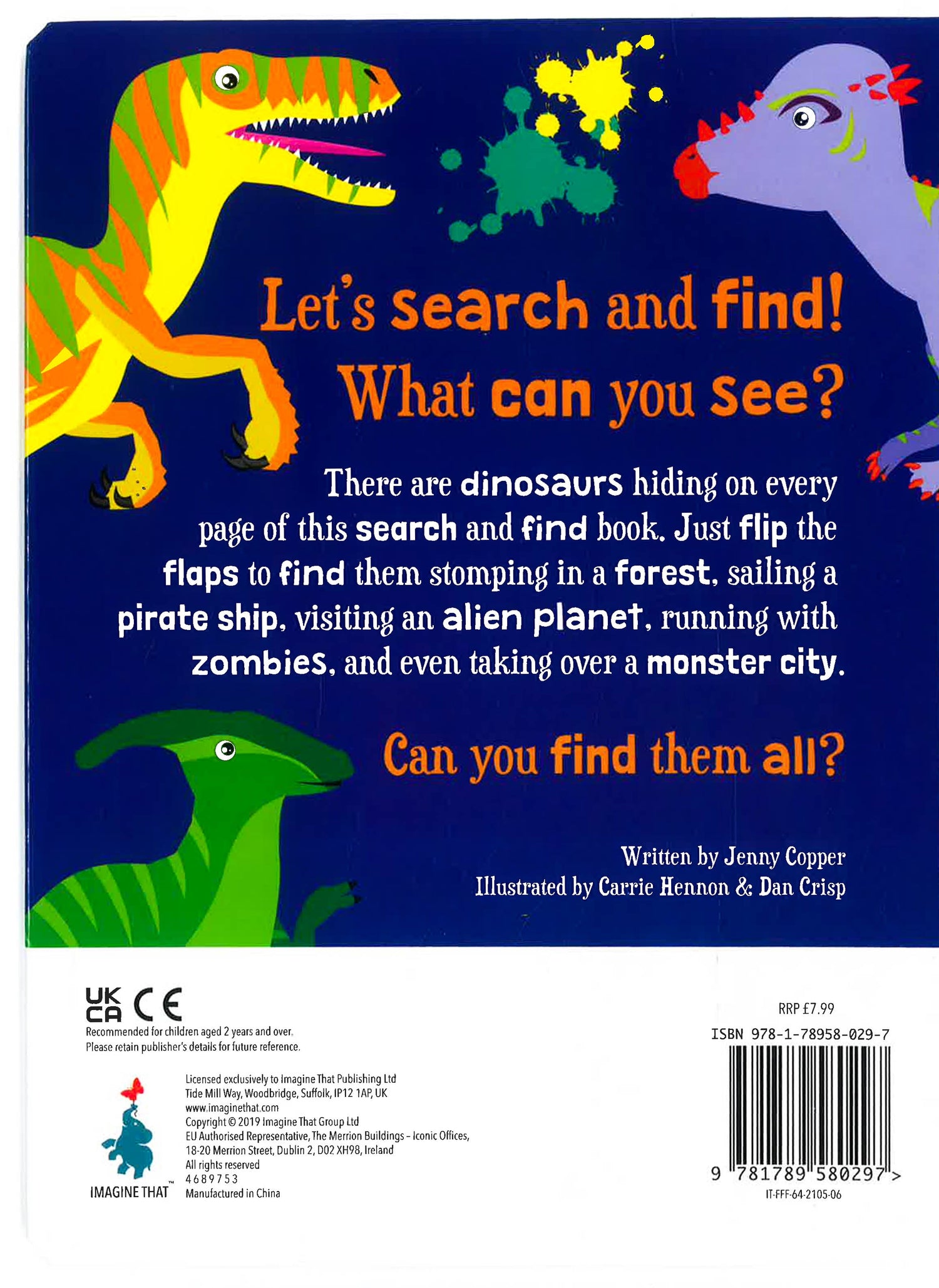 Let's search and find! What can you see?There are monsters hiding on every page of this search and find book. Just flip the flaps to find them taking over a city, sailing a pirate ship, running with zombies, roaring with dinosaurs and even visiting an alien planet!The fun rhyming words and the search and find activity encourages word and picture association, which helps young children develop language and early reading skills.Can you find them all?