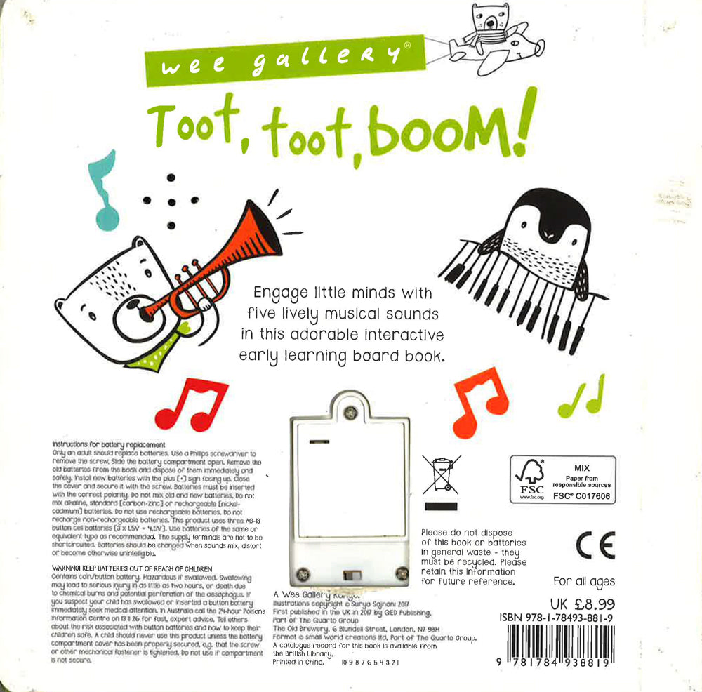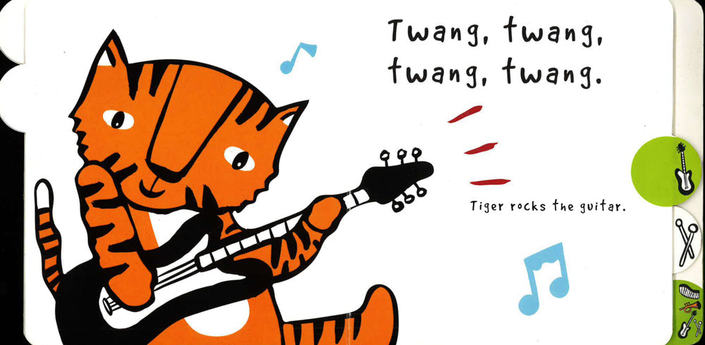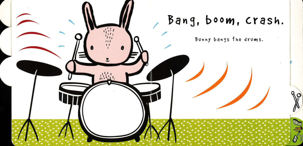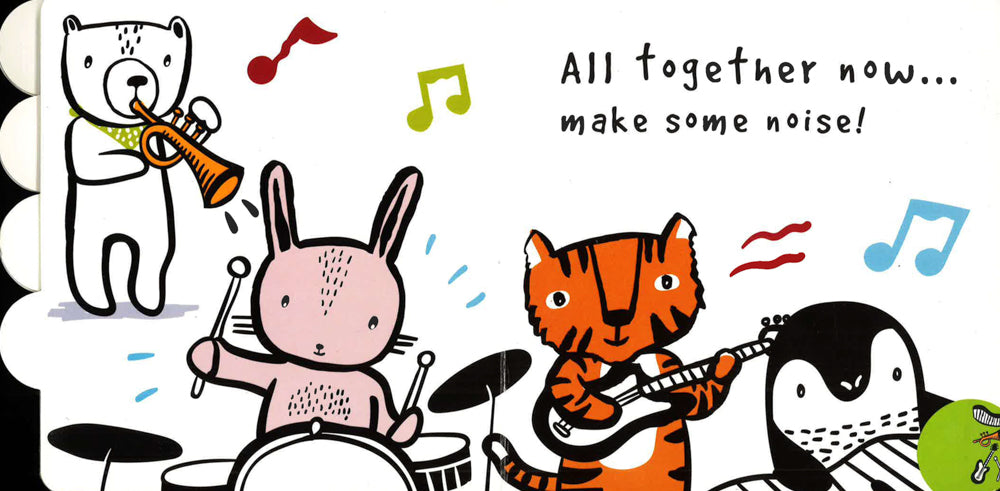 It's time to make some noise! Listen to the sounds the animals make as they play their big bold instruments and join in yourself as bear blows the trumpet, tiger rocks the guitar, bunny bangs the drum and penguin plays the piano. A wonderfully simple sound book with fun, noisy sound effects that helps babies recognise familiar sounds and introduces older toddlers to descriptive words. Durable and tactile, this fun and engaging sound book is ideal for the nursery, the play centre, the changing area - wherever you and your child are!