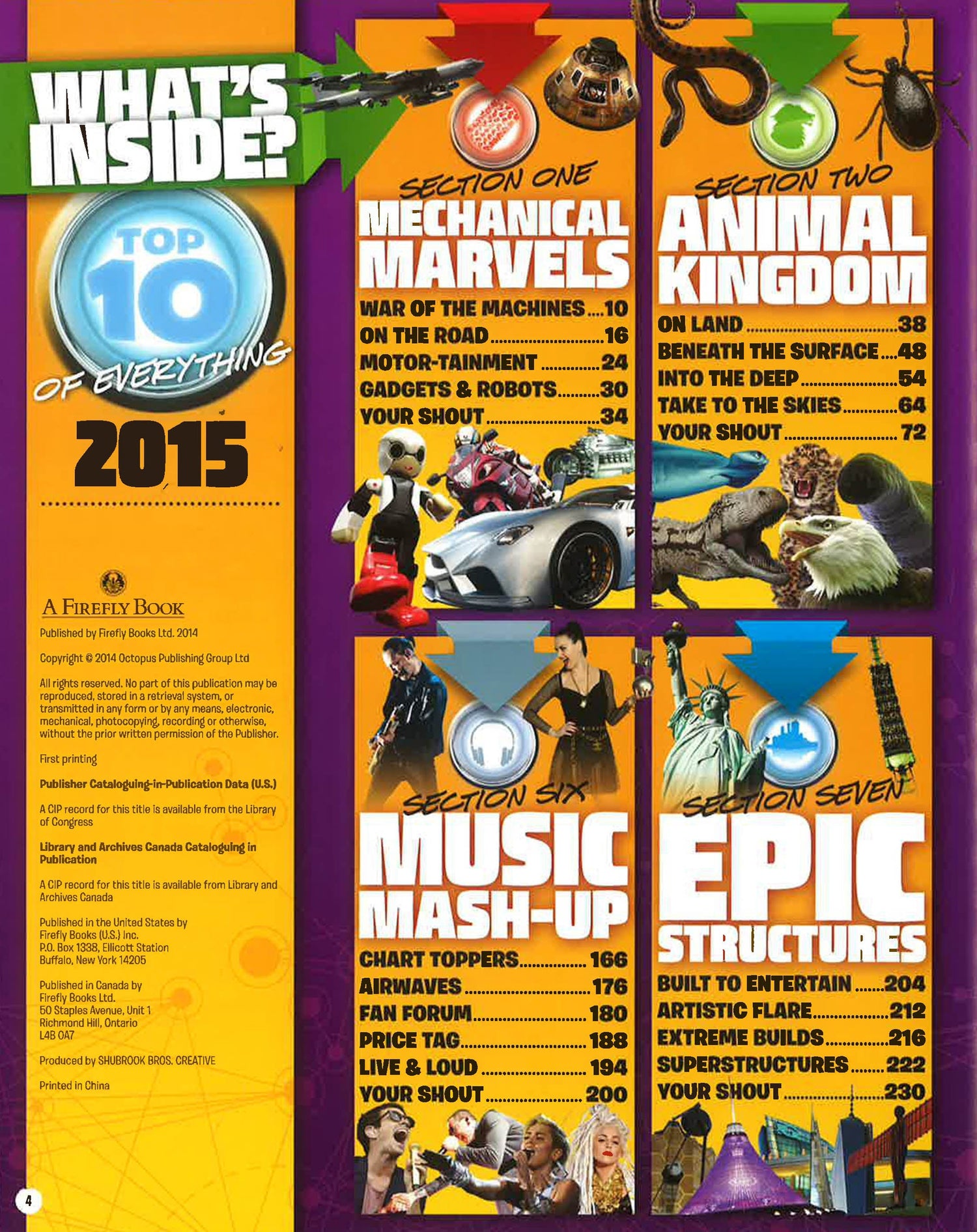 More than just number 1. A bestseller is back! The popular Top 10 series was packed with pictures and charts and information. The 2015 edition will be bigger (320 pages vs. 256 pages) and once again deliver the tallest scariest windiest fastest lightest winning-est slowest worst free-est deadliest loudest most-wanted brightest sleepiest longest reigning deepest driest most valuable richest wettest most aggressive heaviest cleanest of games books basketball players Olympic athletes buildings bridges pop music twitter followers movies oil production race cars Oscar winners paintings and much more! Packed with unusual comparisons, special features, awe-inspiring photographs and holographic foil histories, engineering feats, and thousands of facts and pictures, the "Top 10 of Everything 2015" will be one of the most desired and appreciated reference books of the 2014 season.