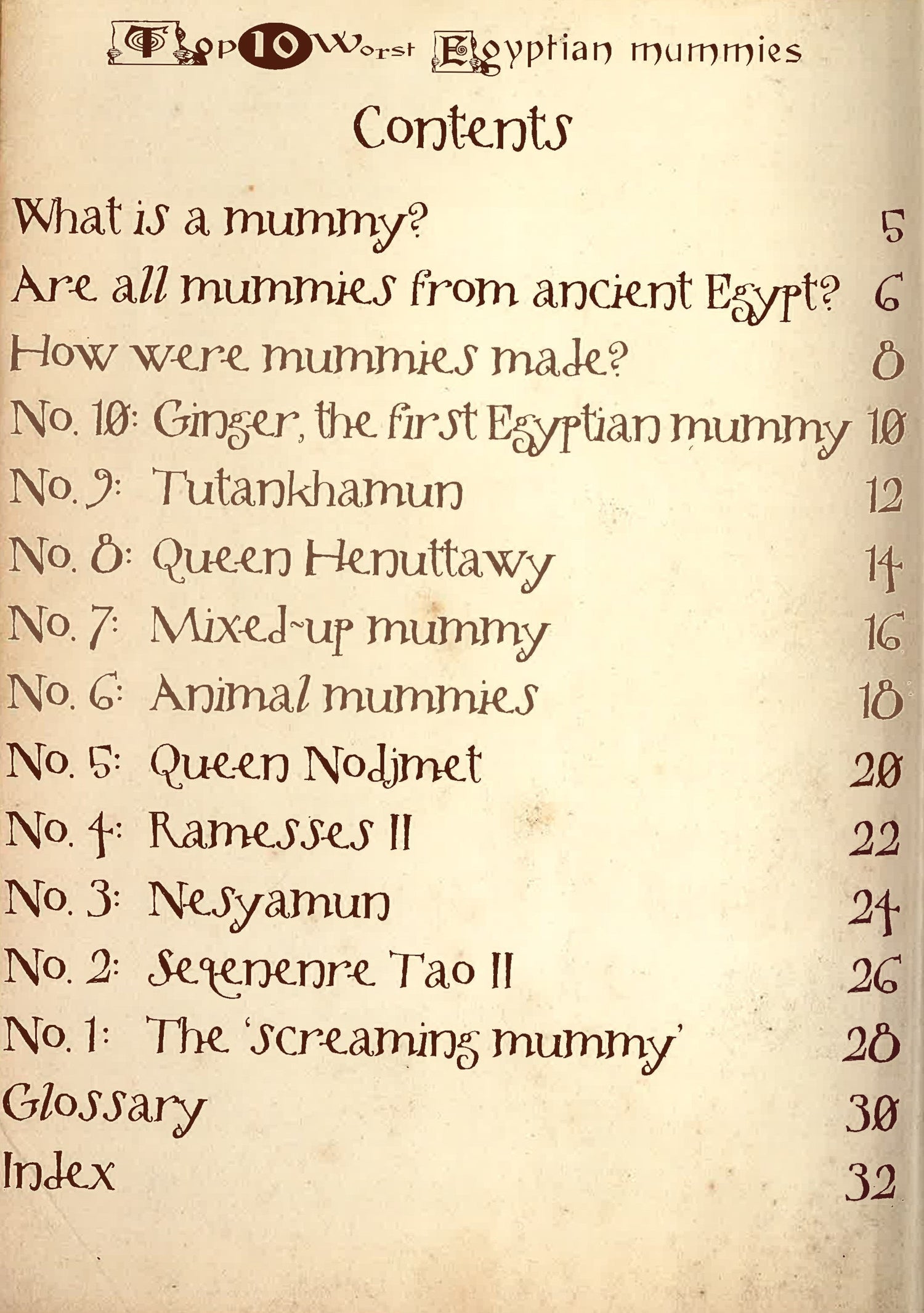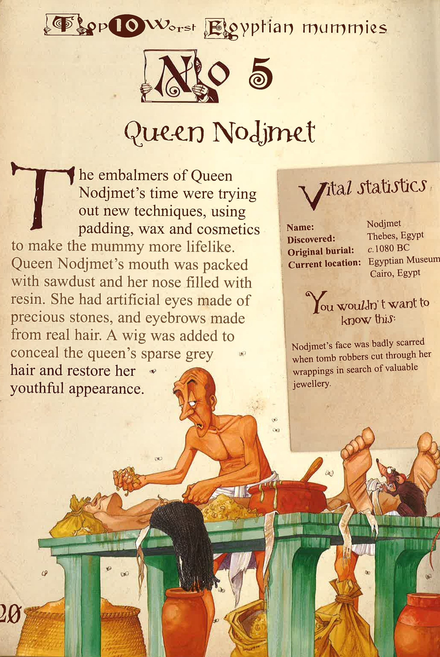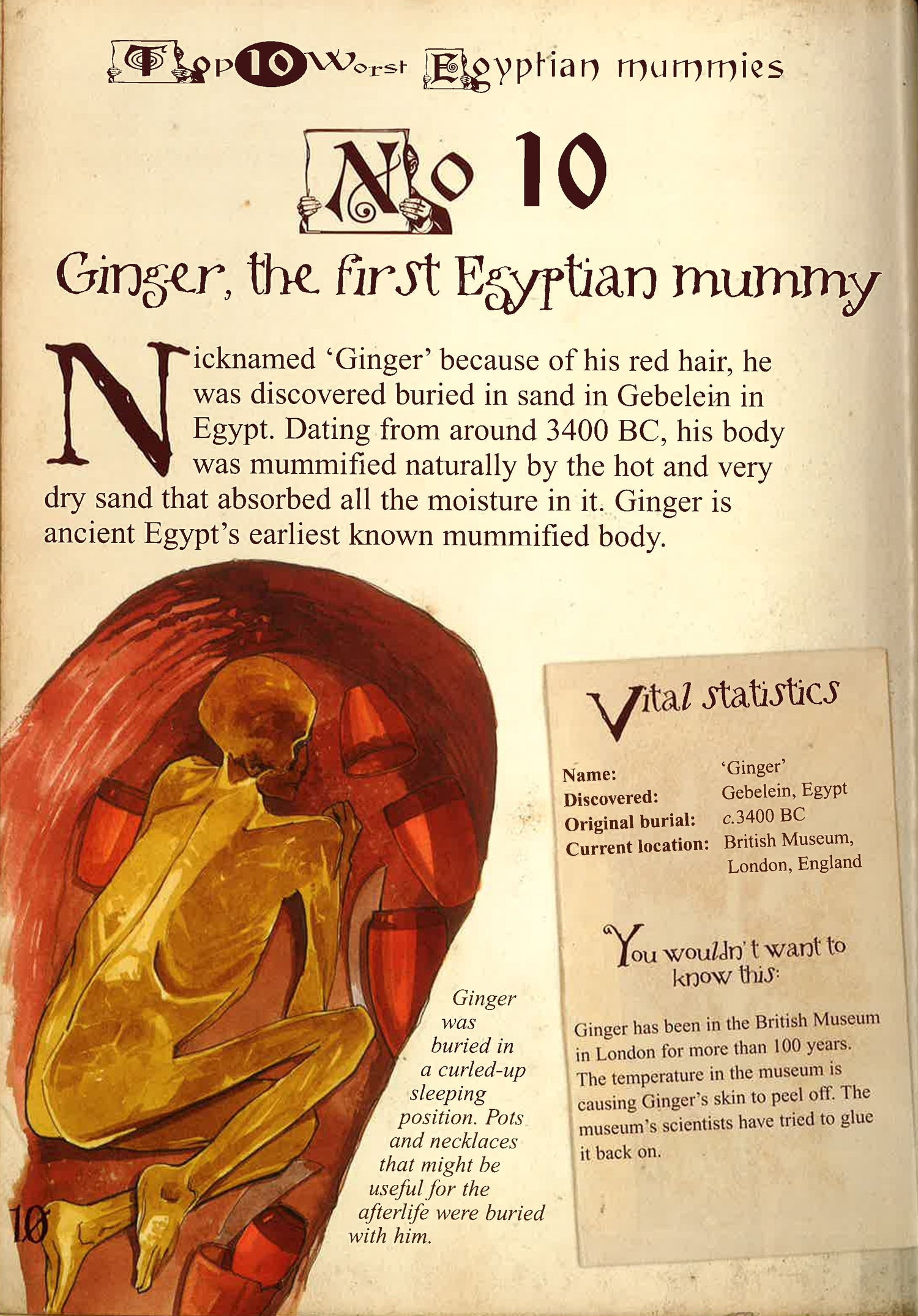 From 'Ginger', the earliest known Egyptian mummy, through the young pharaoh Tutankhamun, up to the truly terrifying 'Screaming Mummy', Top Ten Worst Creepy Egyptian Mummies You Wouldn't Want To Meet explores some the most gruesome mummies in the history of Egyptology. The book also looks at the lives and cultures of the Ancient Egyptians, examining how, why, when and where they mummified their dead for the journey to the afterlife. The Top Ten Worst series counts down the ghastliest ghoulies, the most petrifying pirates, the angriest animals, the nastiest natural disasters, and much, much more! Colourful and humourous illustrations accompany the terrifying text, which features information on how to survive everything from the worst volcanic eruption to the world's deadliest animal. Each title explores the facts and the science behind each subject as well as looking at their impact on the world at large. Topics and subjects are put in a geographical and historical context so the reader