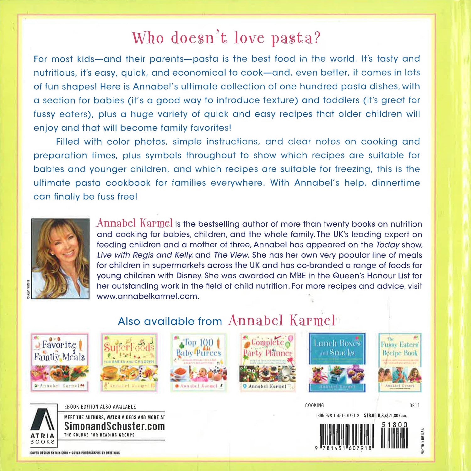 Who doesn't love pasta? For most kids--and their parents--pasta is the best food in the world. It's tasty and nutritious, it's easy, quick, and economical to cook--and, even better, it comes in lots of fun shapes! Here is Annabel's ultimate collection of one hundred pasta dishes, with a section for babies (it's a good way to introduce texture) and toddlers (it's great for fussy eaters), plus a huge variety of quick and easy recipes that older children will enjoy and that will become family favorites! Filled with color photos, simple instructions, and clear notes on cooking and preparation times, plus symbols throughout to show which recipes are suitable for babies and younger children, and which recipes are suitable for freezing, this is the ultimate pasta cookbook for families everywhere. With Annabel's help, dinnertime can finally be fuss free!