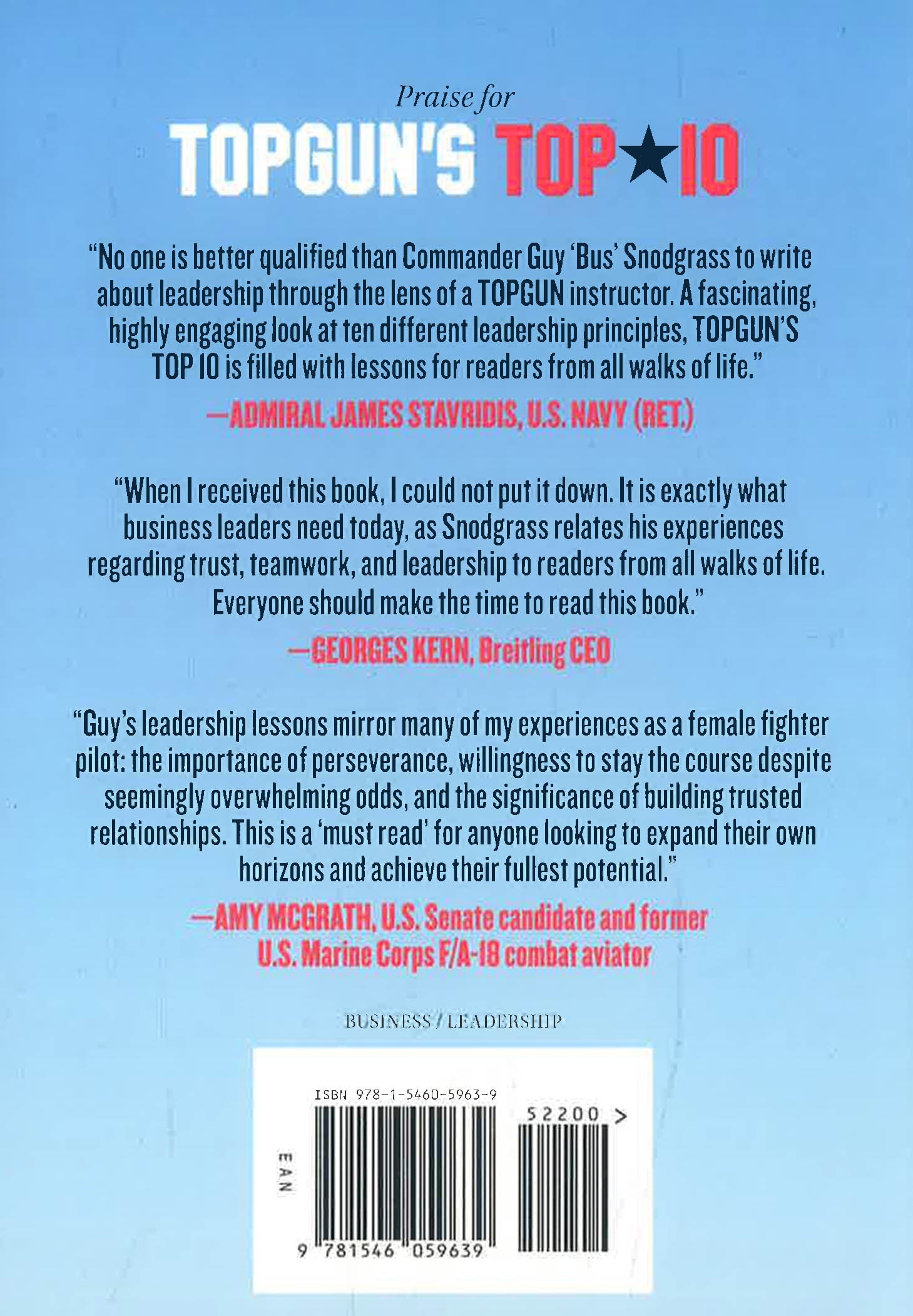 The real-life inspiration for the blockbuster films Top Gun and Top Gun: Maverick, the U.S. Navy Fighter Weapons School trains the top one percent of our nation's fighter pilots. Over the course of twelve weeks, these pilots are drilled on aerial tactics, combat, and skills required to win in any organization. Ordinary people are transformed into world-class leaders. Pilots, like Commander Snodgrass, who remain on staff as TOPGUN instructors, are held to even higher and more demanding standards.